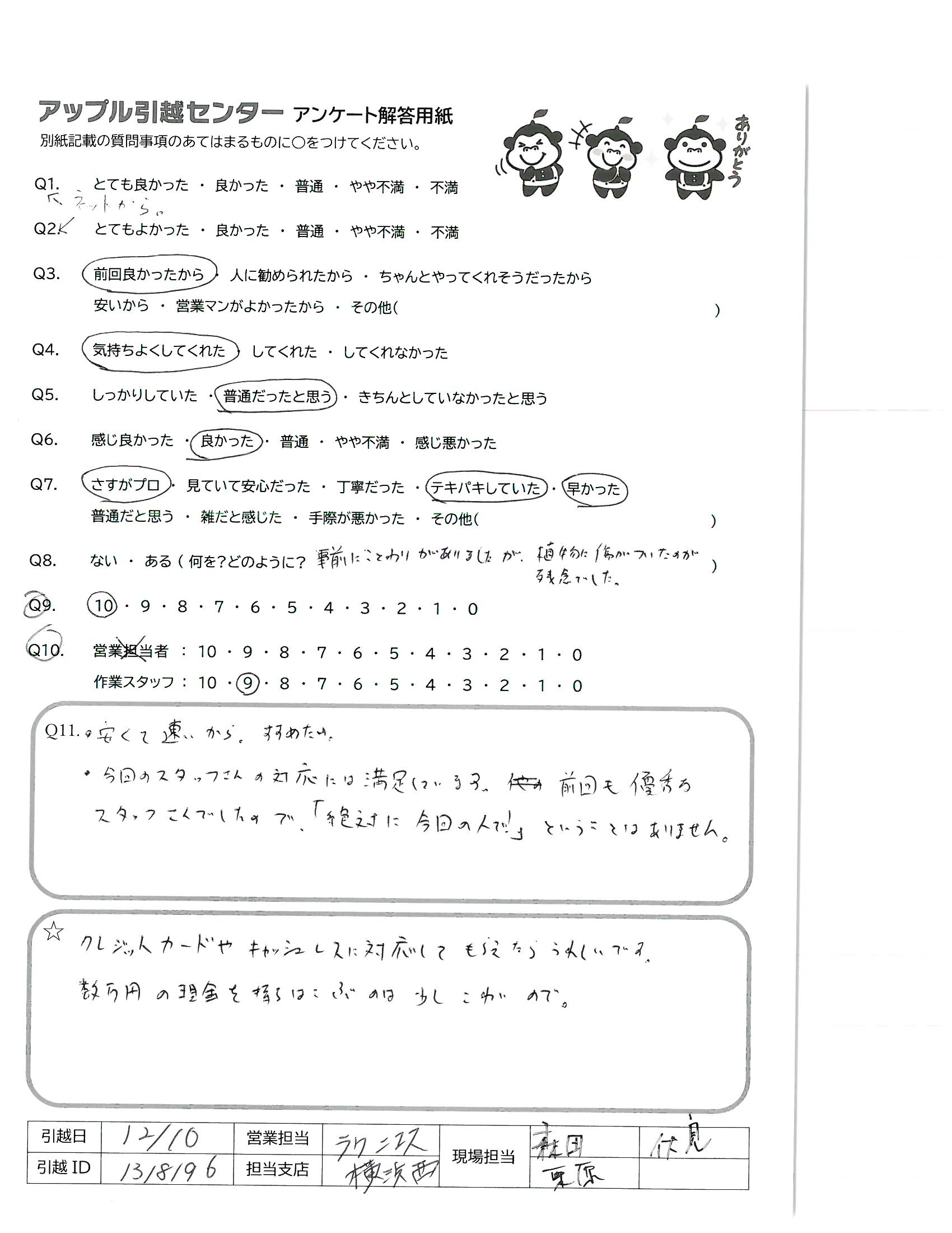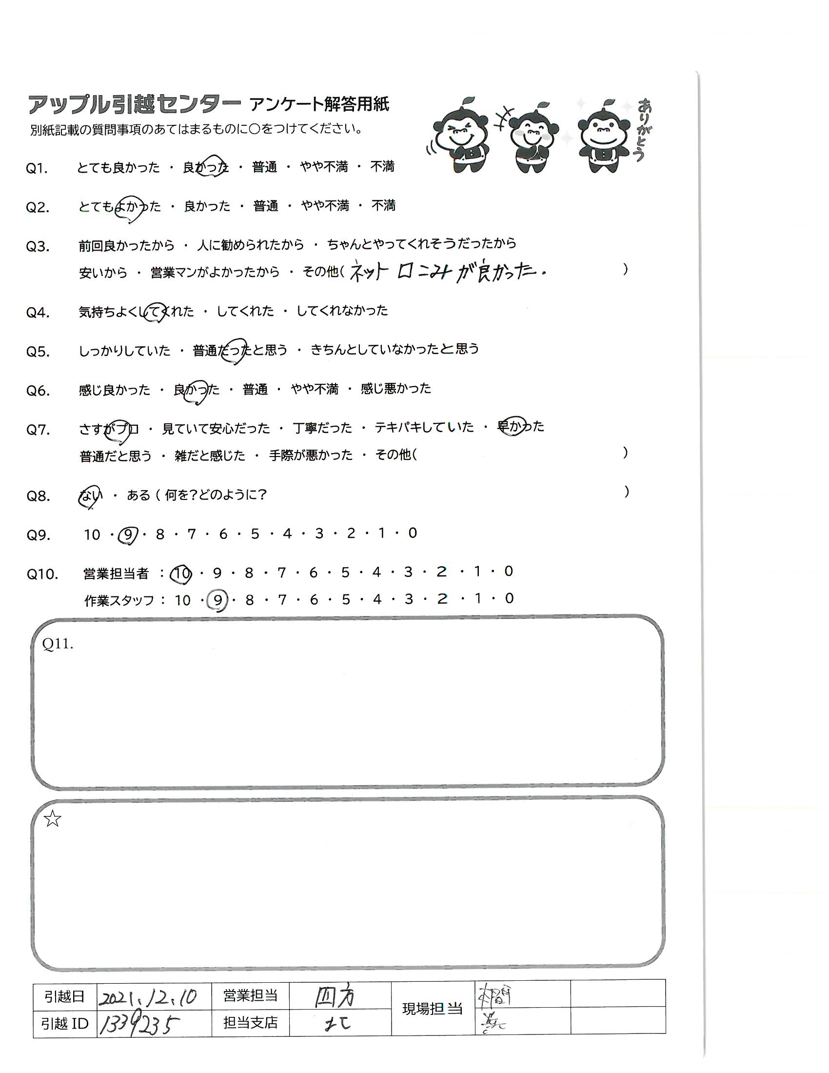 引越し日:2021年12月10日 エリア:神奈川県横浜市港南区