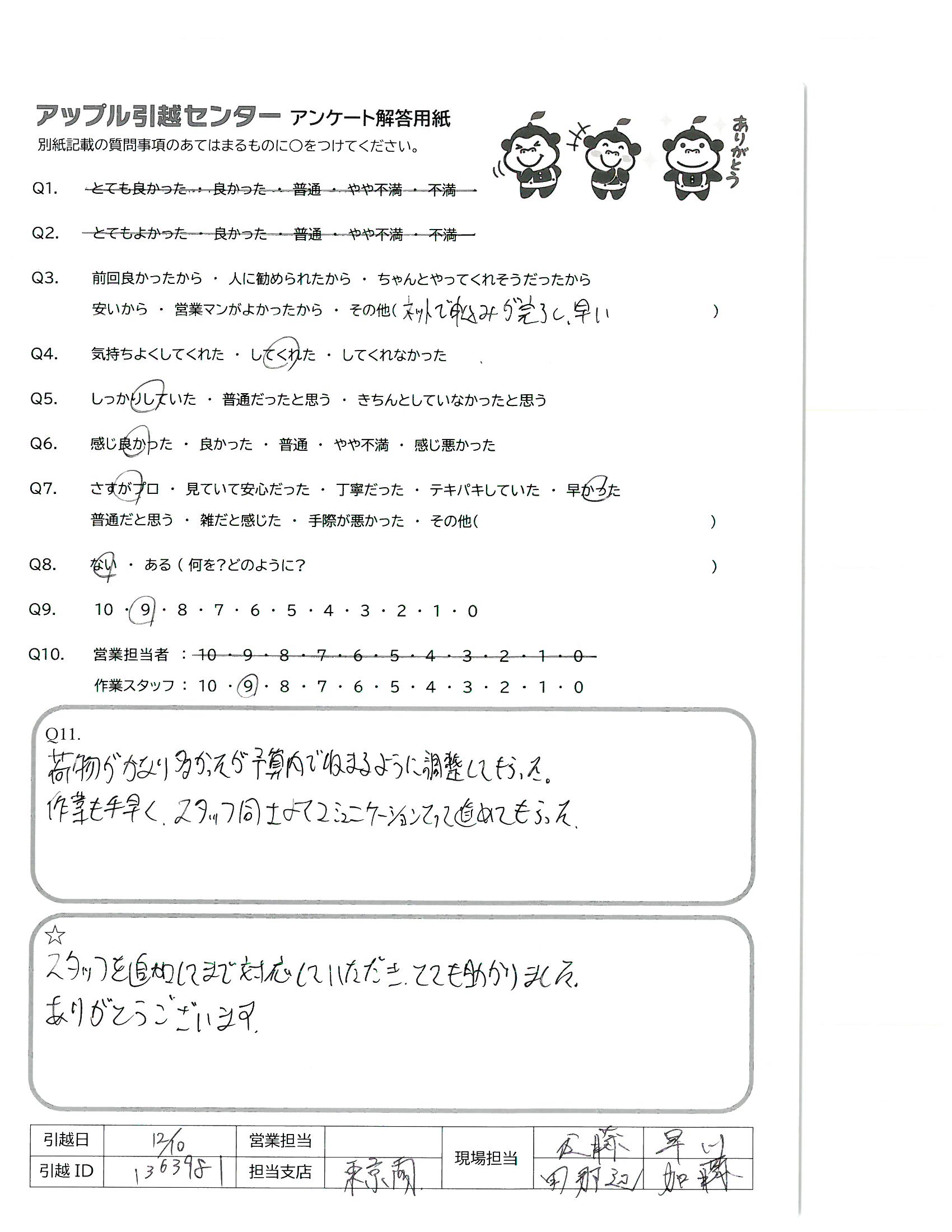 A.荷物がかなり多かったが、予算内で収まるように調整してもらった。 作業も手早く、スタッフ同士よくコミュニケーションをとって進めてもらった。