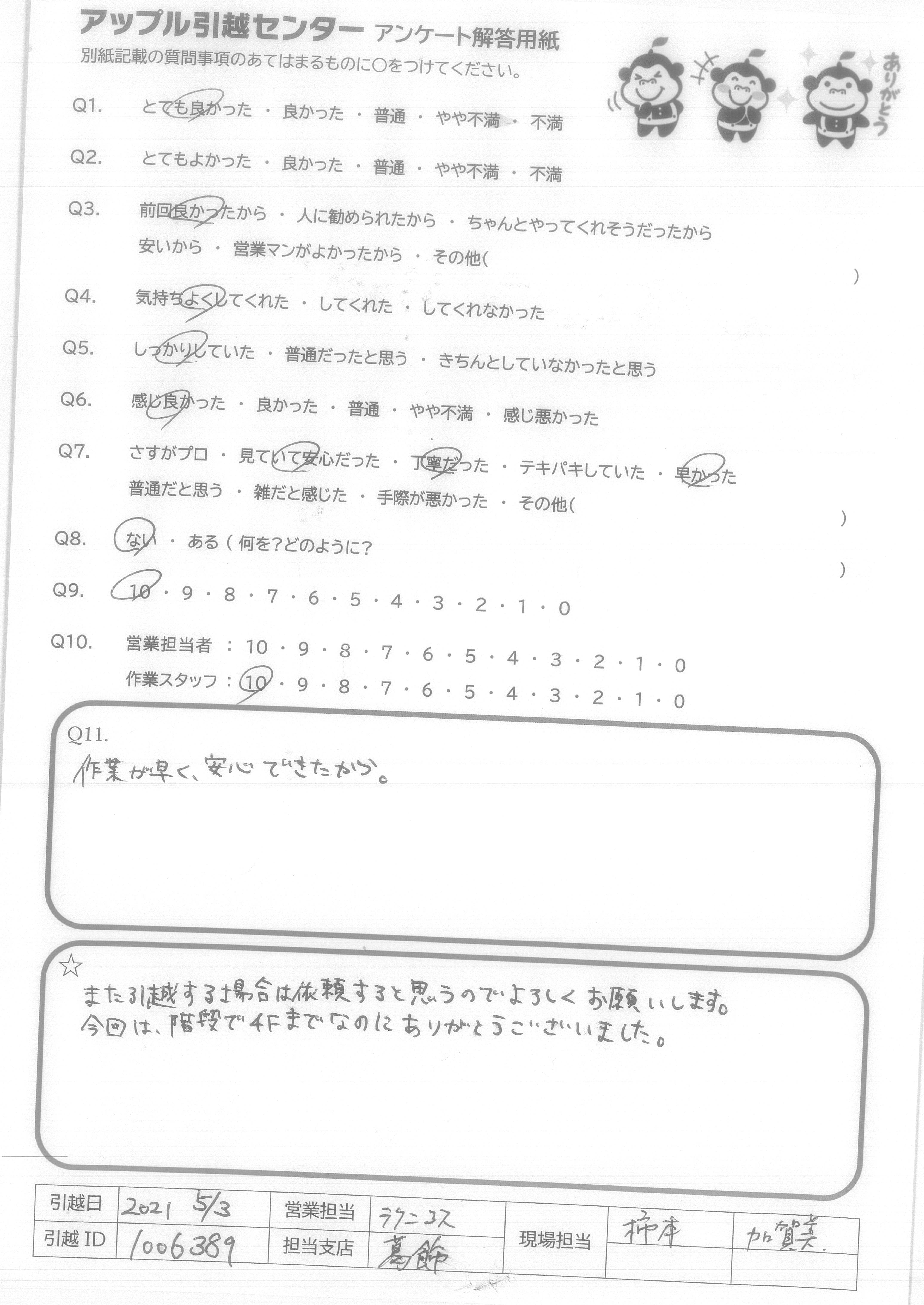A.また引越する場合は依頼すると思うのでよろしくお願いします。 今回は、階段で4Fまでなのにありがとうございました。