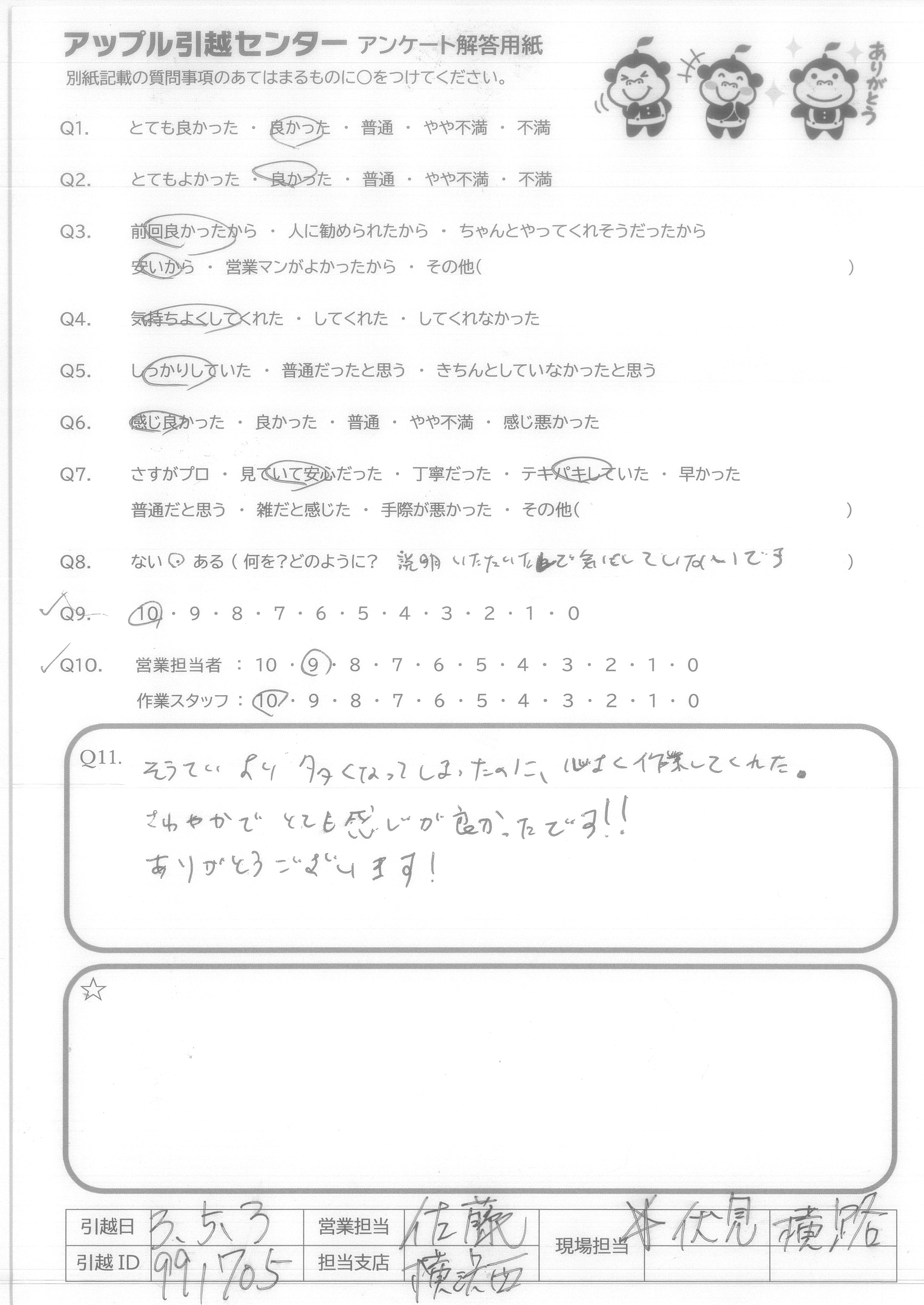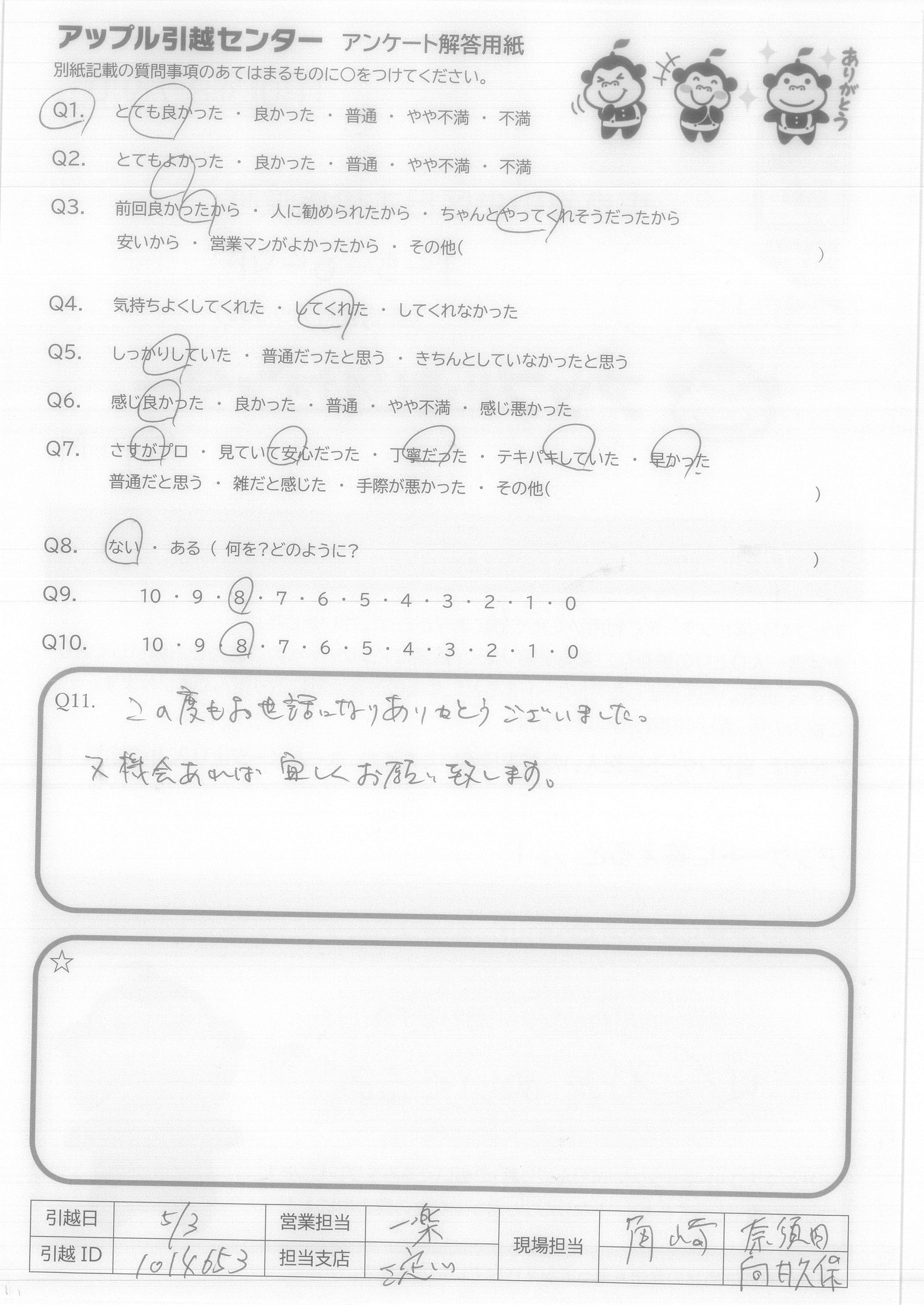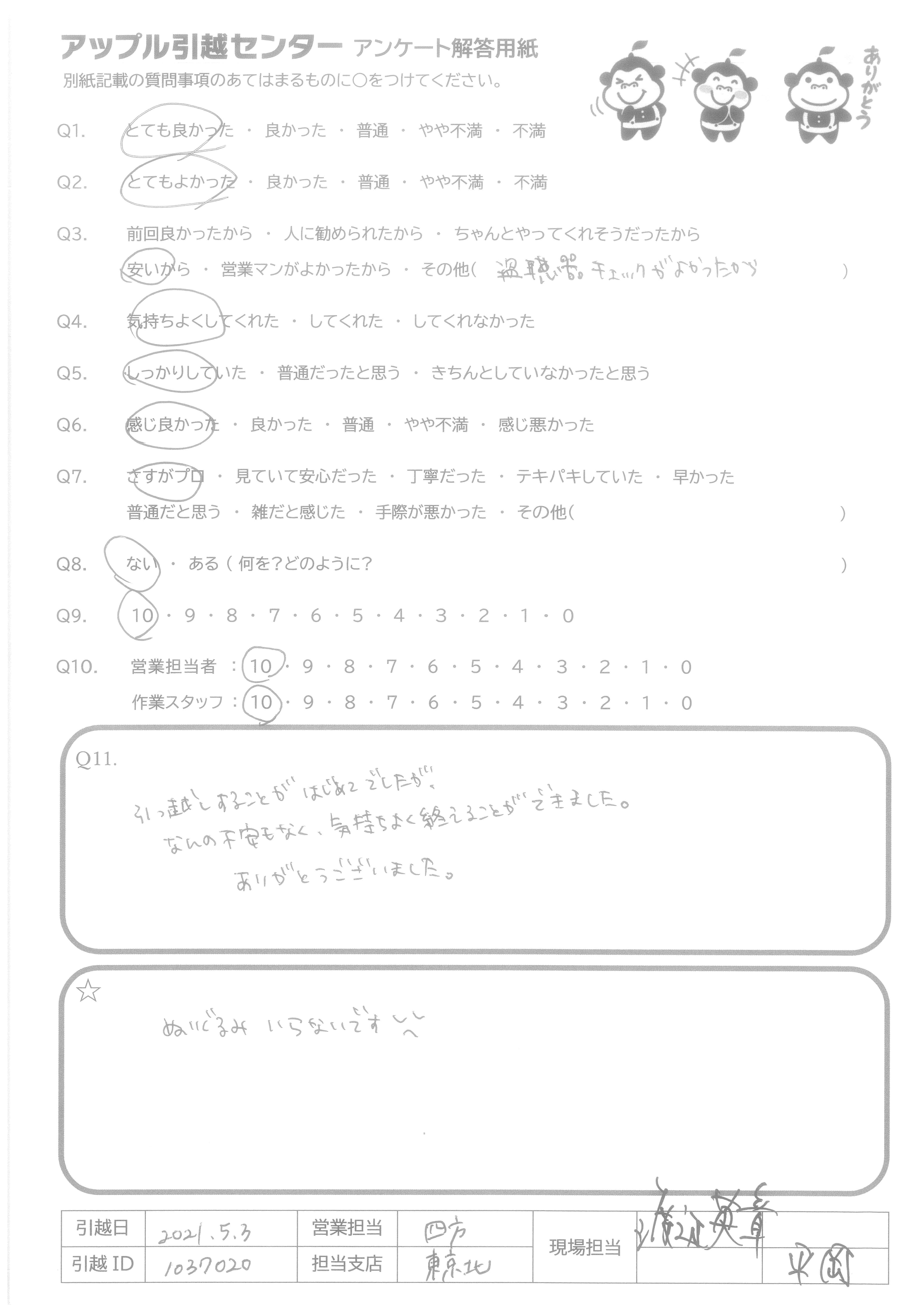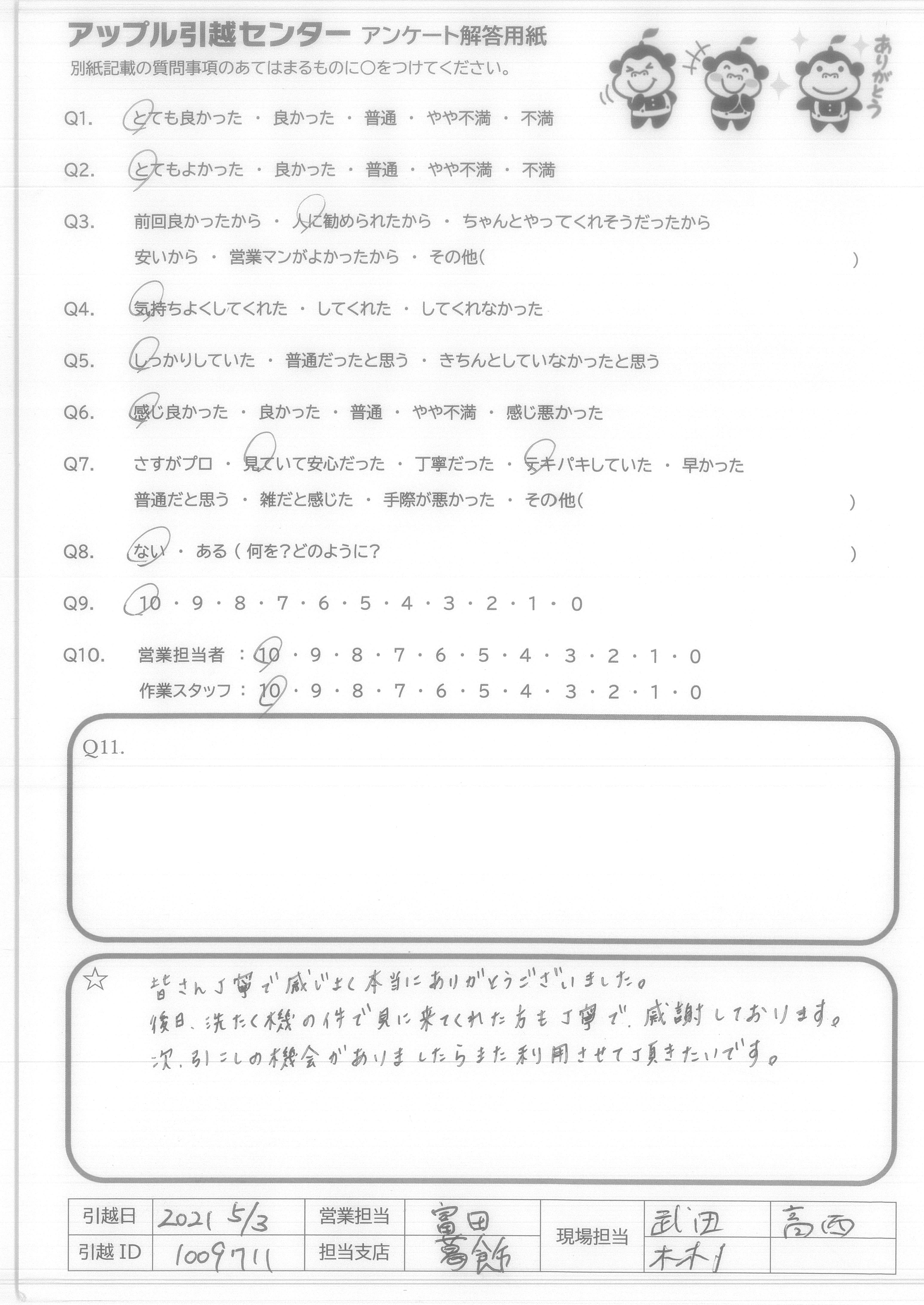 A.皆さん丁寧で感じよく本当にありがとうございました。 後日、洗たく機の件で見に来てくれた方も丁寧で、感謝しております。 次、引こしの機会がありましたらまた利用させて頂きたいです。