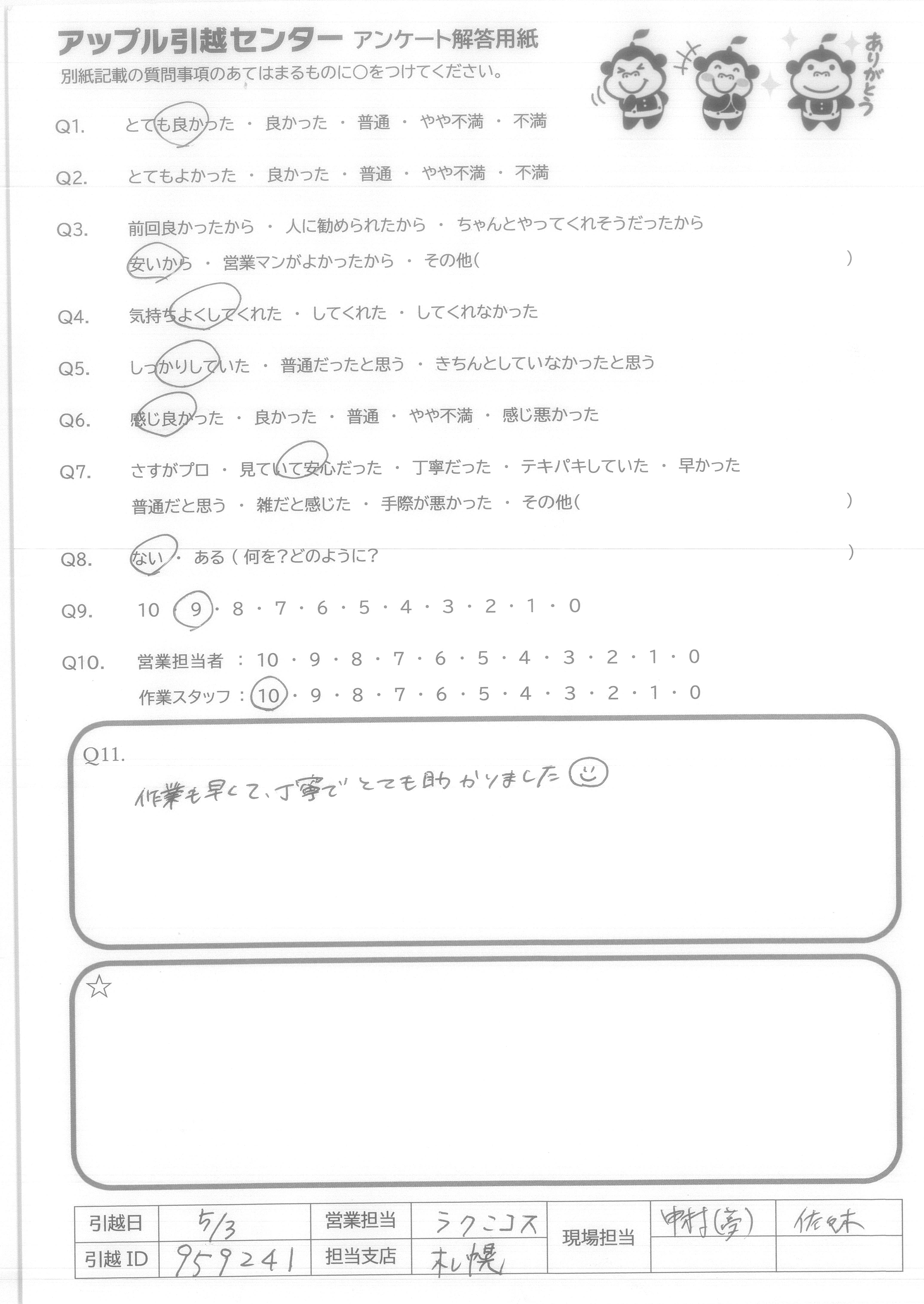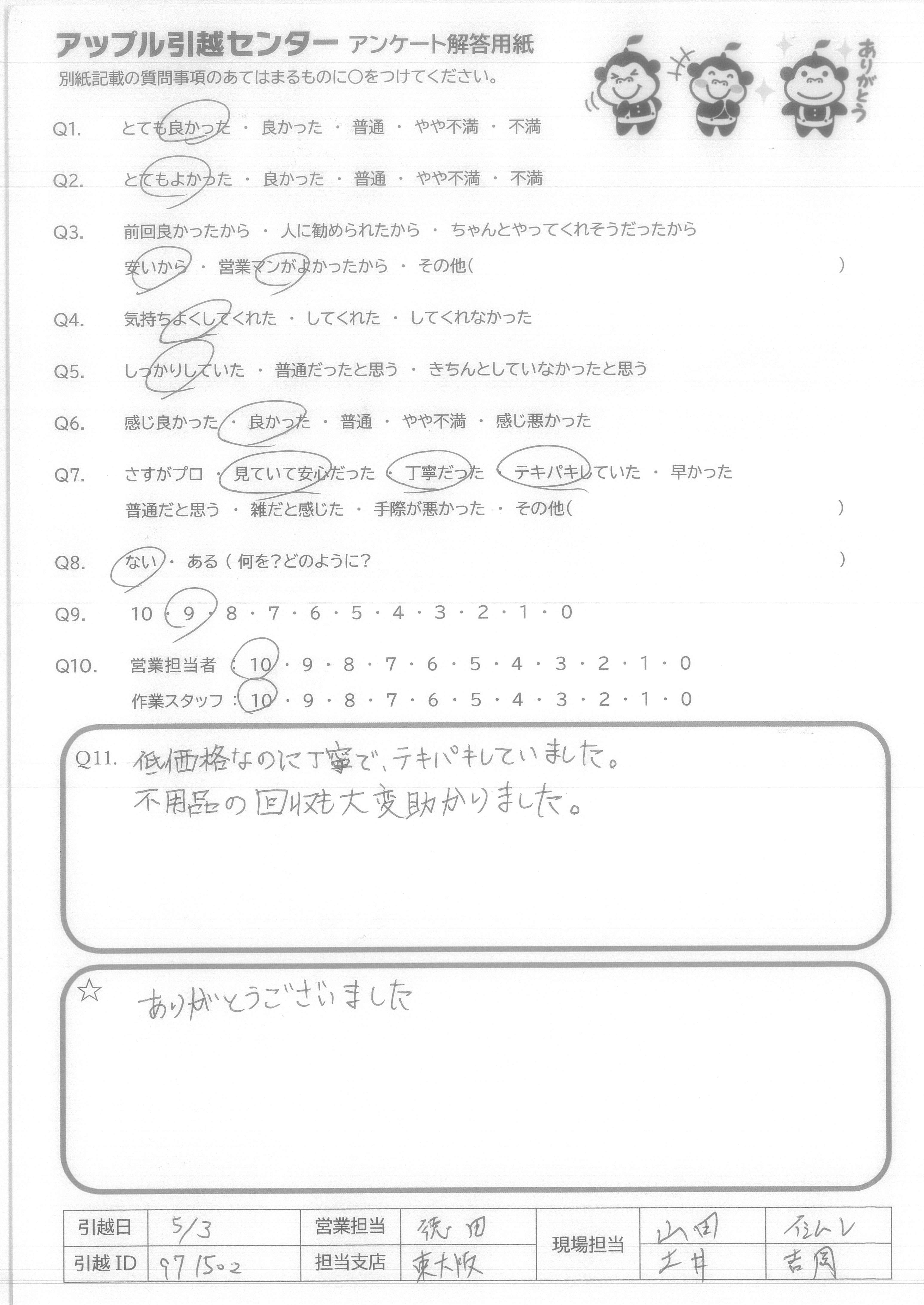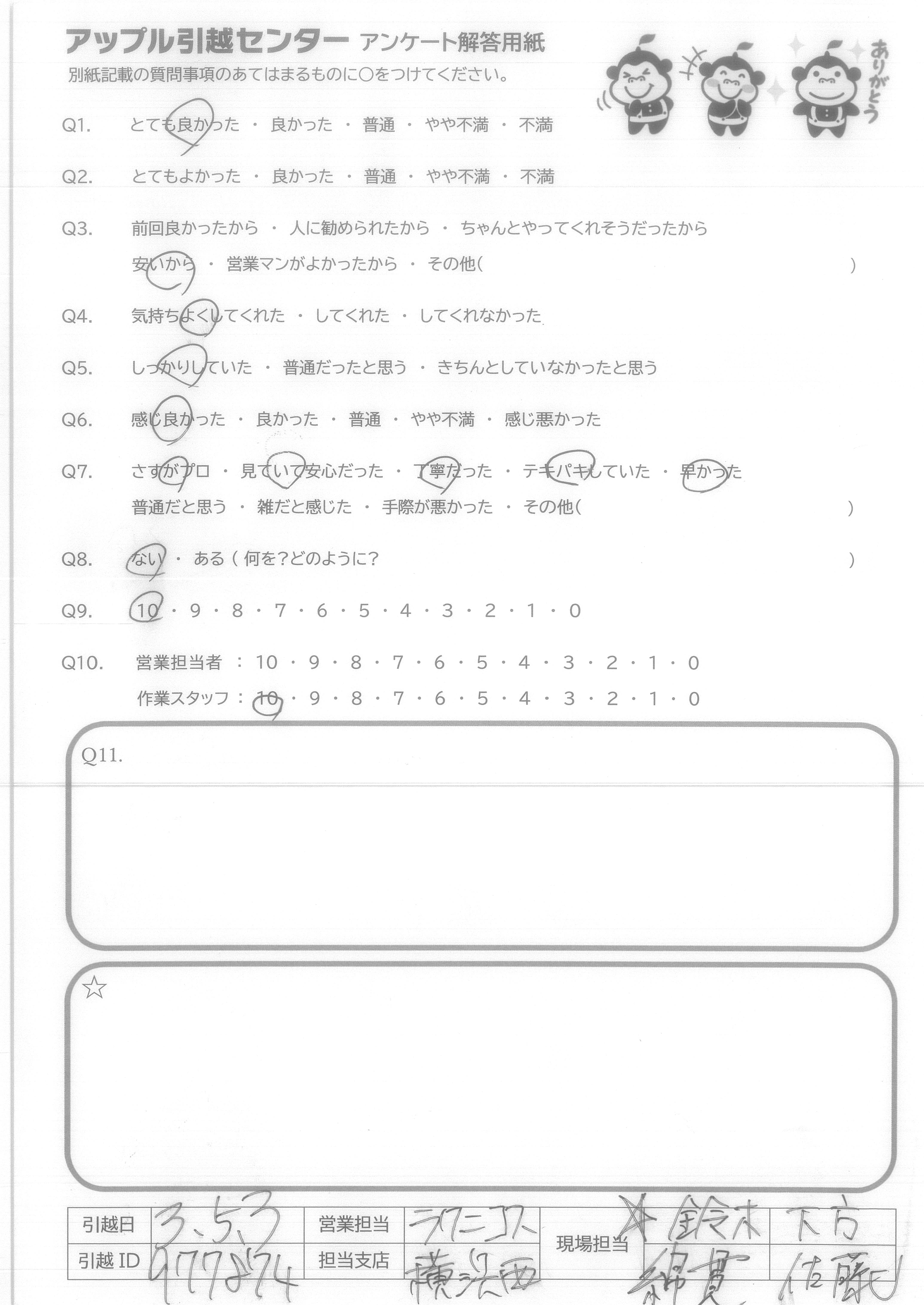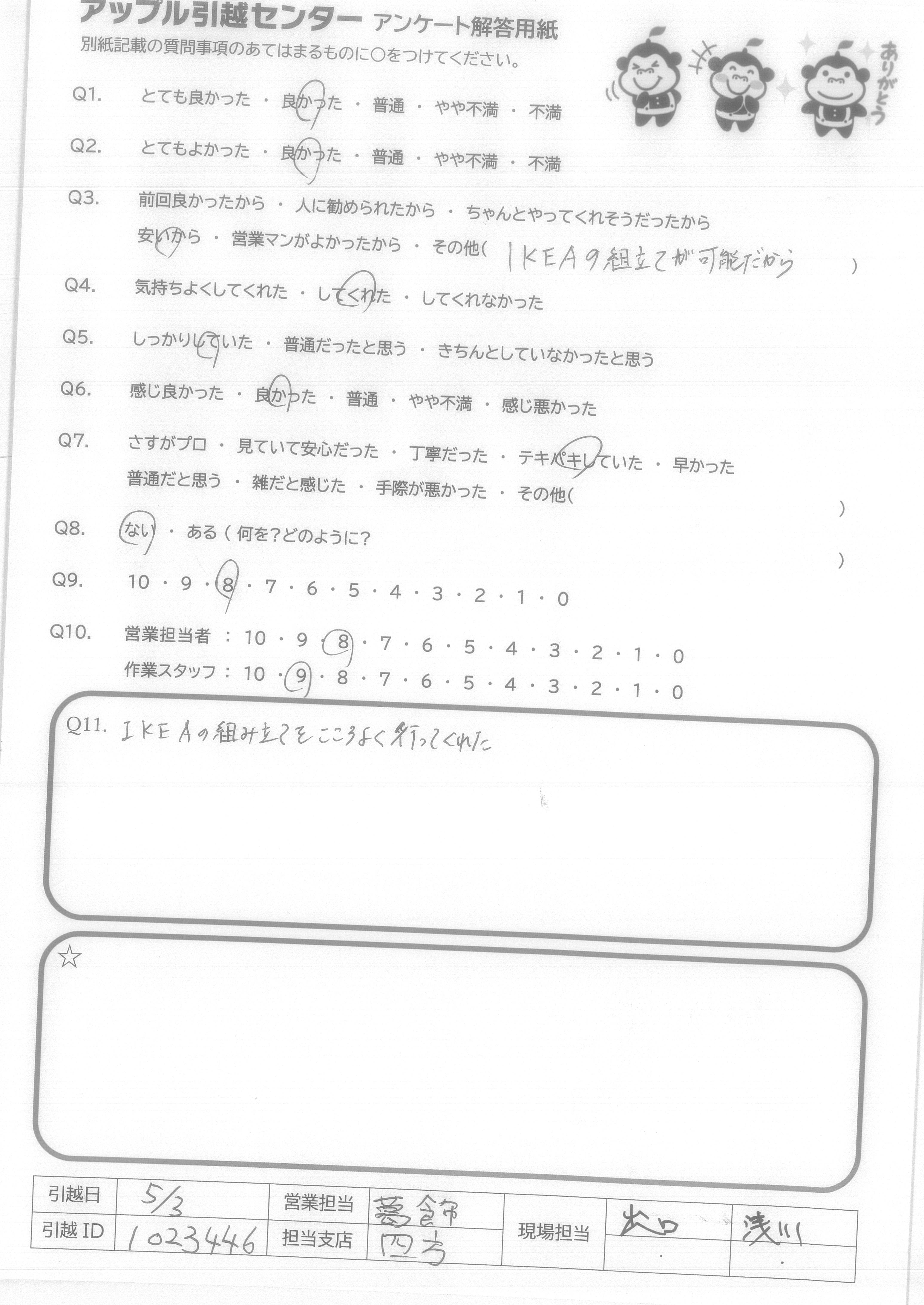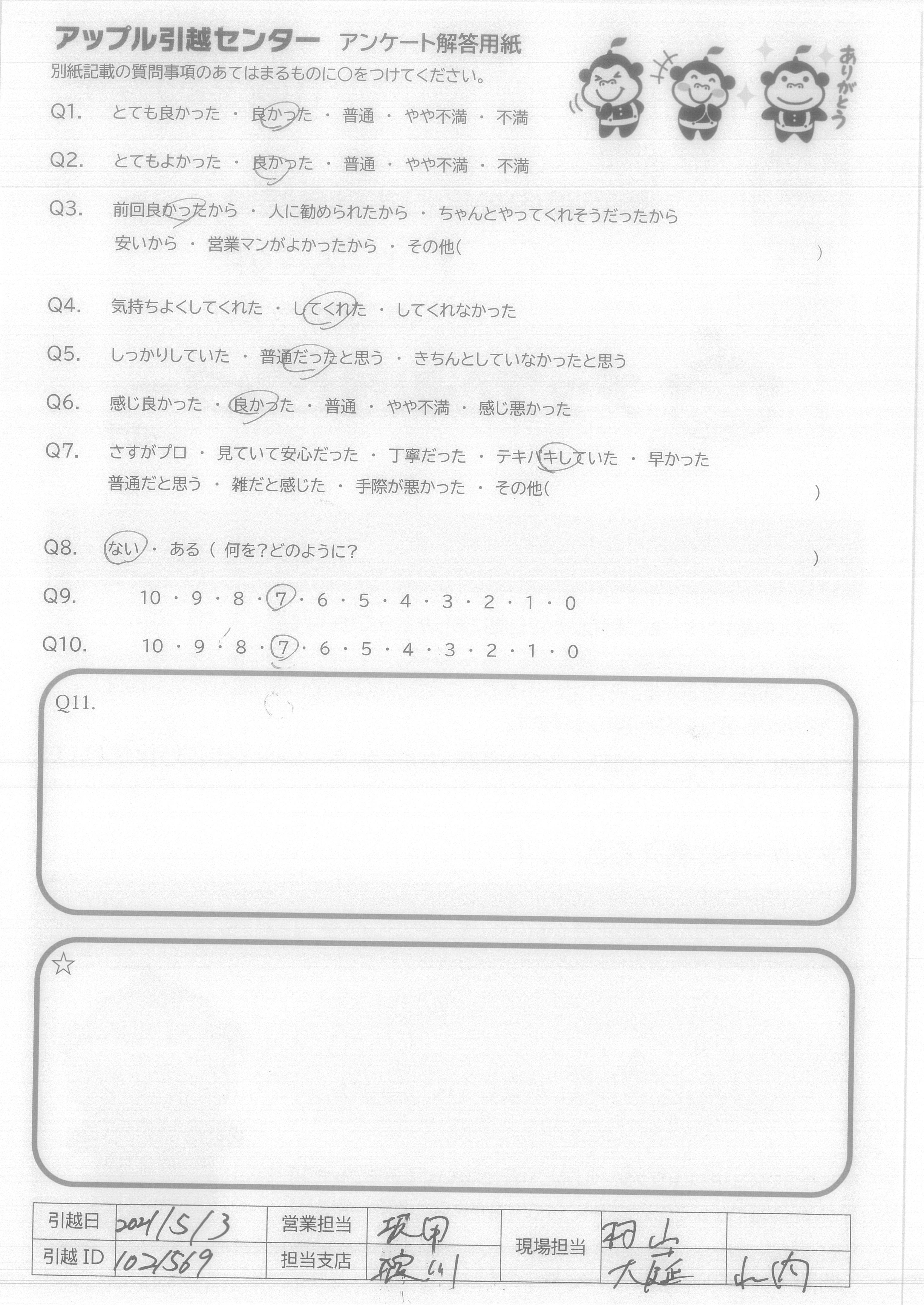 A.皆さん丁寧で感じよく本当にありがとうございました。 後日、洗たく機の件で見に来てくれた方も丁寧で、感謝しております。 次、引こしの機会がありましたらまた利用させて頂きたいです。