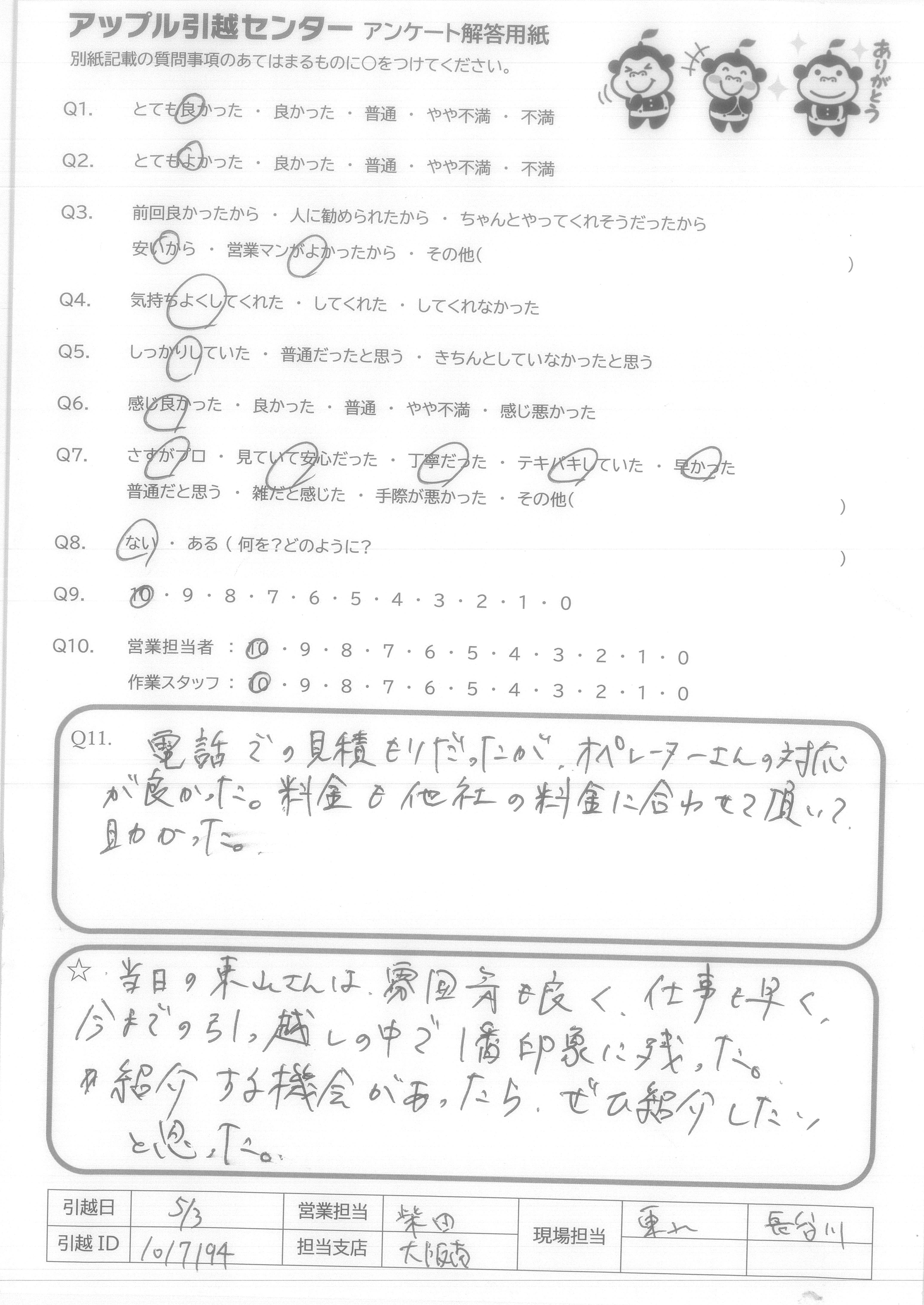 A.当日の東山さんは雰囲気も良く、仕事も早く、今までの引っ越しの中で1番印象に残った。 紹介する機会があったら、ぜひ紹介したいと思った。