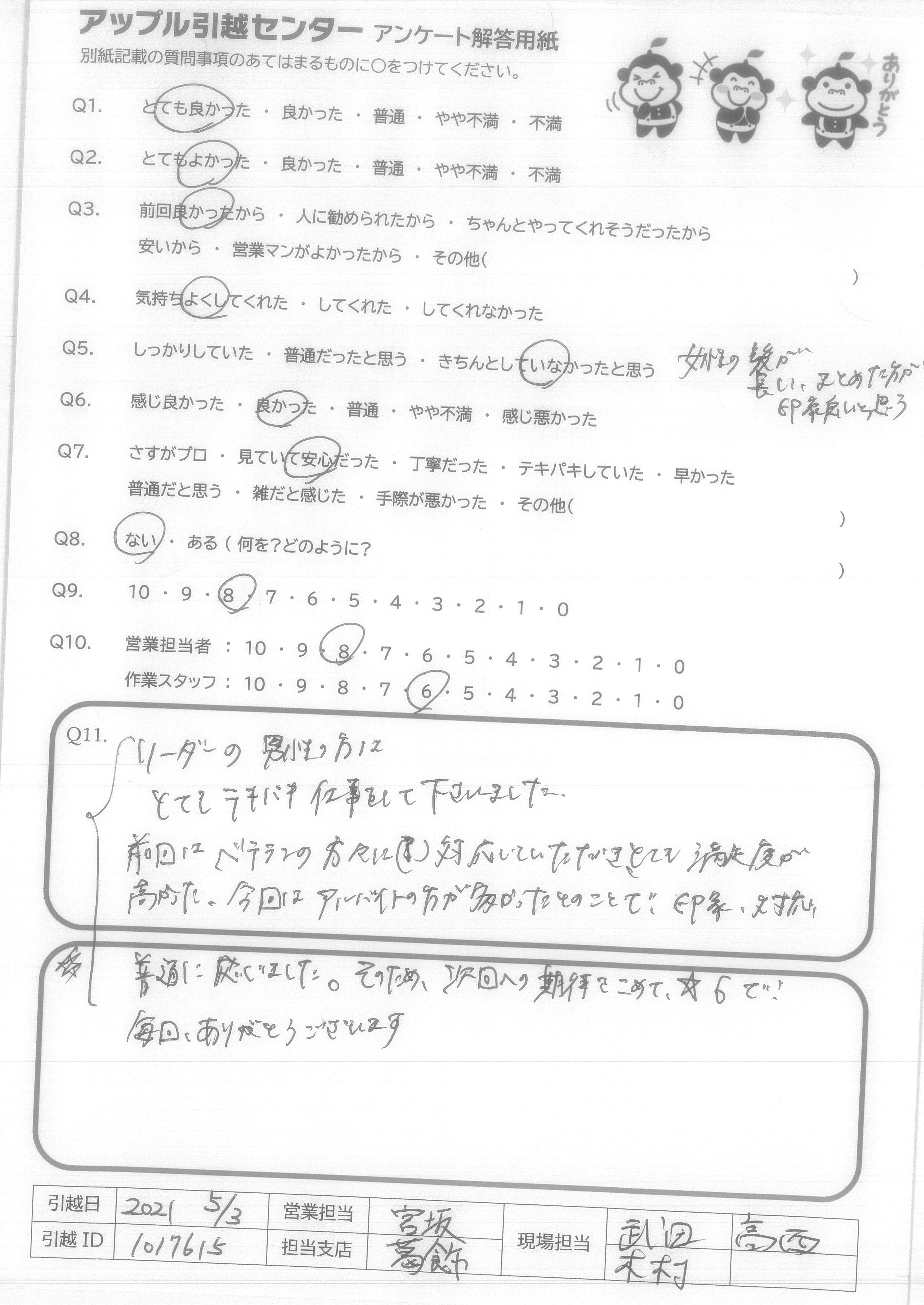 A.リーダーの男性の方にとてもテキパキ仕事をして下さいました。 前回はベテランの方々に対応していただきとても満足度が高かった。今回はアルバイトの方が多かったとのことで、印象・対応普通に感じました。そのため、次回への期待をこめて、☆6で!