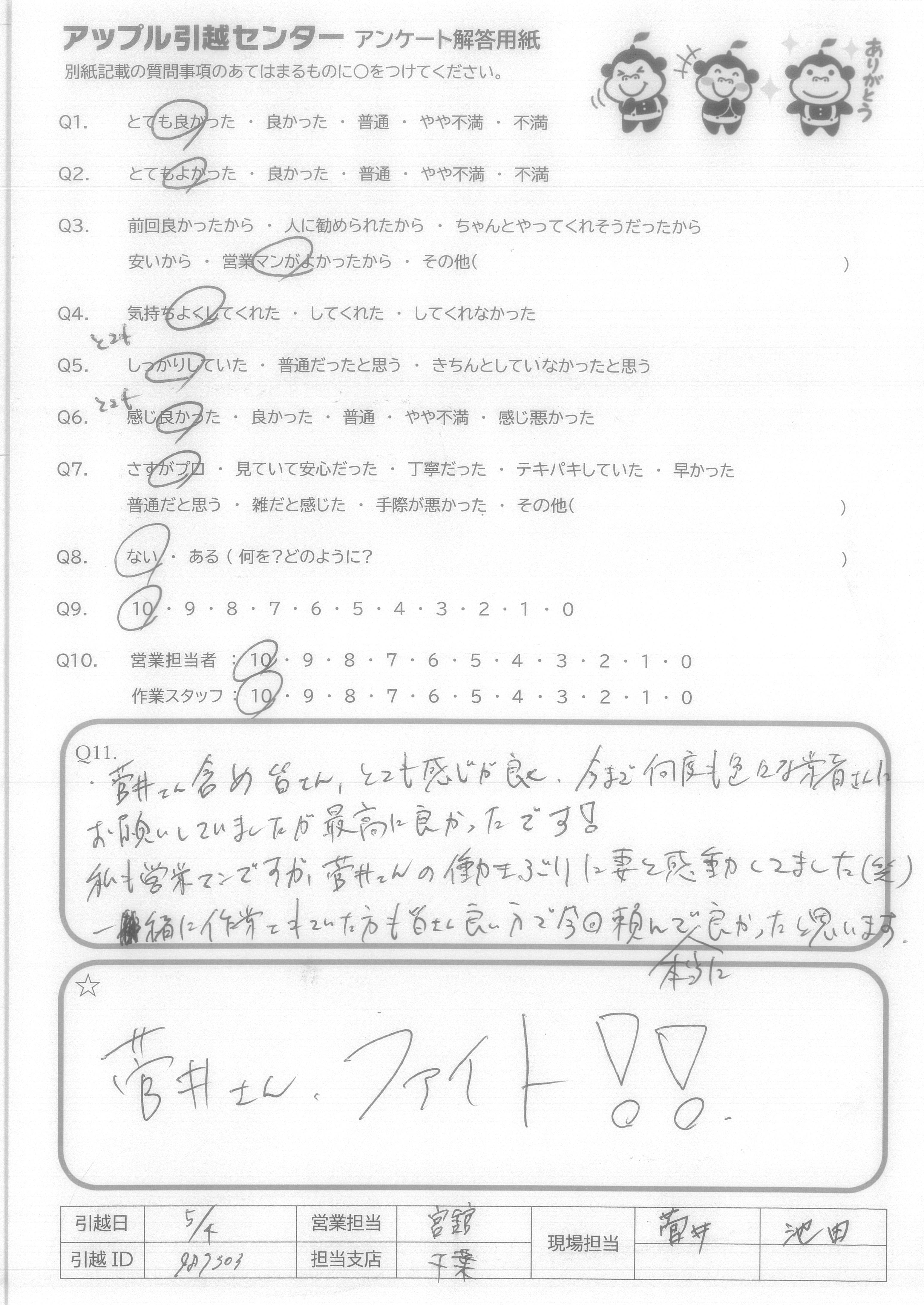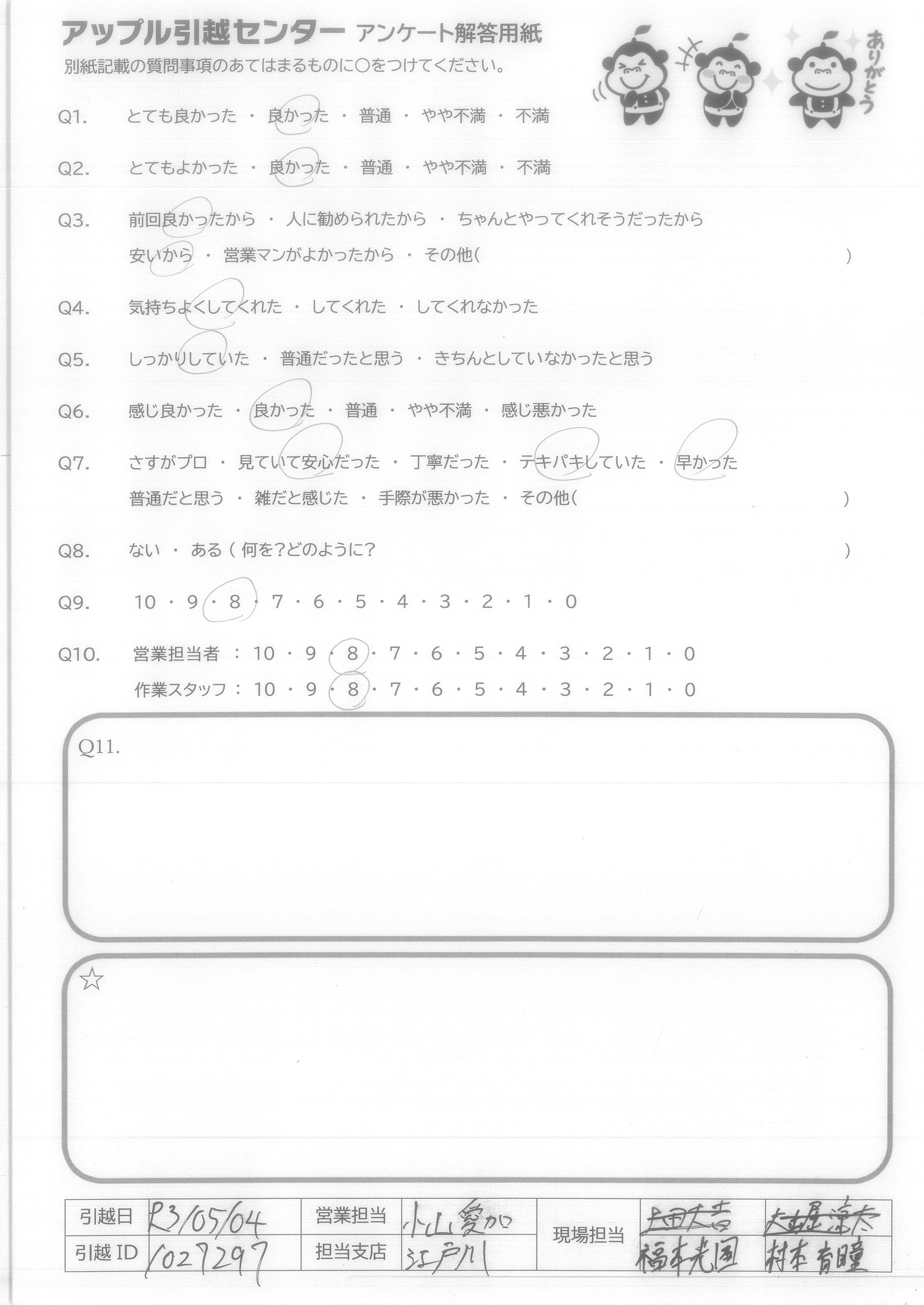 A.引っ越し屋さんにお願いするのは初めてで、少し緊張と不安がありましたが、最初の電話連絡の時からとても感じが良くて、テキパキ動いて下さり、元々あったいらない段ボールも回収して下さいました。色々とご配慮して頂いてとても感謝しております。アップルさんにお願いして良かったです。