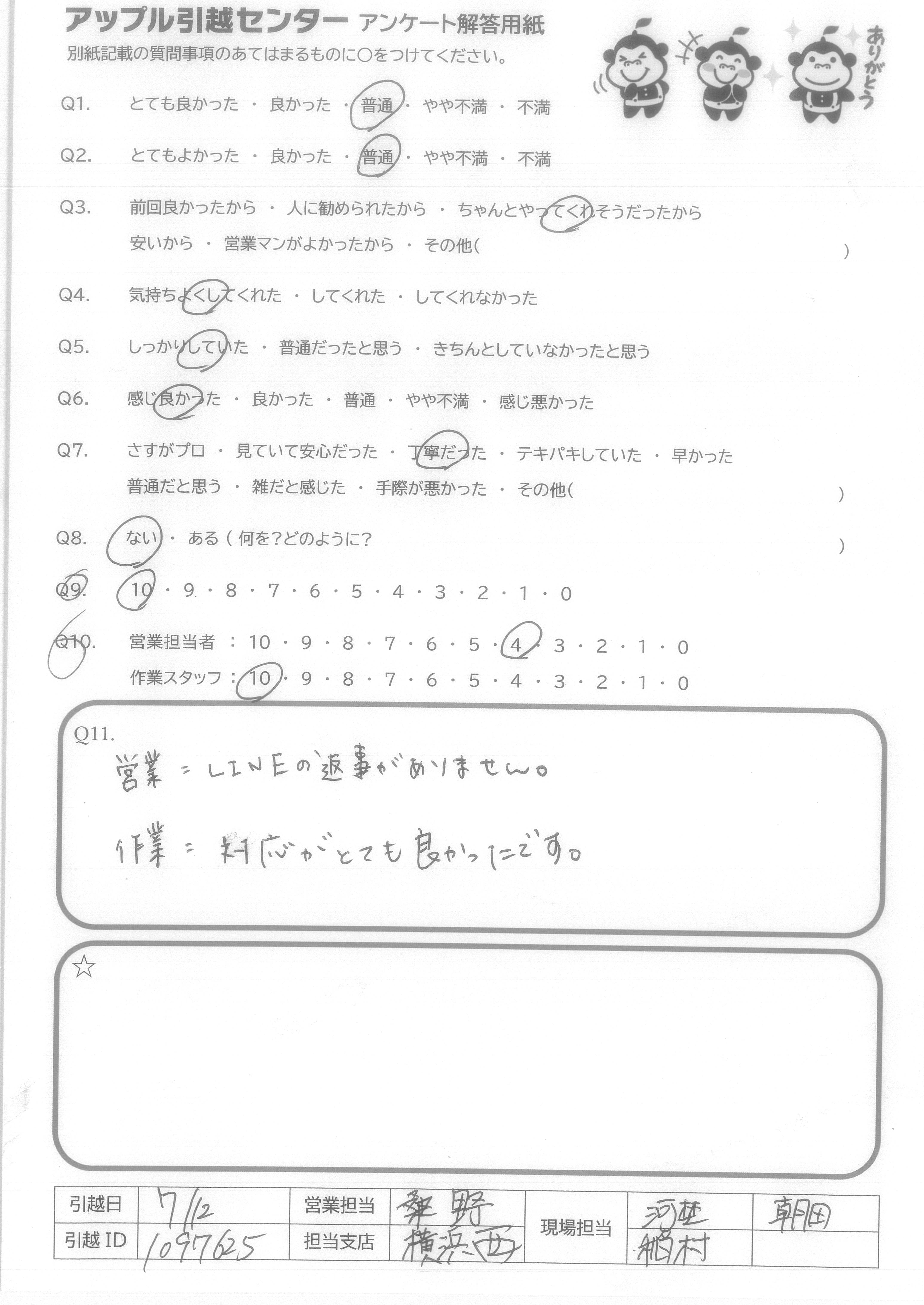 A.営業:LINEの返事がありません。 作業:対応がとても良かったです。