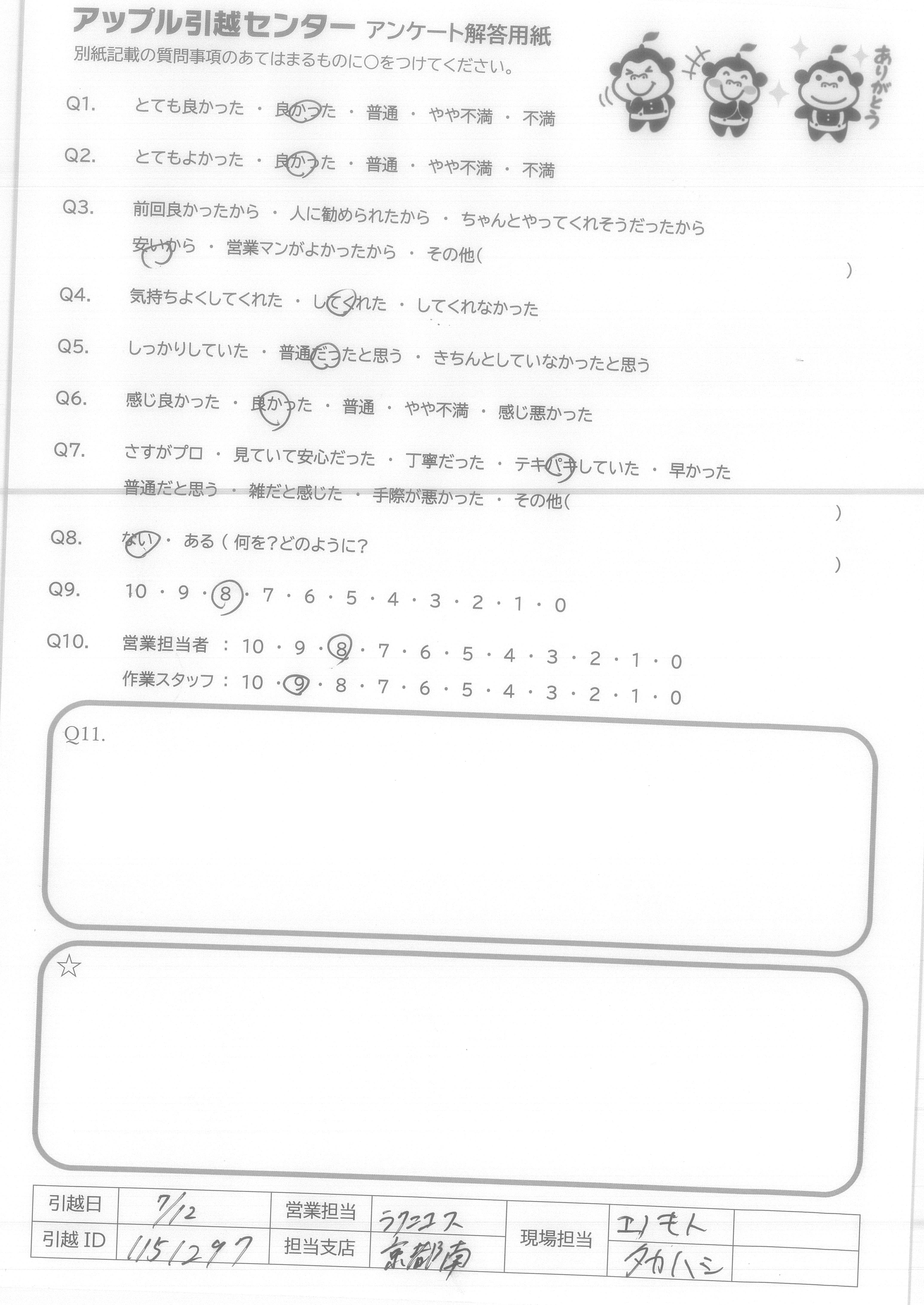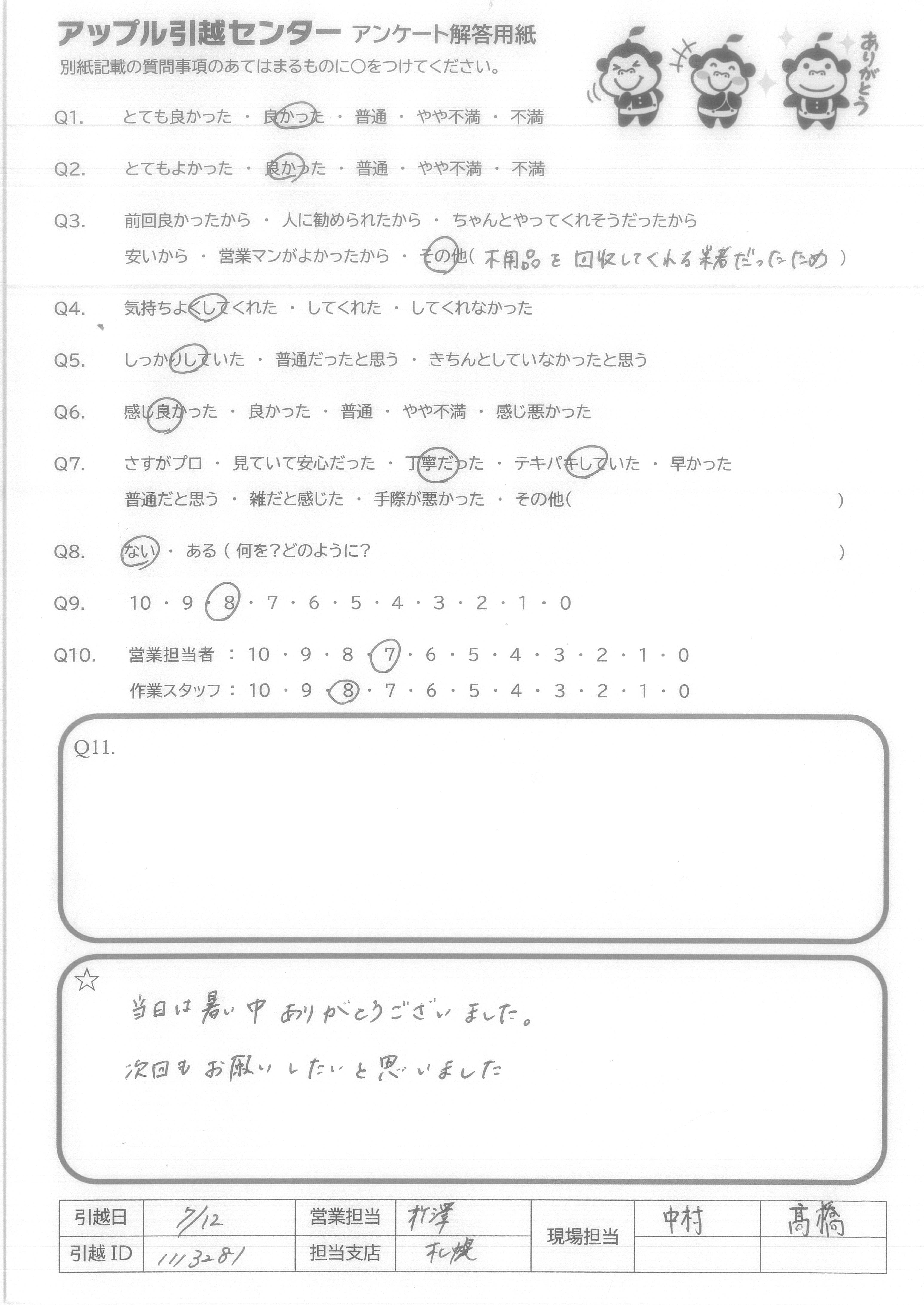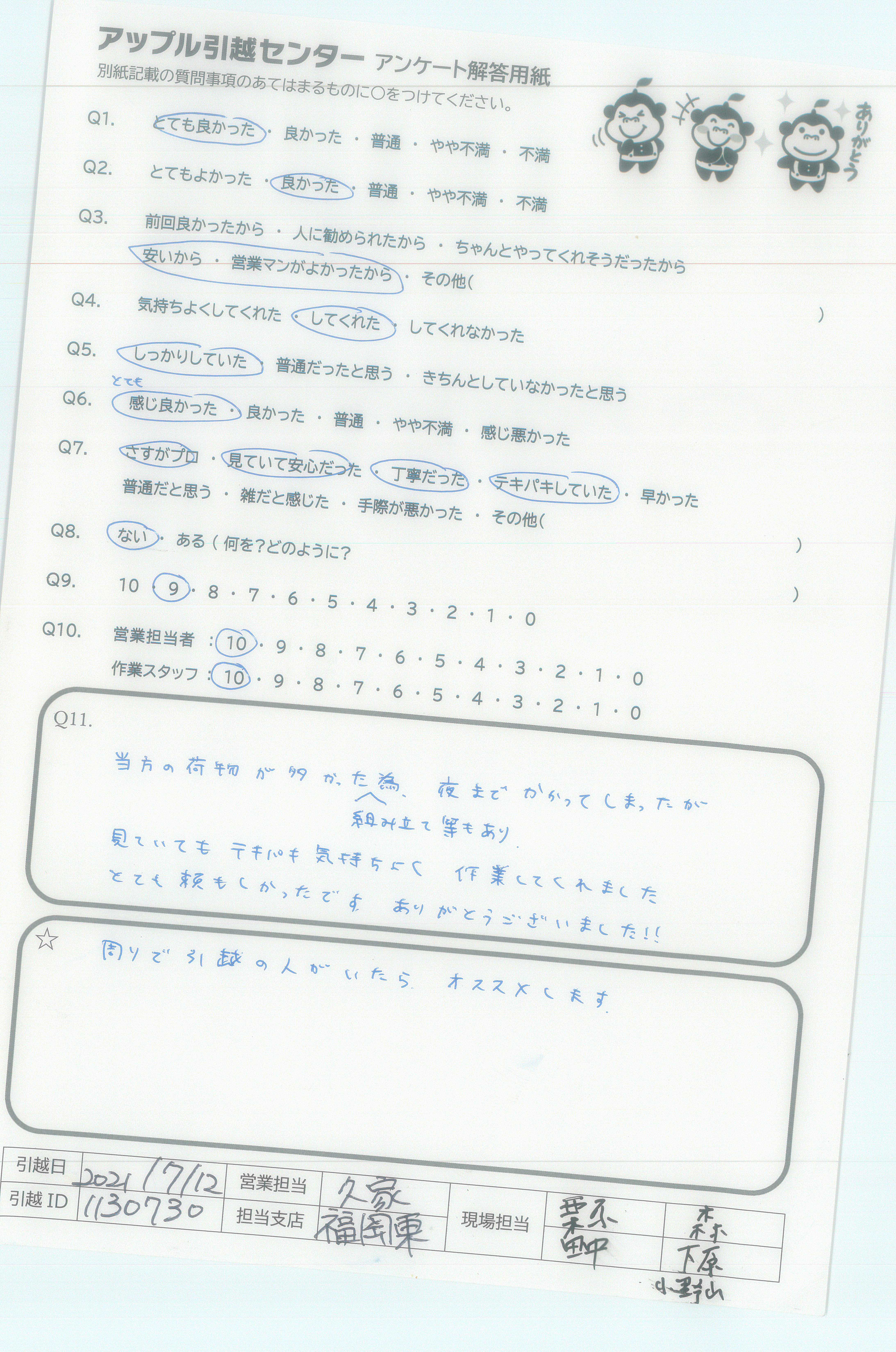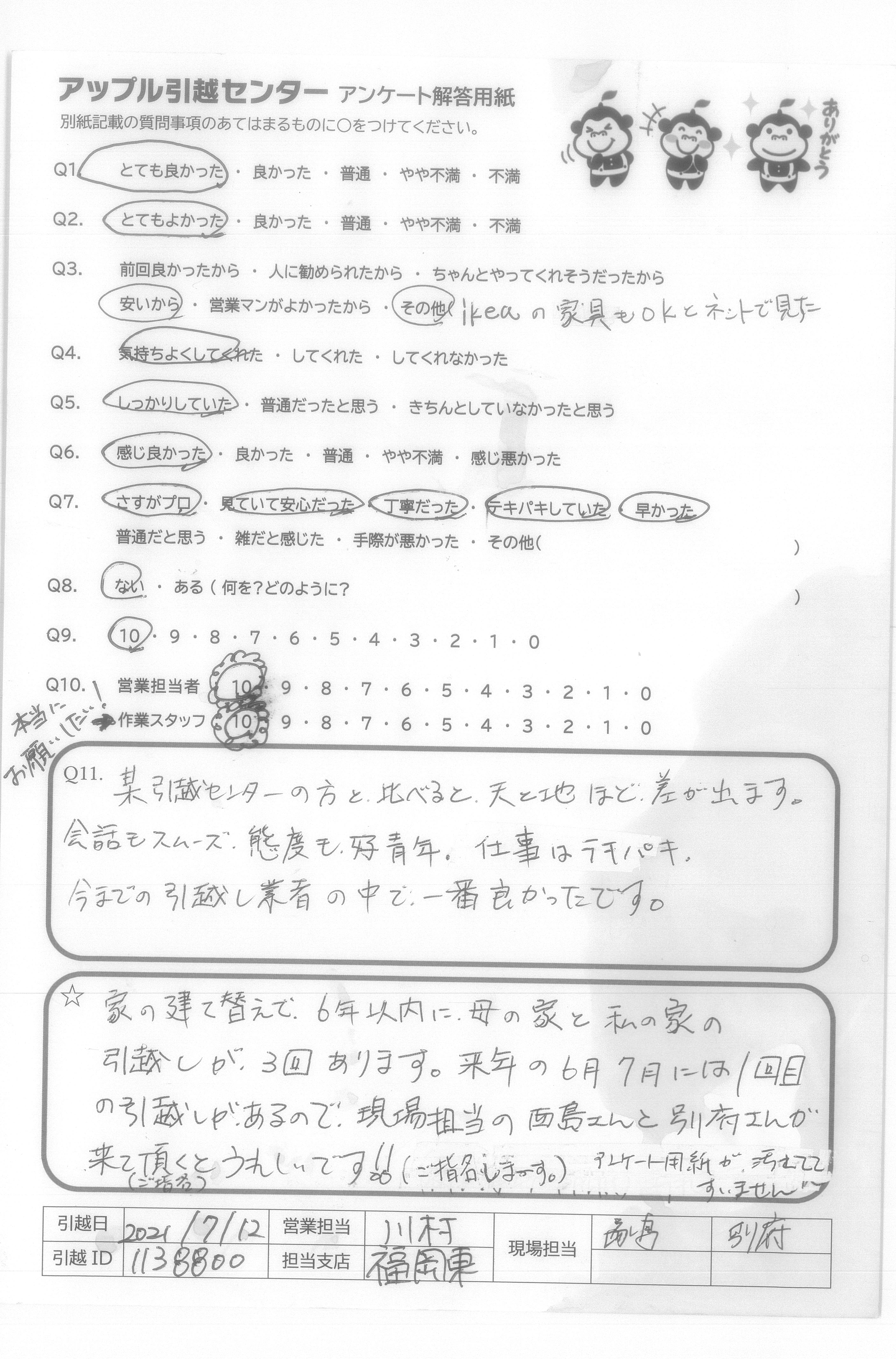 A.家の建て替えで6年以内に、母の家と私の家の引越しが3回あります。来年の6月7月には1回目の引越しがあるので、現場担当の西島さんと別府さんが来て頂くとうれしいです!!(ご指名しま~す。)アンケート用紙が汚れててすいません。