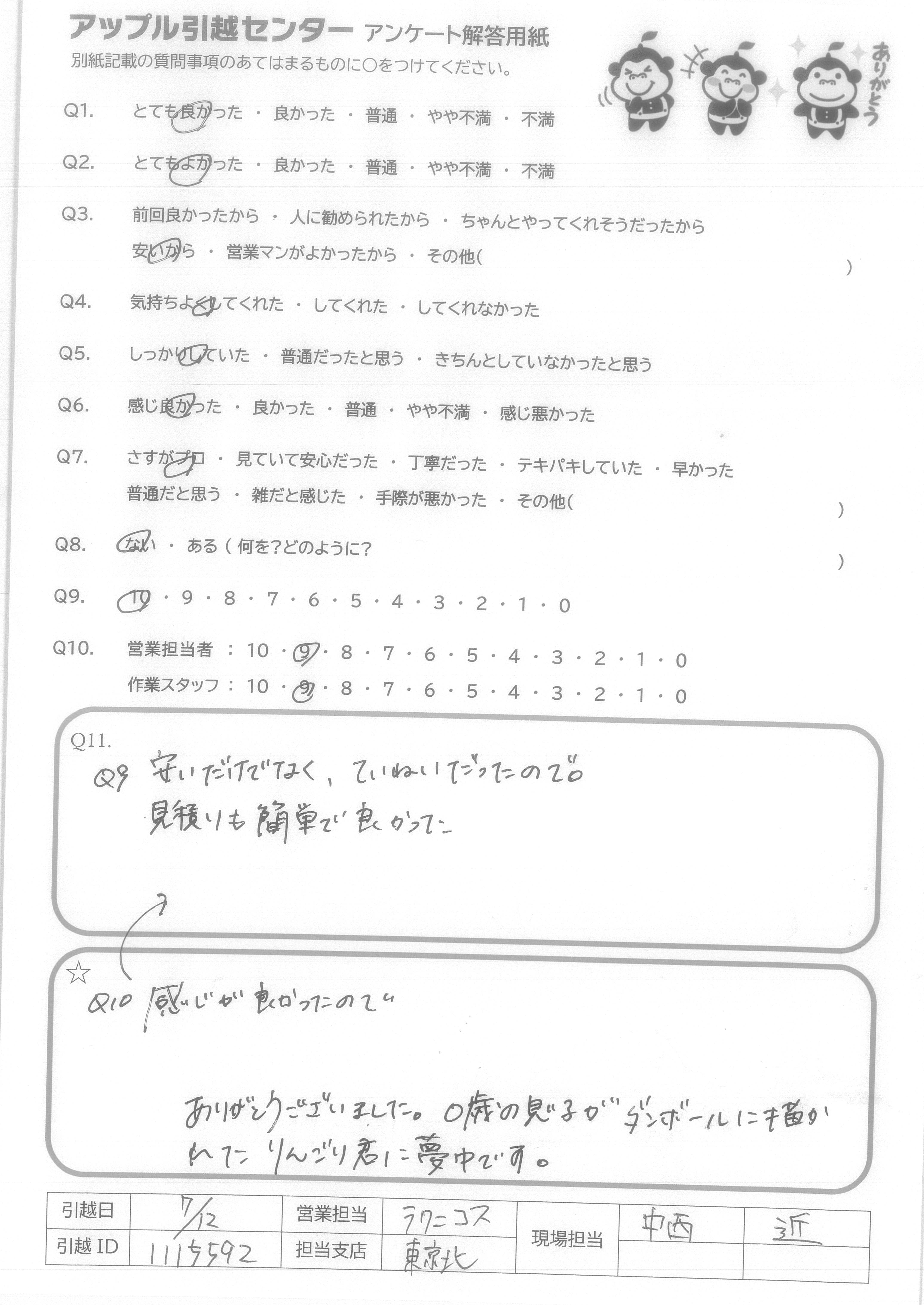 A.Q9 安いだけでなく、ていねいだったので。 見積りも簡単で良かった Q10感じが良かったので