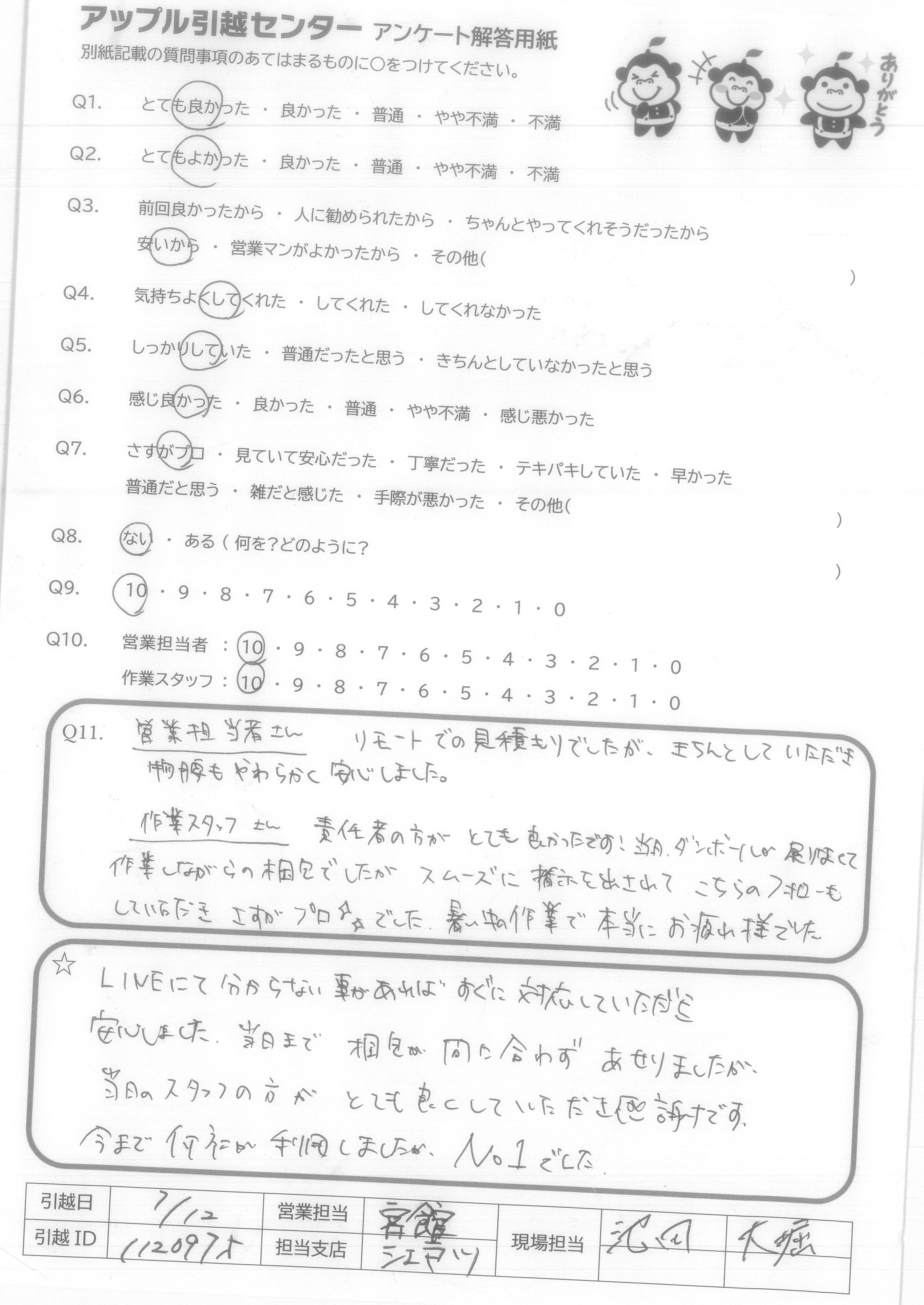A.営業担当者さん リモートでの見積もりでしたが、きちんとしていただき物腰もやわらかく安心しました。 作業スタッフさん 責任者の方がとても良かったです!当日、ダンボールが足りなくて作業しながらの梱包でしたがスムーズに指示を出されてこちらのフォローもしていただき、さすがプロでした。暑い中の作業で本当にお疲れ様でした。