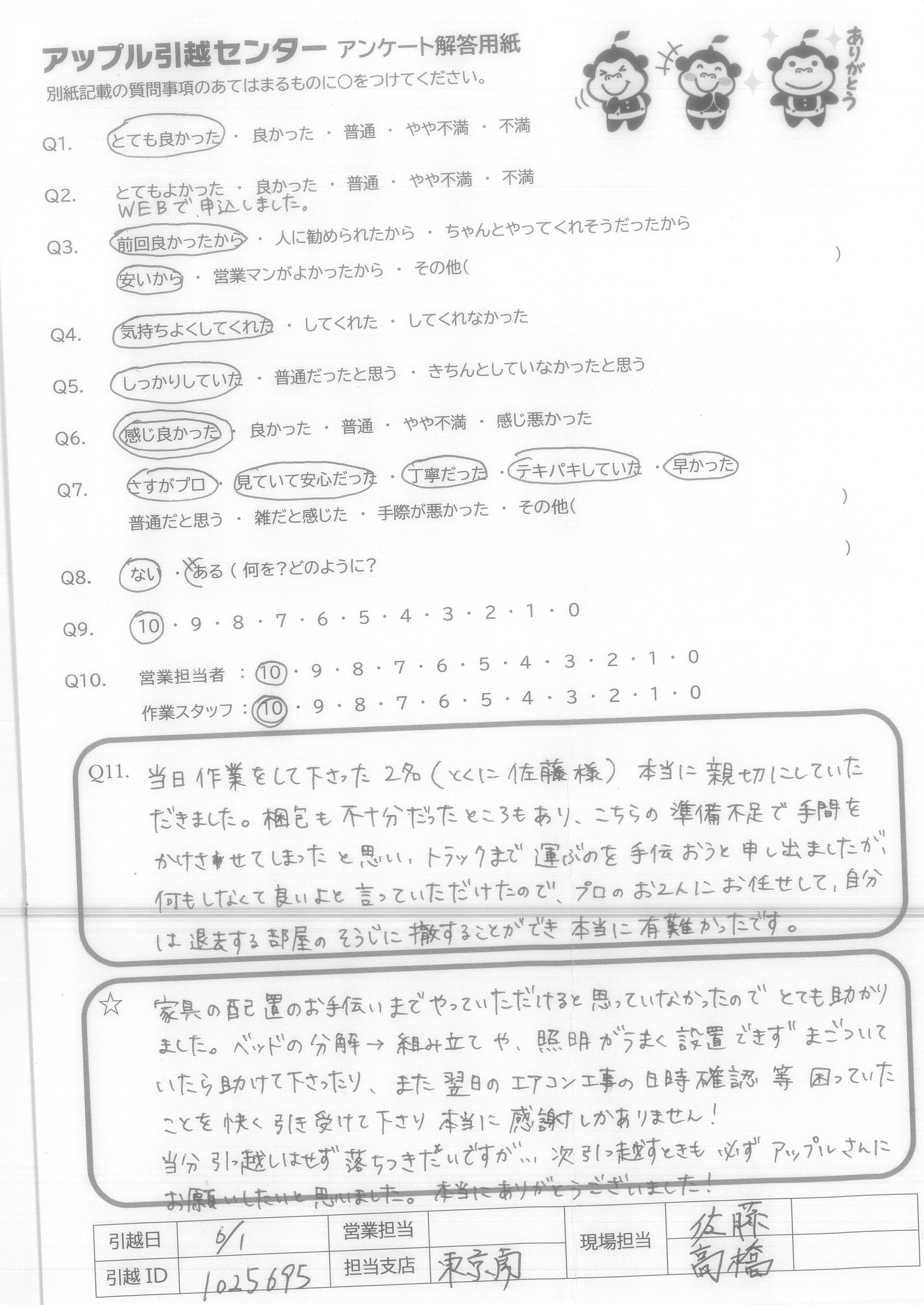 A.今まで 委託した引っ越し業者のなかで、 アップルさんが ダントツでした。 また機会がありましたら、 リピートしたいです。
