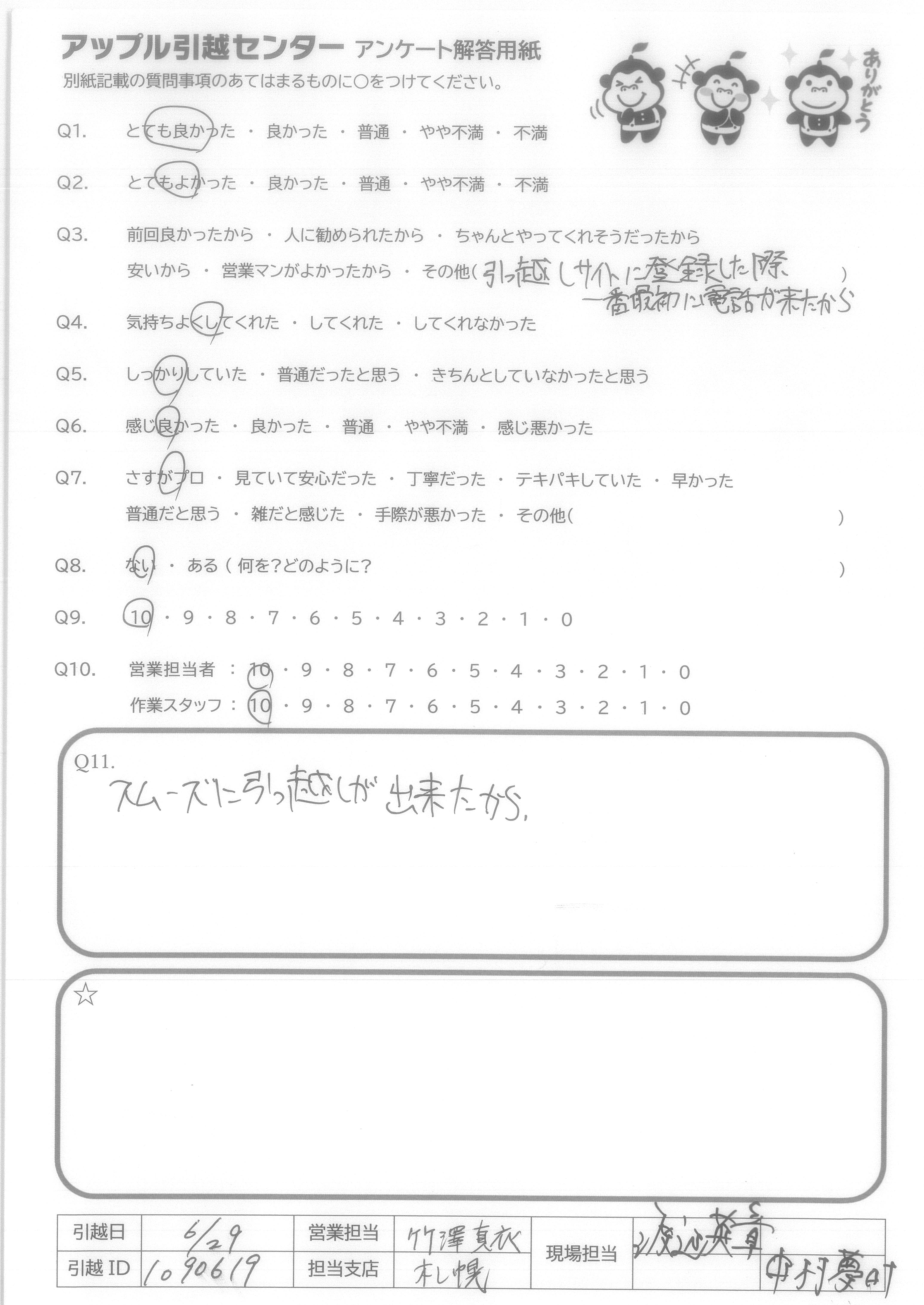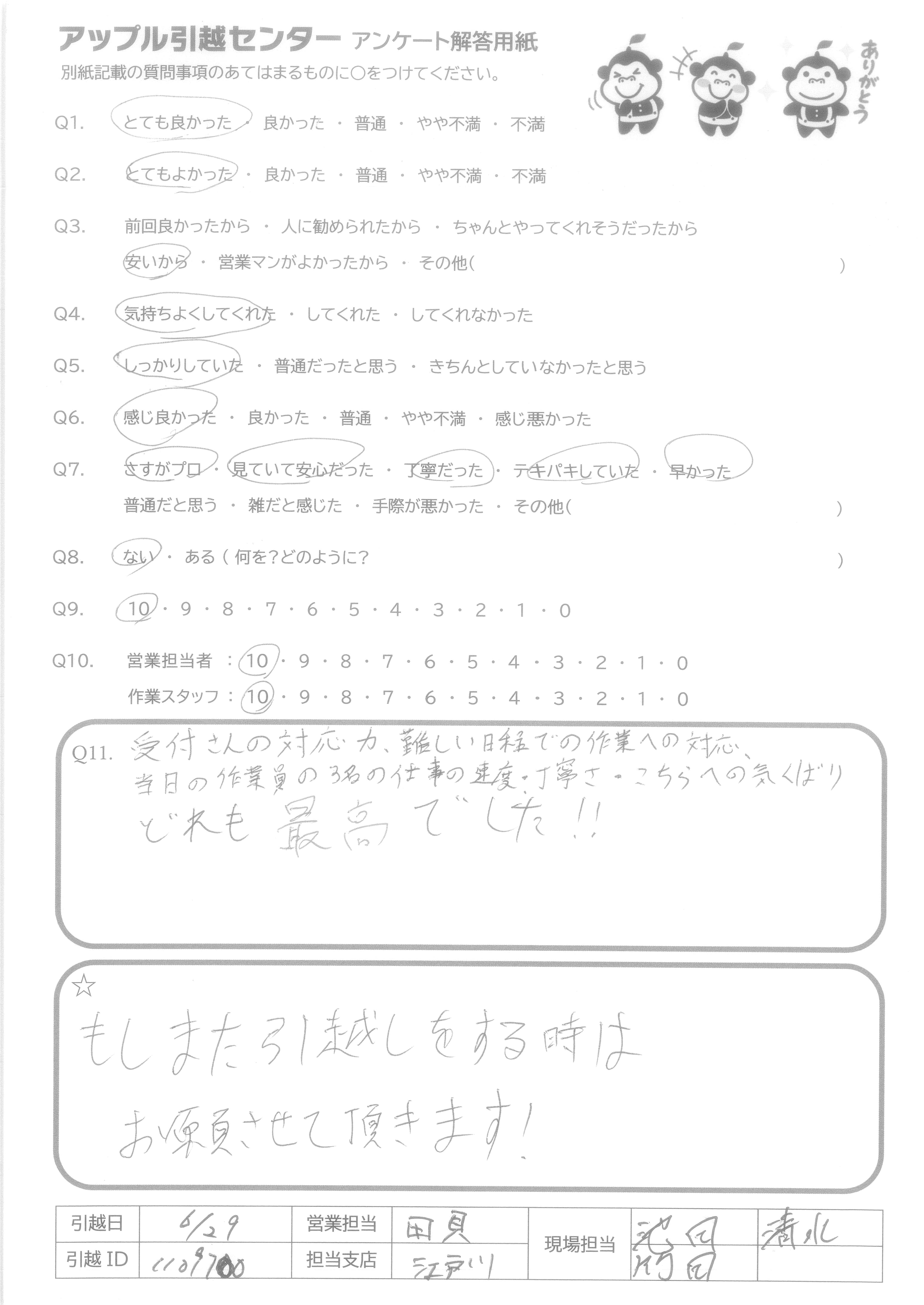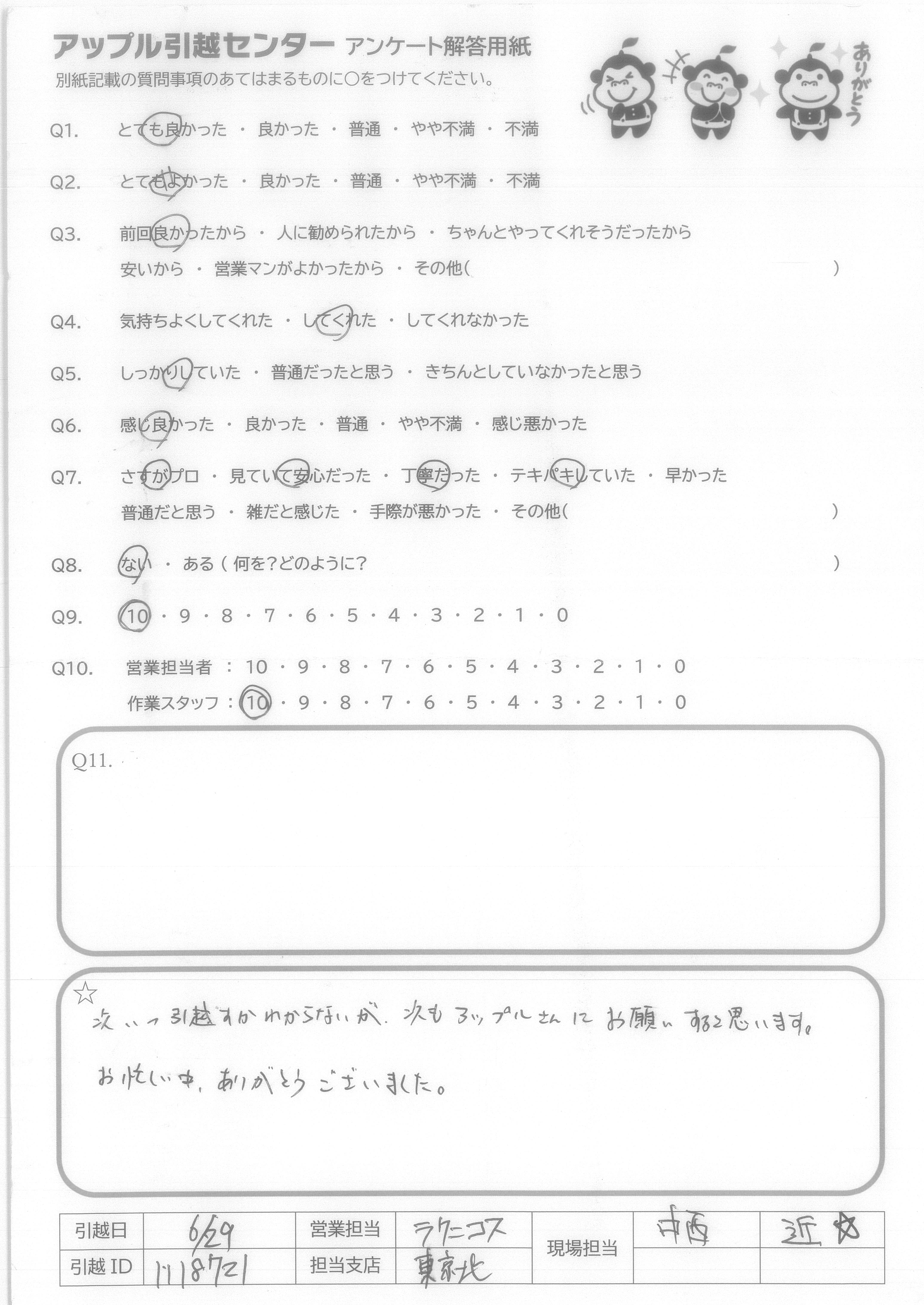 A.次いつ引越すかわからないが、次もアップルさんにお願いすると思います。 お忙しい中、ありがとうございました。