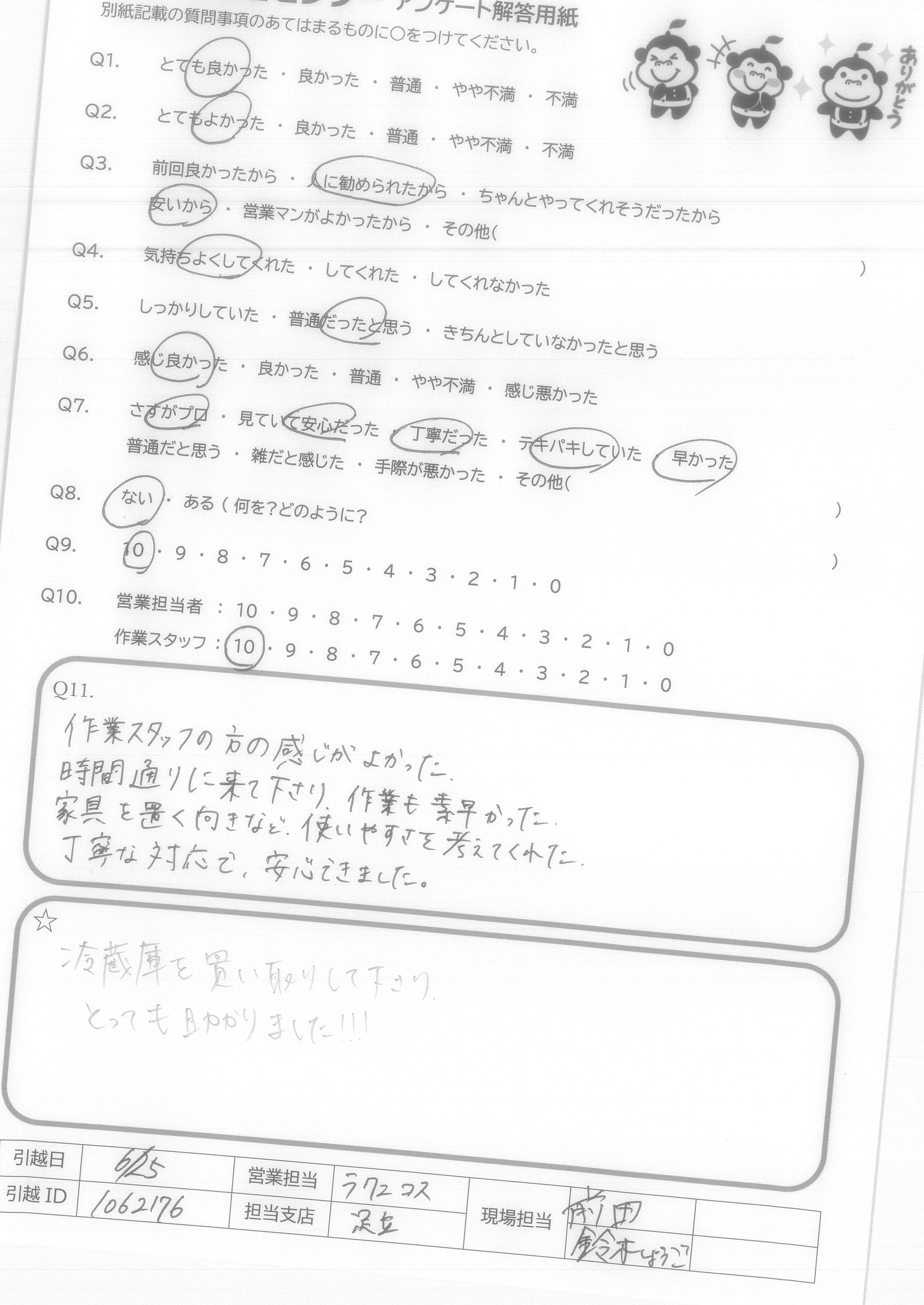 A.他社さんに比べ、料金、ご対応、引越し前備品、当日、どこをとっても満足でした。知人にもおすすめしたいです。暑い中本当にありがとうございました。