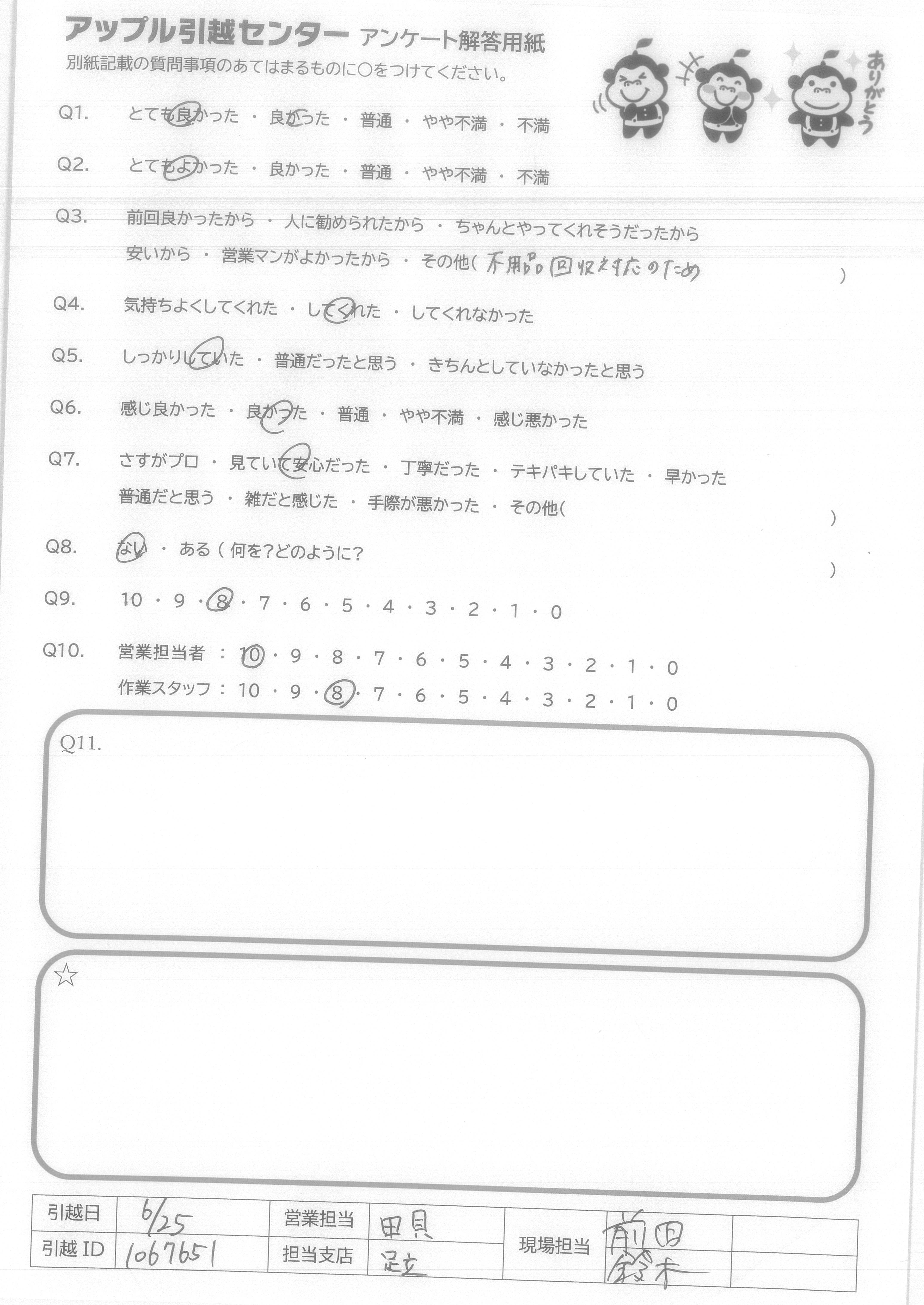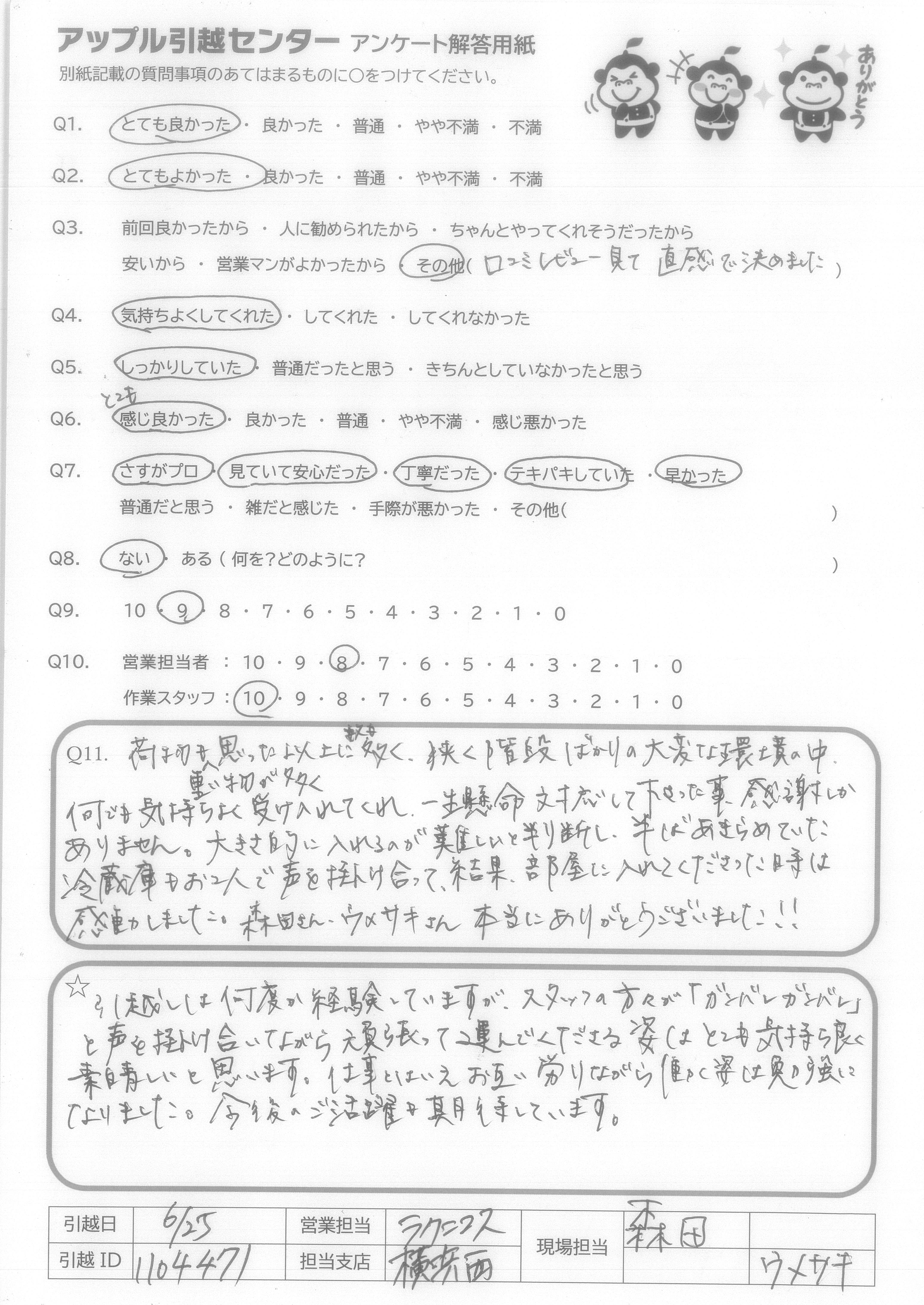 A.引っ越し終えて片付けなどにバタバタとして アンケート遅くなり申し訳ないです。 作業もテキパキとしていだ 本当に素晴らしかったです。 是非次も引っ越しの際はアップルさんで 頼まさせて頂きたいです。 本当に有難うございました。 あとクーラーを取り付けて頂いた方にも 迅速な対応をして頂き本当にありがとうございました。