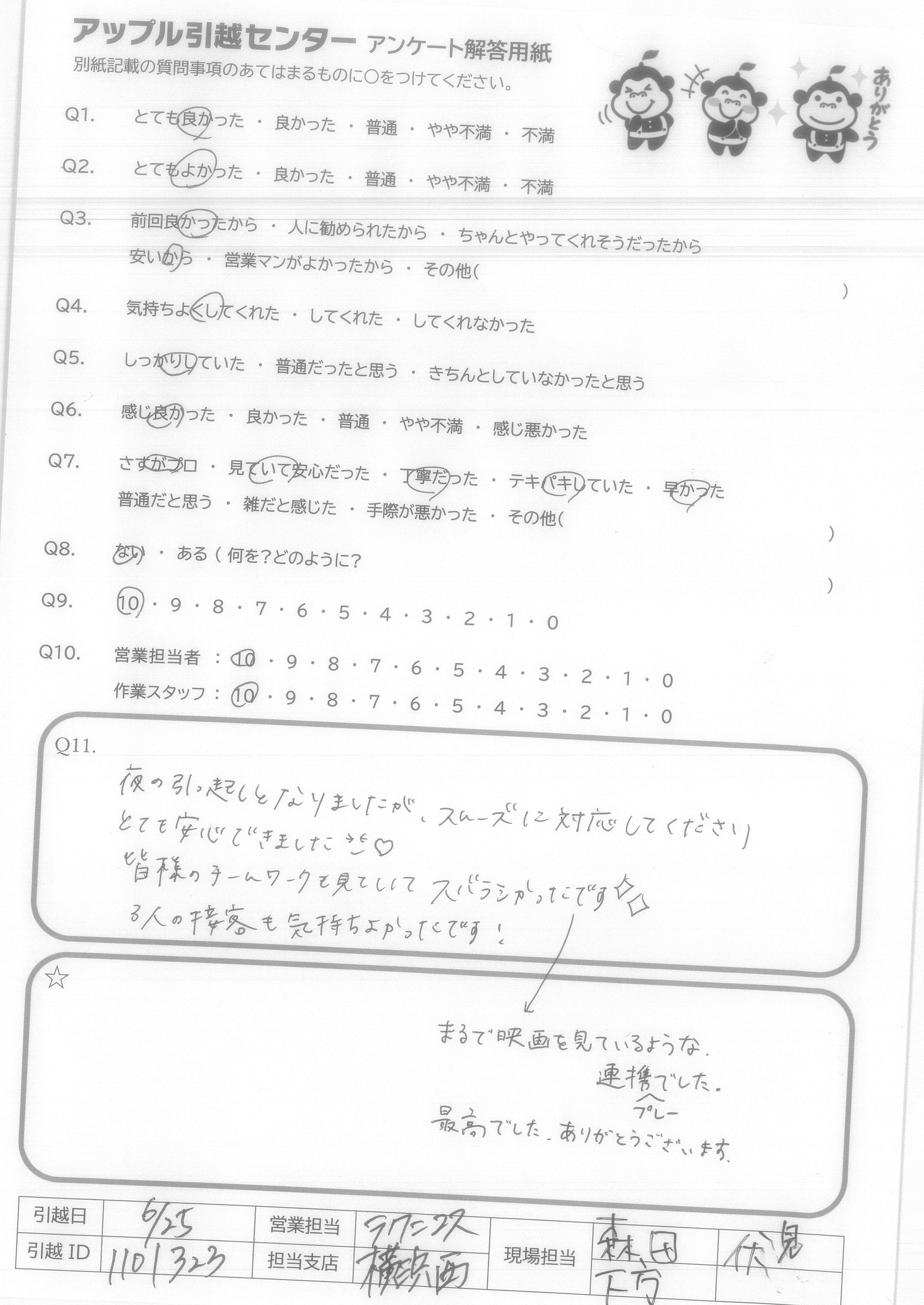 A.夜の引っ起しとなりましたが、スムーズに対応してくださりとても安心できました 皆様のチームワークも見ていてスバラシかったです 3人の接客も気持ちよかったです!!