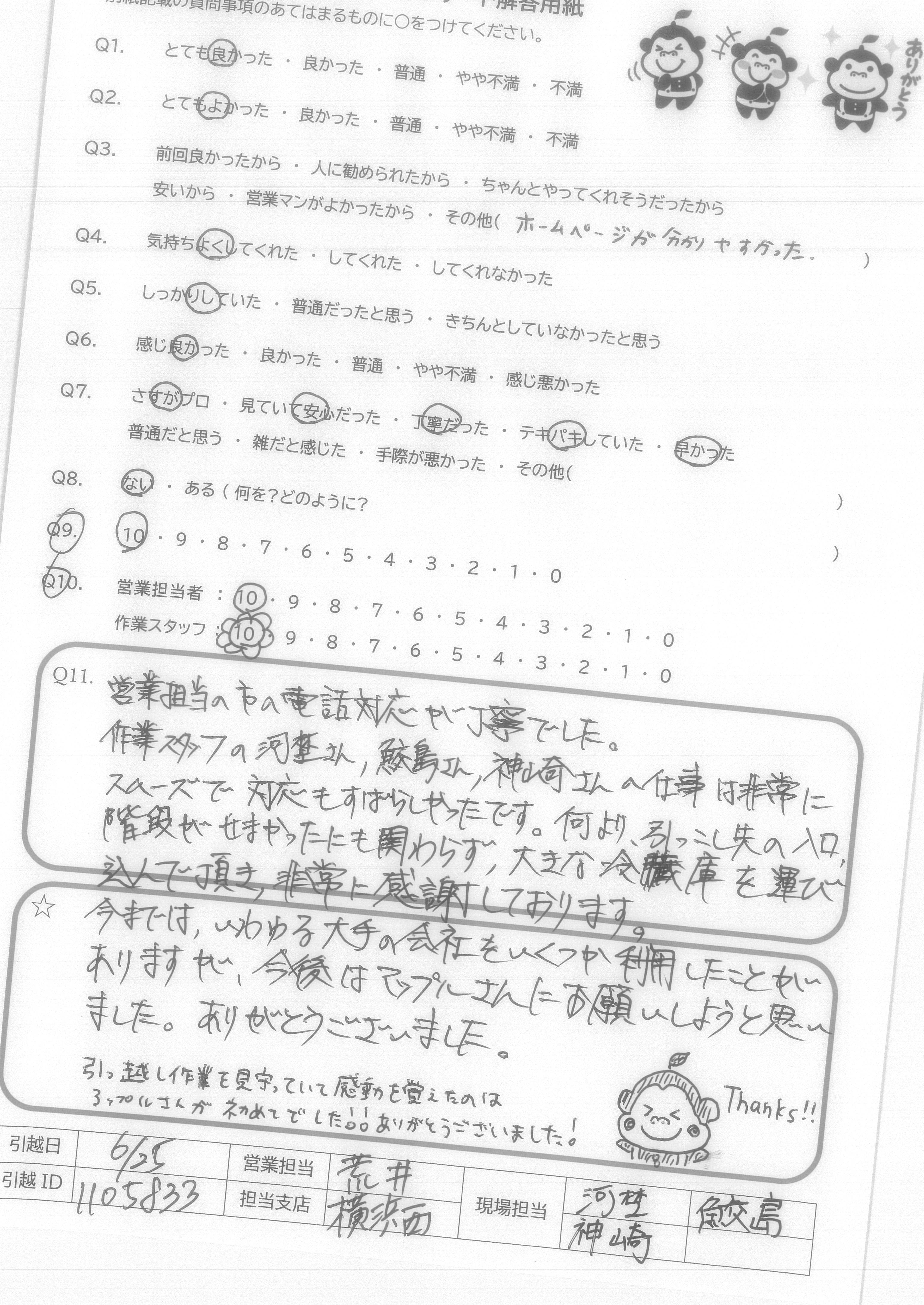 A.営業担当の方の電話対応が丁寧でした。 作業スタッフの河埜さん、鮫島さん、神崎さんの仕事は非常にスムーズで対応もすばらしかったです。何より、引っこし先の入口、階段がせまかったにも関わらず、大きな冷蔵庫を運び込んで頂き、非常に感謝しております。