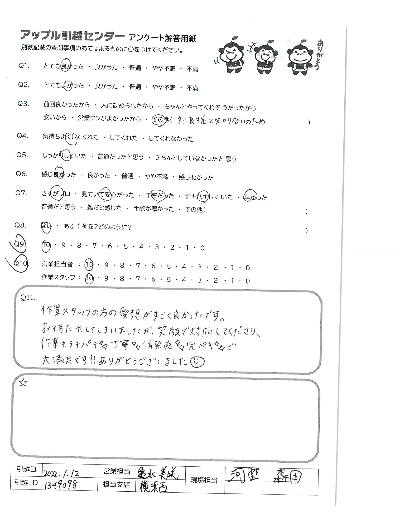 引越し日:2022年01月12日 エリア:神奈川県横浜市神奈川区
