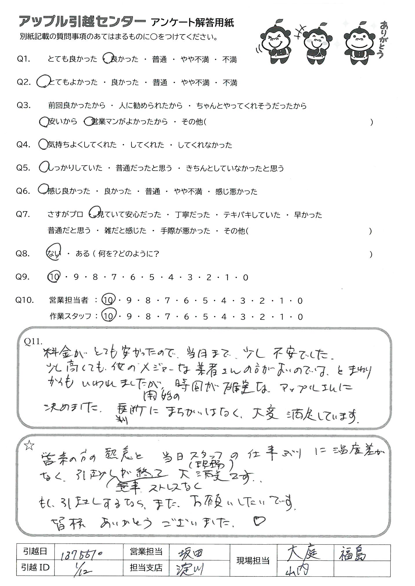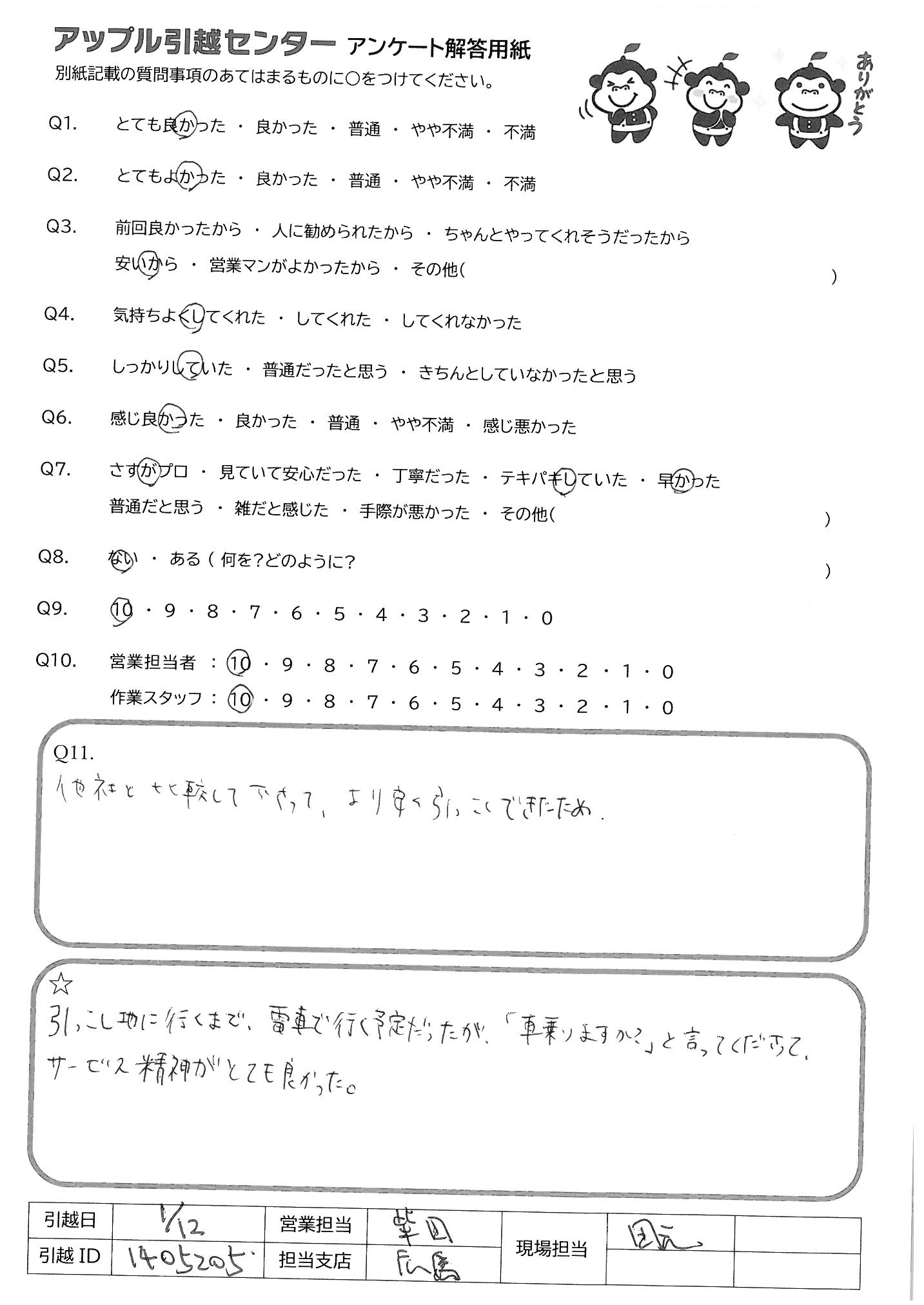 A.料金がとても安かったので、当日まで少し不安でした。少し高くても、他のメジャーな業者さんの方がよいのでは、とまわりからもいわれましたが、開始の時間が確実なアップルさんに決めました。判断にまちがいはなく、大変満足しています。