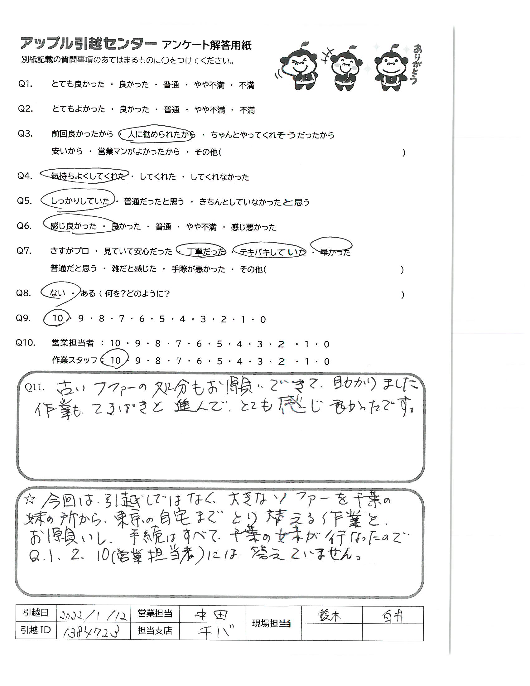 A.今回は引越しではなく、大きなソファーを千葉の妹の所から、東京の自宅までとり替える作業をお願いし、手続はすべて、千葉の妹が行なったのでQ1,2,10(営業担当者)には答えていません。