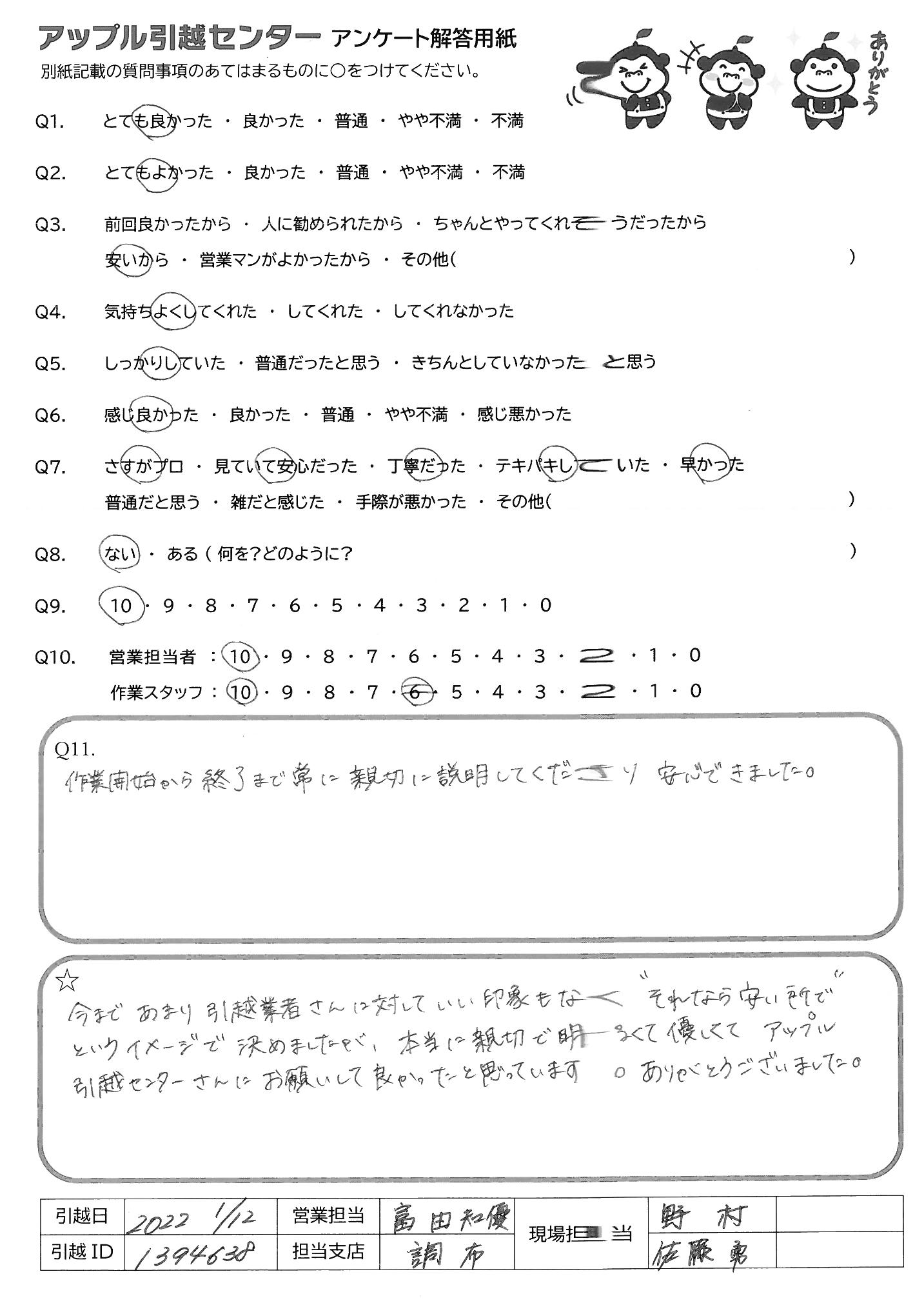 引越し日:2022年01月12日 エリア:東京都調布市