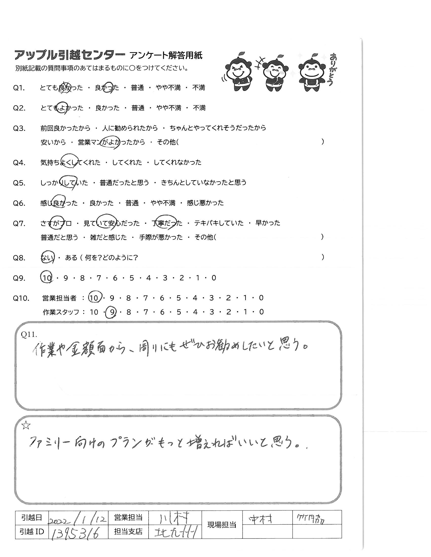 A.全体的にとても満足です。 初めての引っ越しで不安もありましたが、ここにして良かったと思いました。 また機会があったらよろしくお願いします。