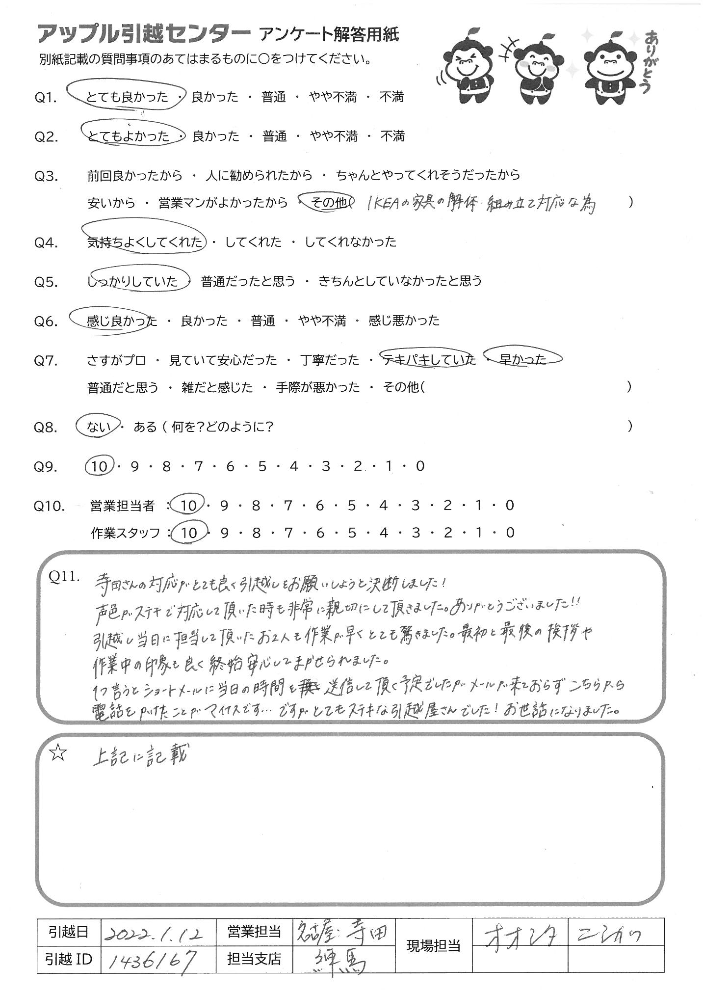 A.寺田さんの対応がとても良く引越しをお願いしようと決断しました! 声音がステキで対応して頂いた時も非常に親切にして頂きました。ありがとうございました!! 引越し当日に担当して頂いたお2人も作業が早くとても驚きました。最初と最後の挨拶や作業中の印象も良く終始安心してまかせられました。 1つ言うとショートメールに当日に時間の送信して頂く予定でしたがメールが来ておらずこちらから電話をかけたことがマイナスです…ですがとてもステキな引越屋さんでした!お世話になりました。