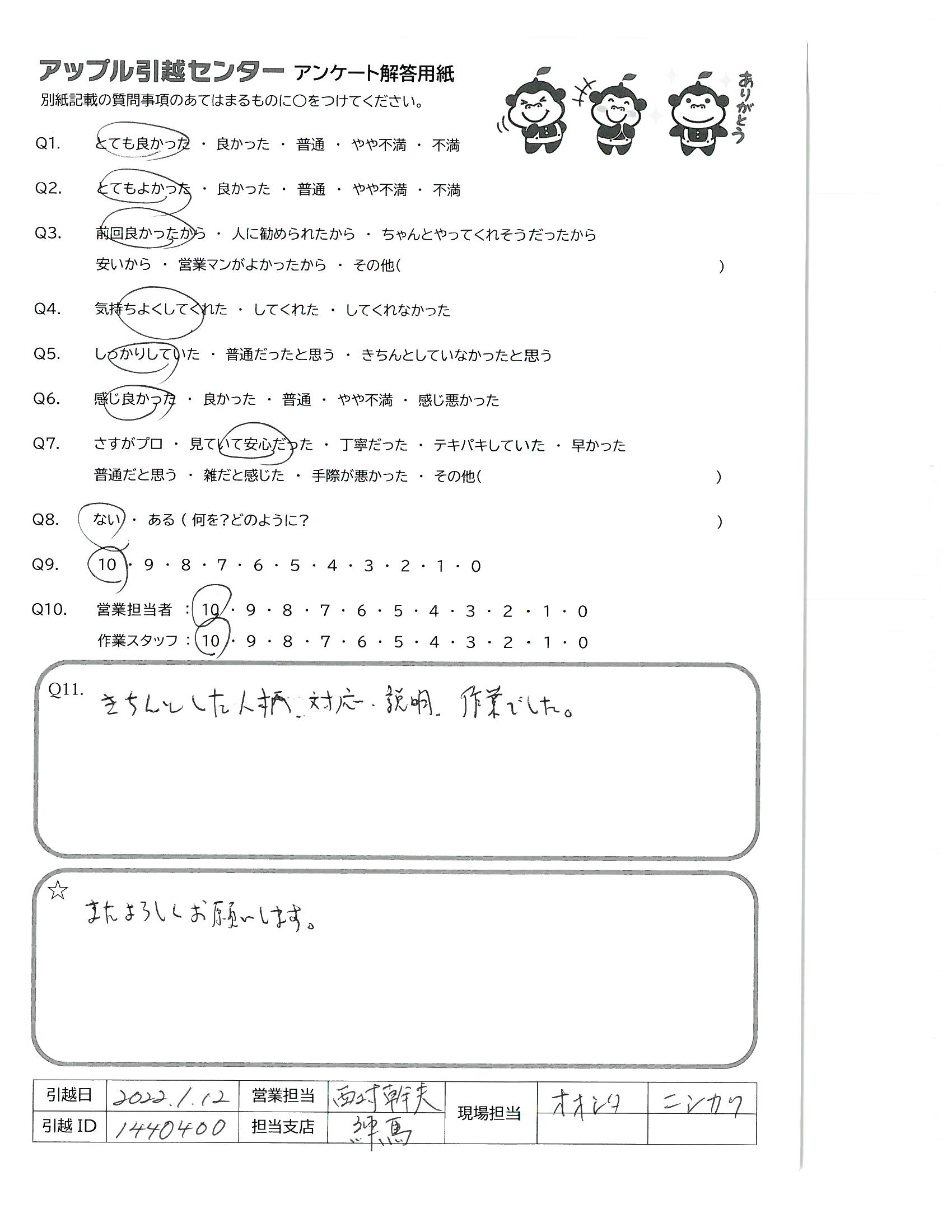 引越し日:2022年01月12日 エリア:兵庫県西宮市
