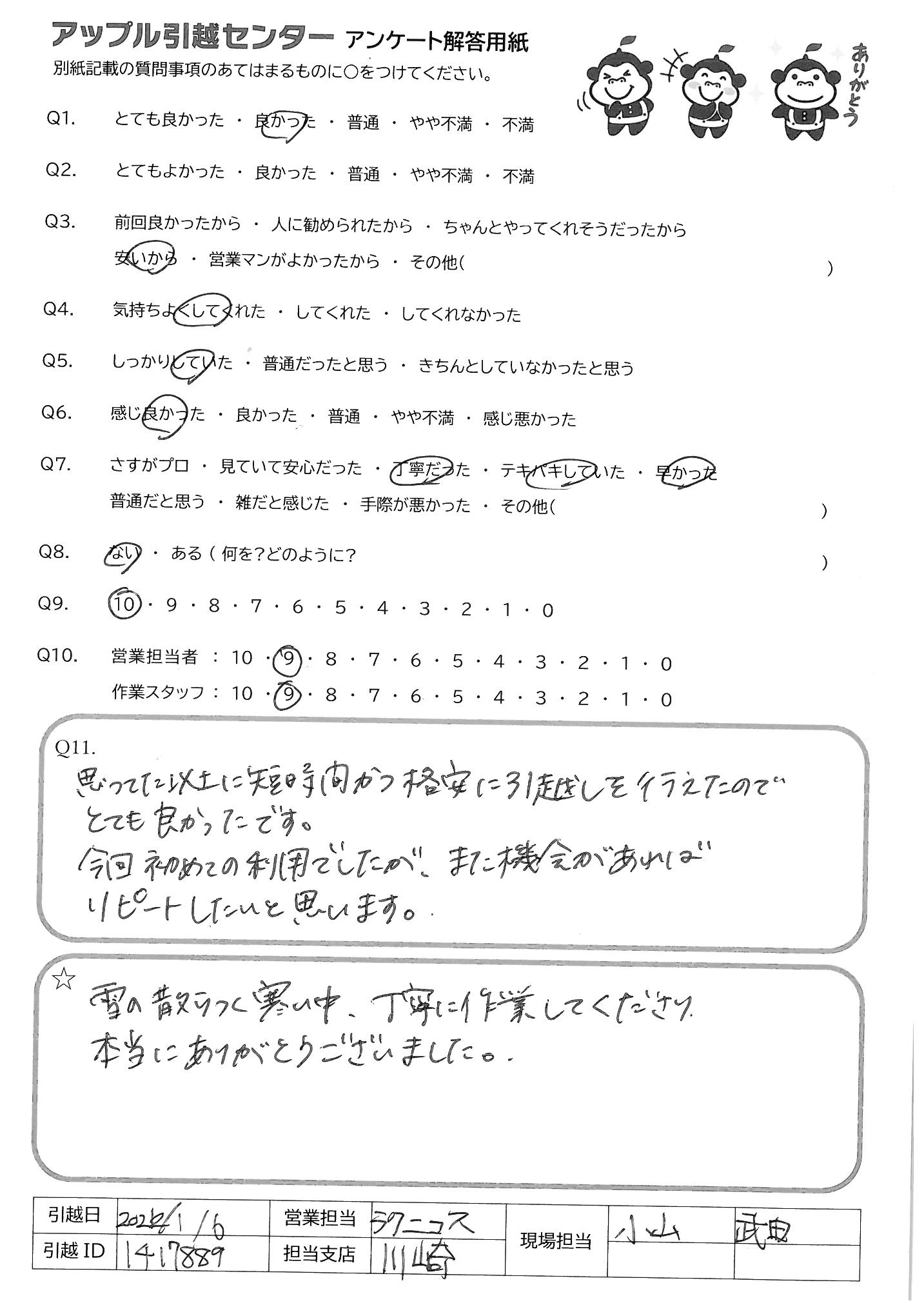 引越し日:2022年01月06日 エリア:神奈川県川崎市多摩区