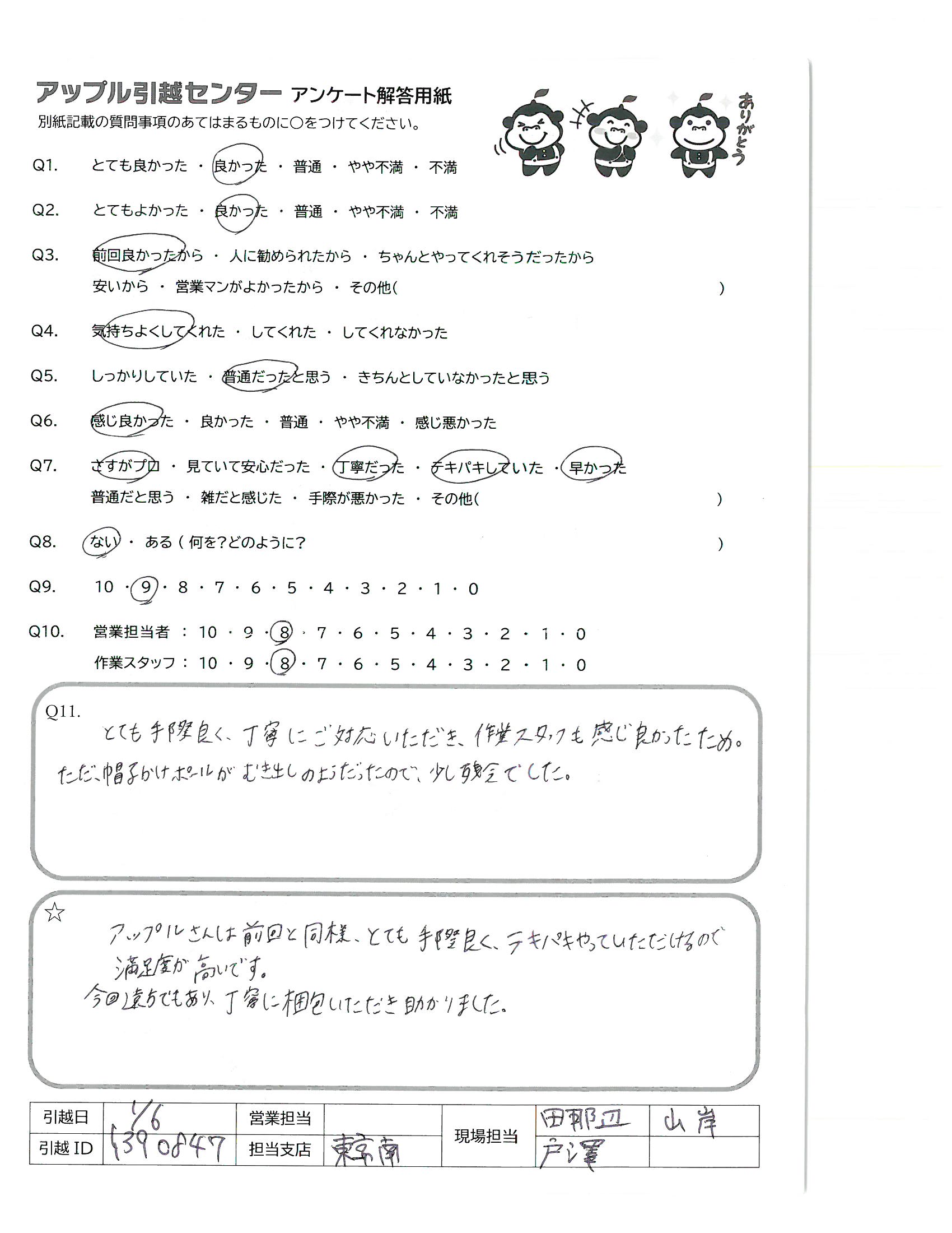 A.アップルさんは前回と同様、とても手際良く、テキパキやっていただけるので満足度が高いです。 今回遠方でもあり、丁寧に梱包いただき助かりました。