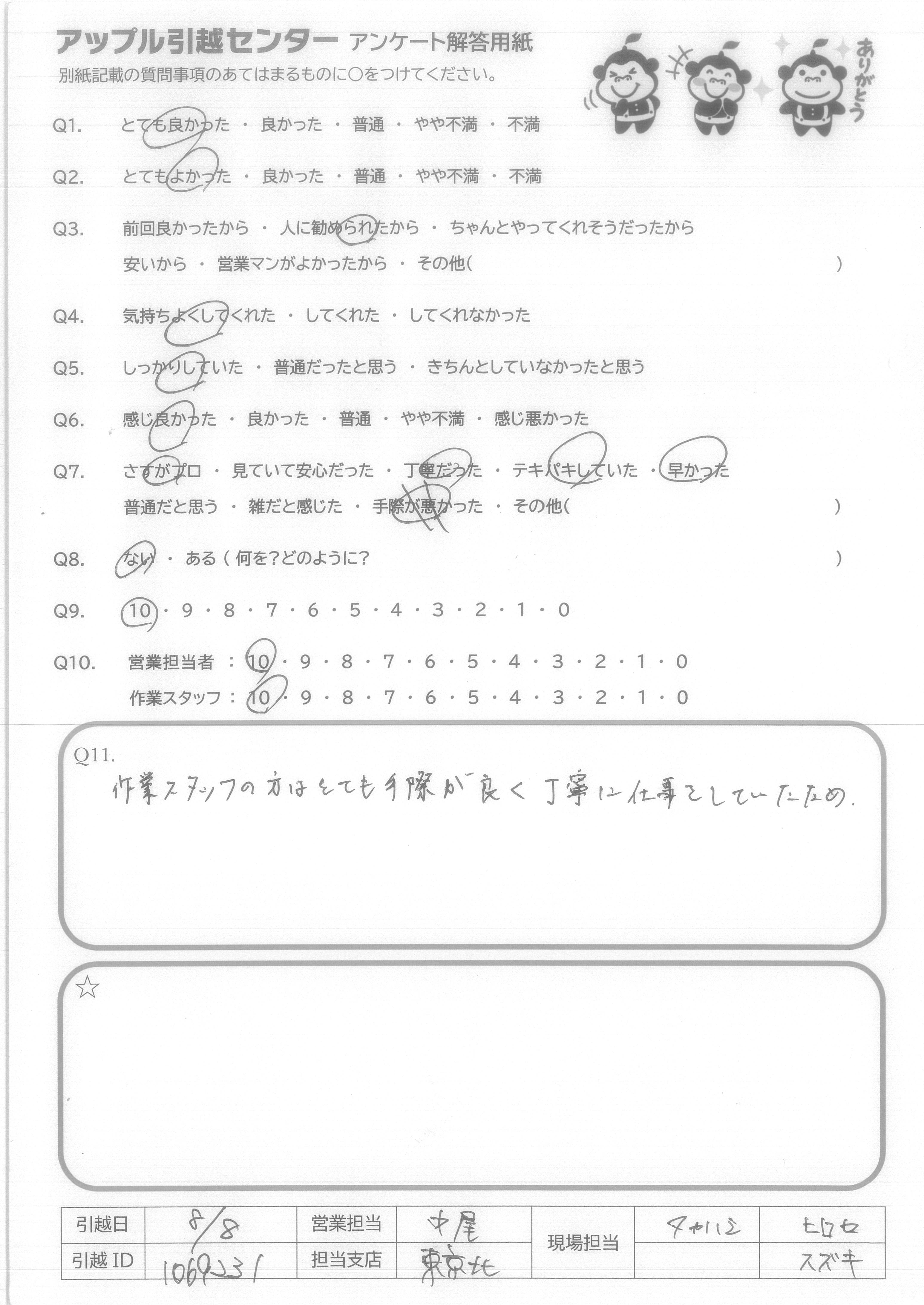 A.ちょうど良い距離感で対応してくれて本当にありがとうございます!また引っ越しがあれば頼みたいと思っています。