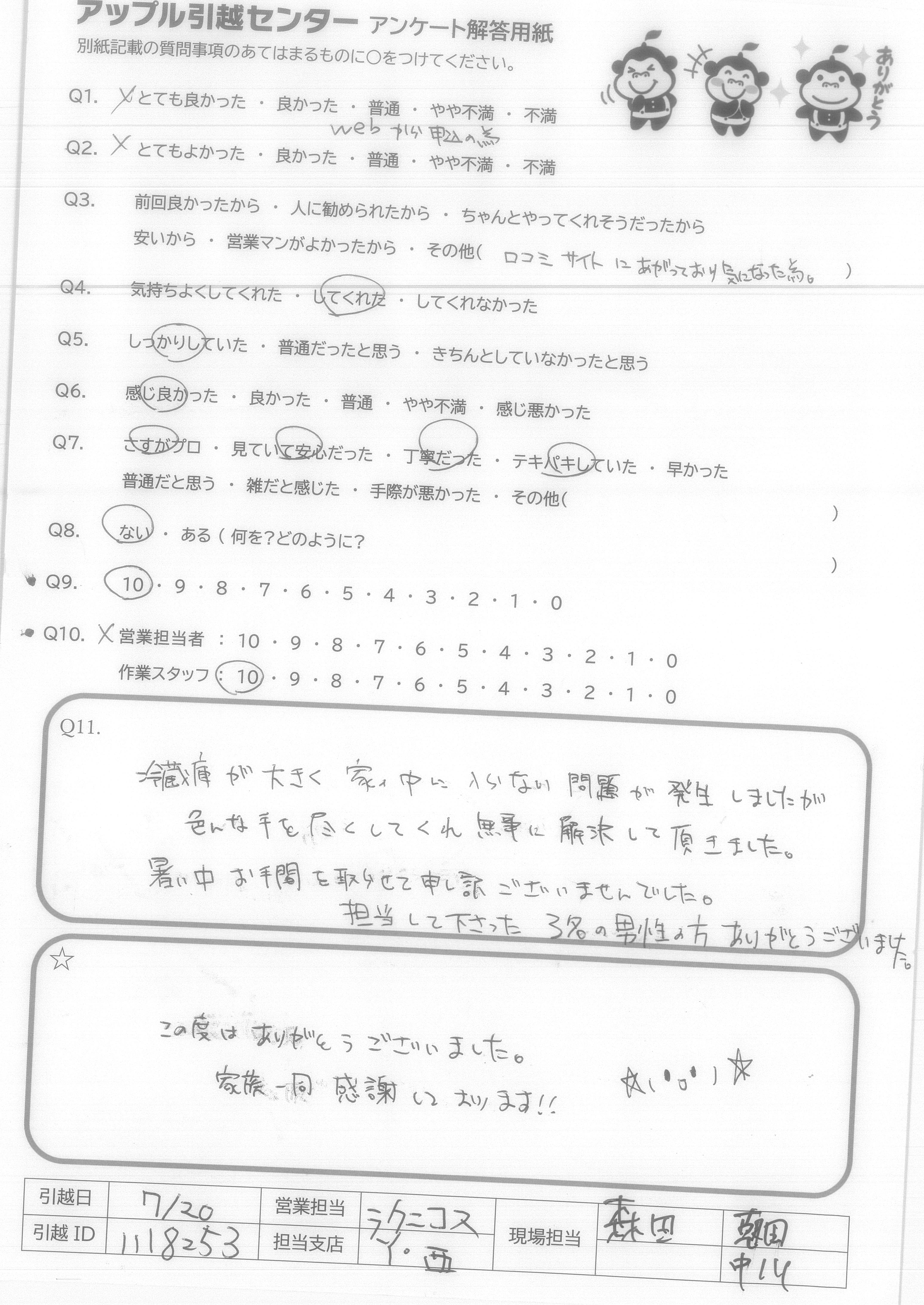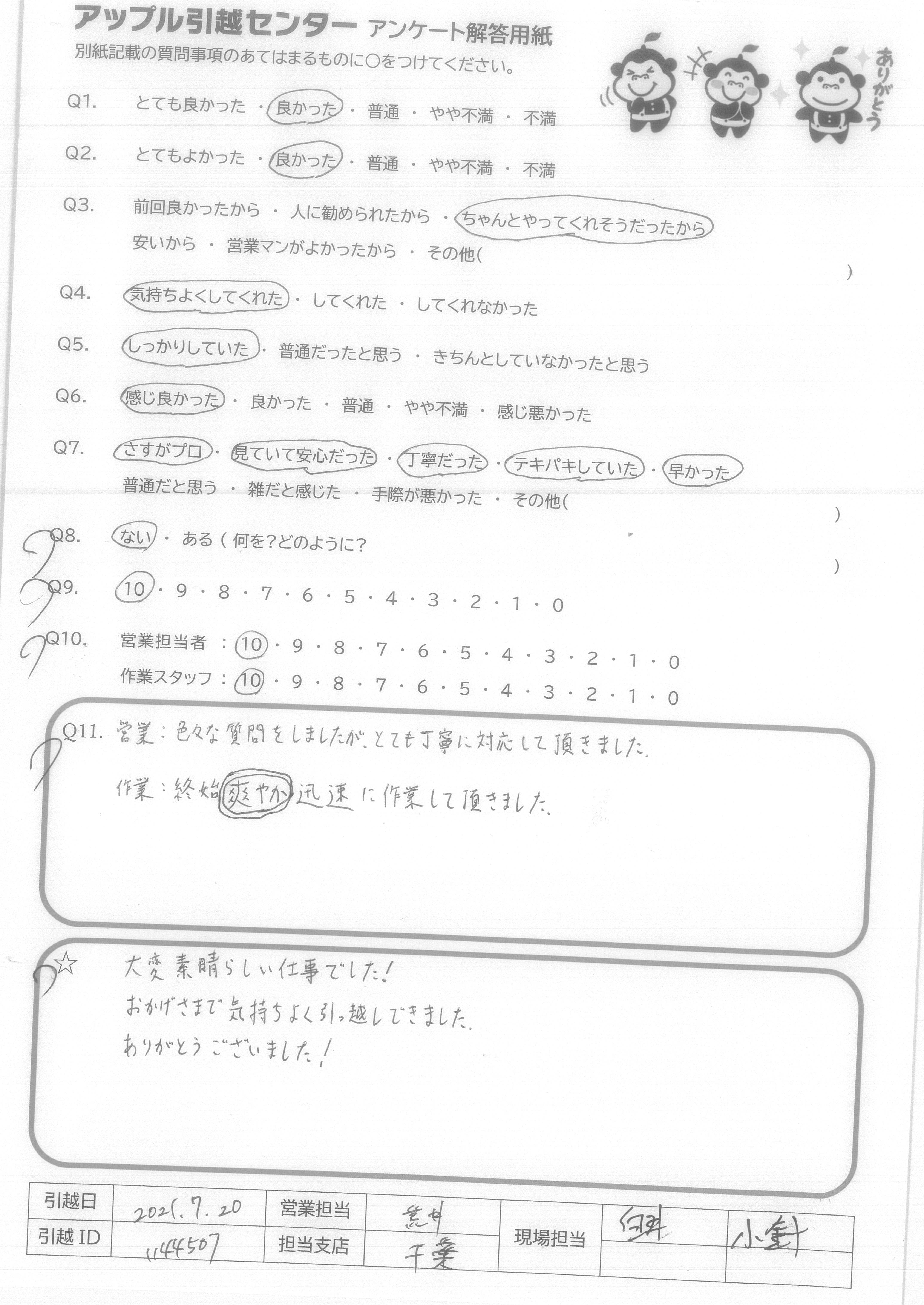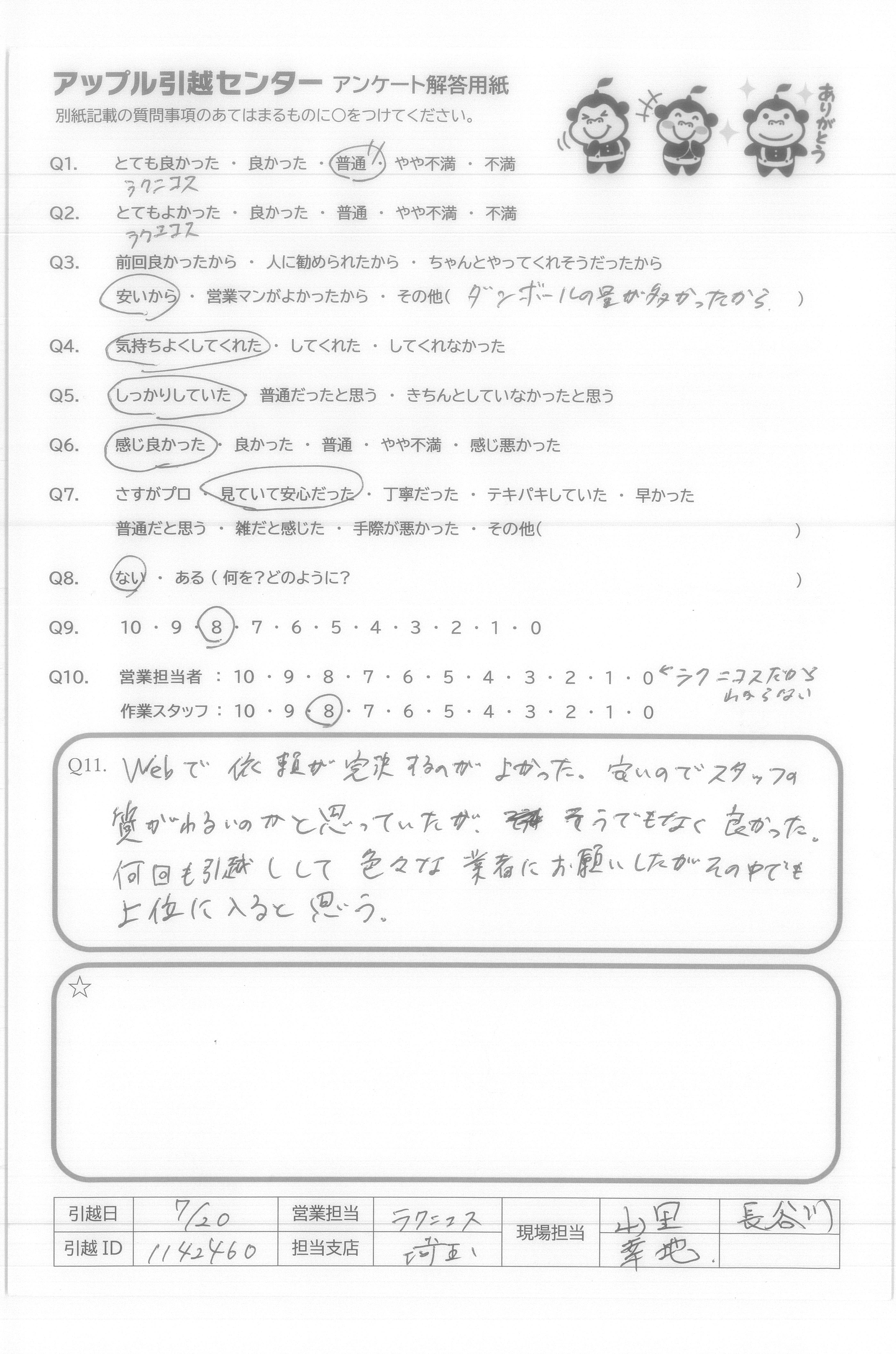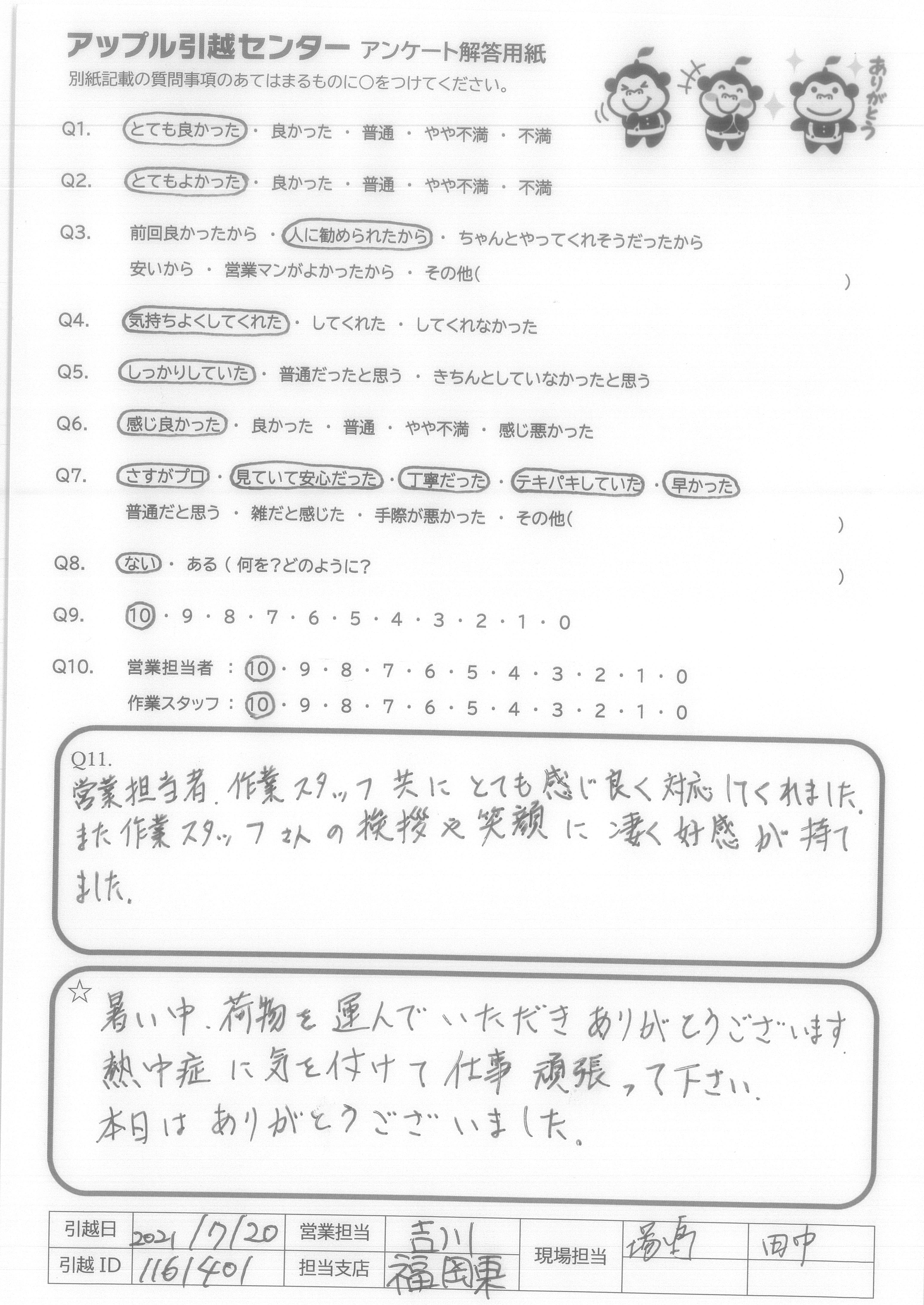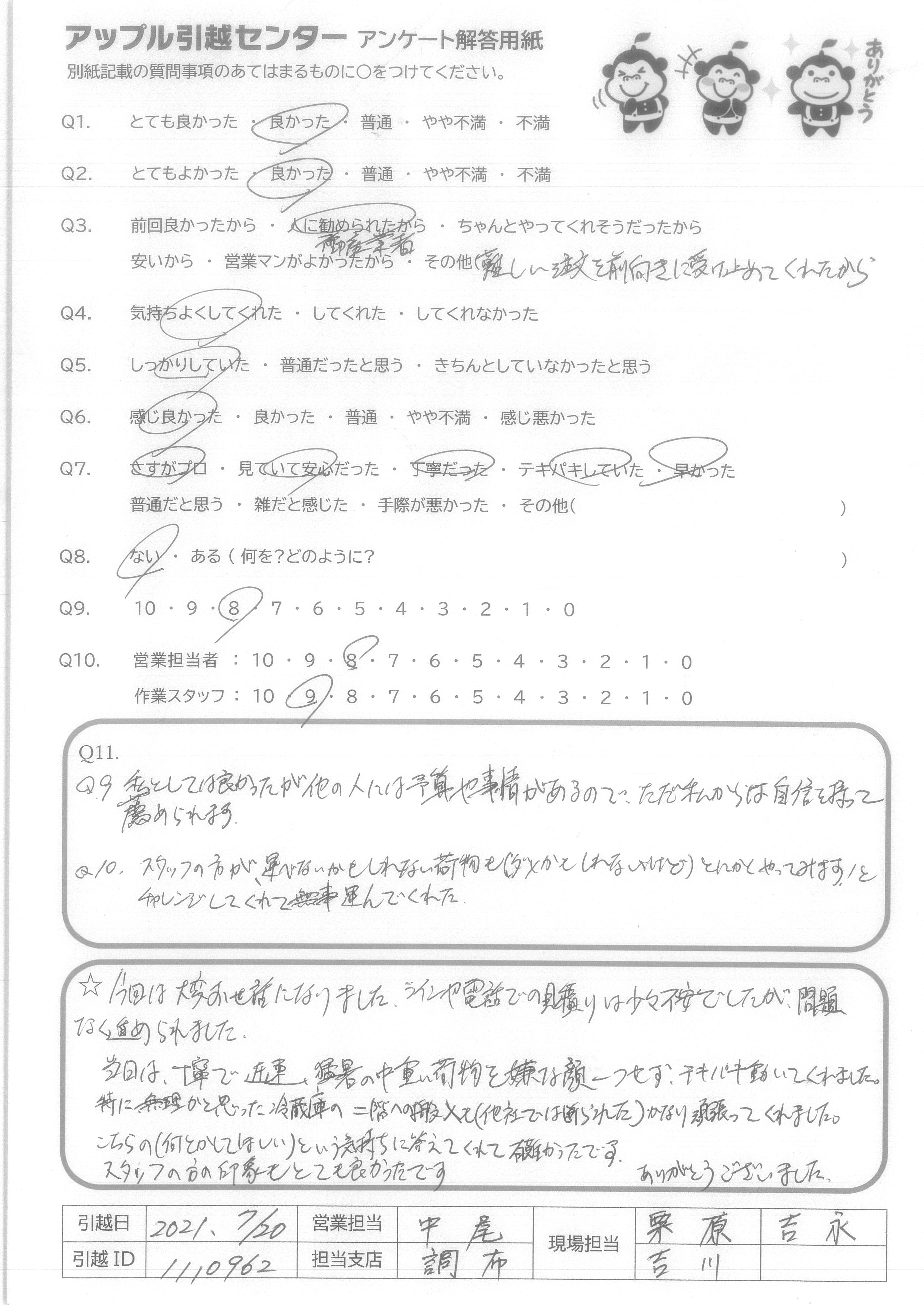 A.Q9について…全てインターネットでの手続きで完結し、大変便利、かつ以前に利用した業者さんよりも安い値段だったから。 Q10について…大変気持ち良く作業して頂き、感謝しかありません。引越し先がエレベーター無しの4階というのと、すごく暑い中というしんどい状況なのにスピーディかつていねいにフレンドリーに接して頂けたから。