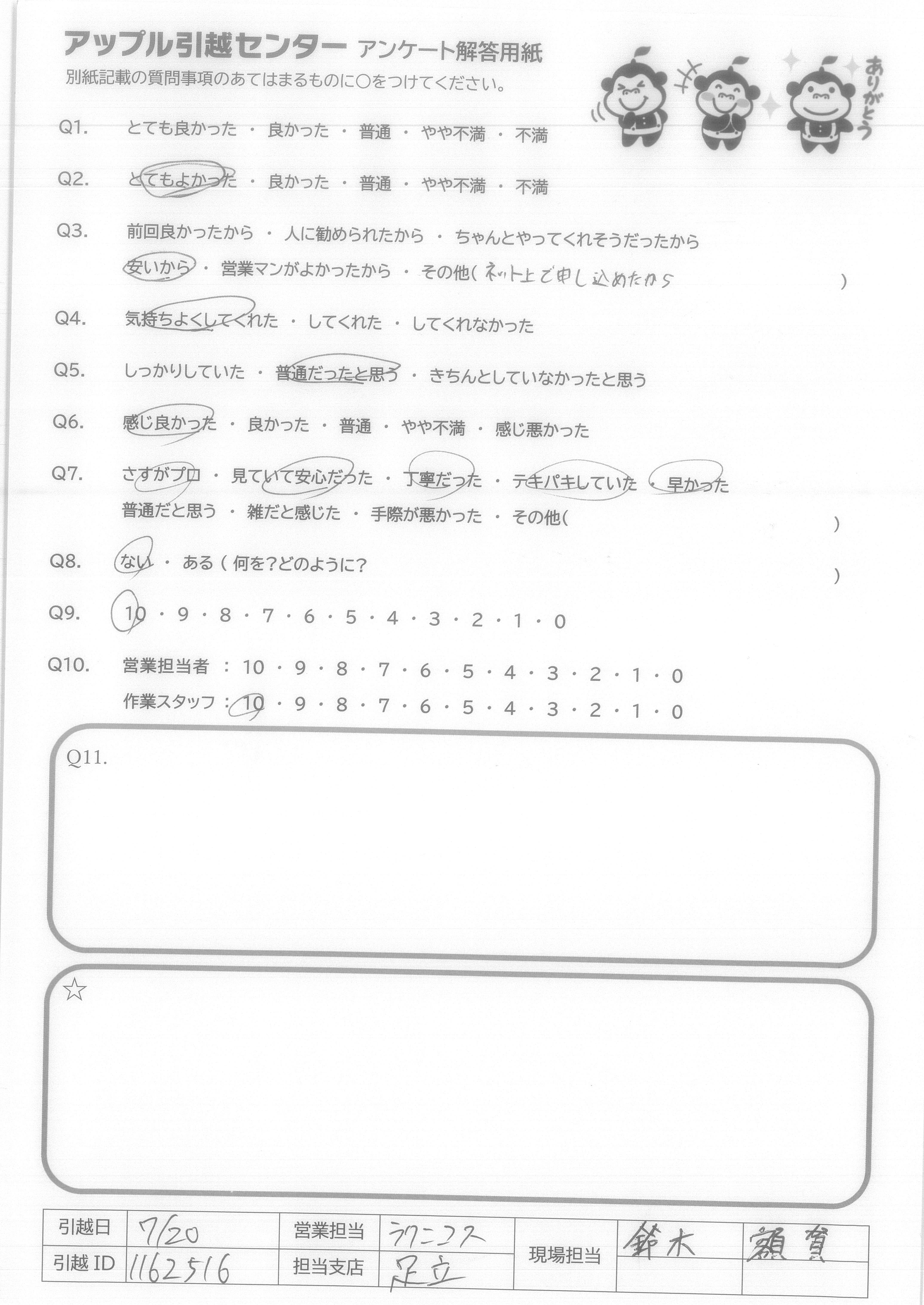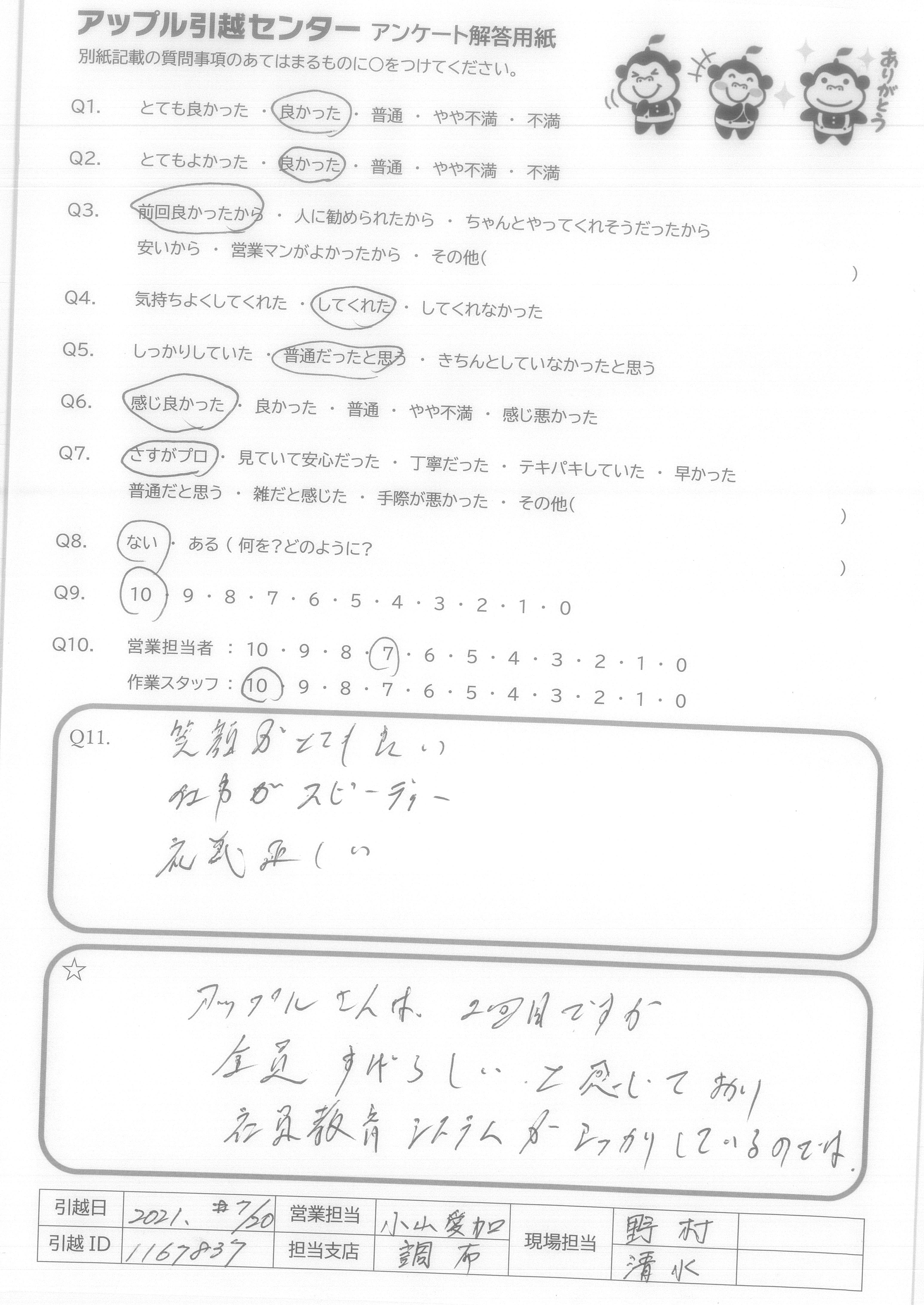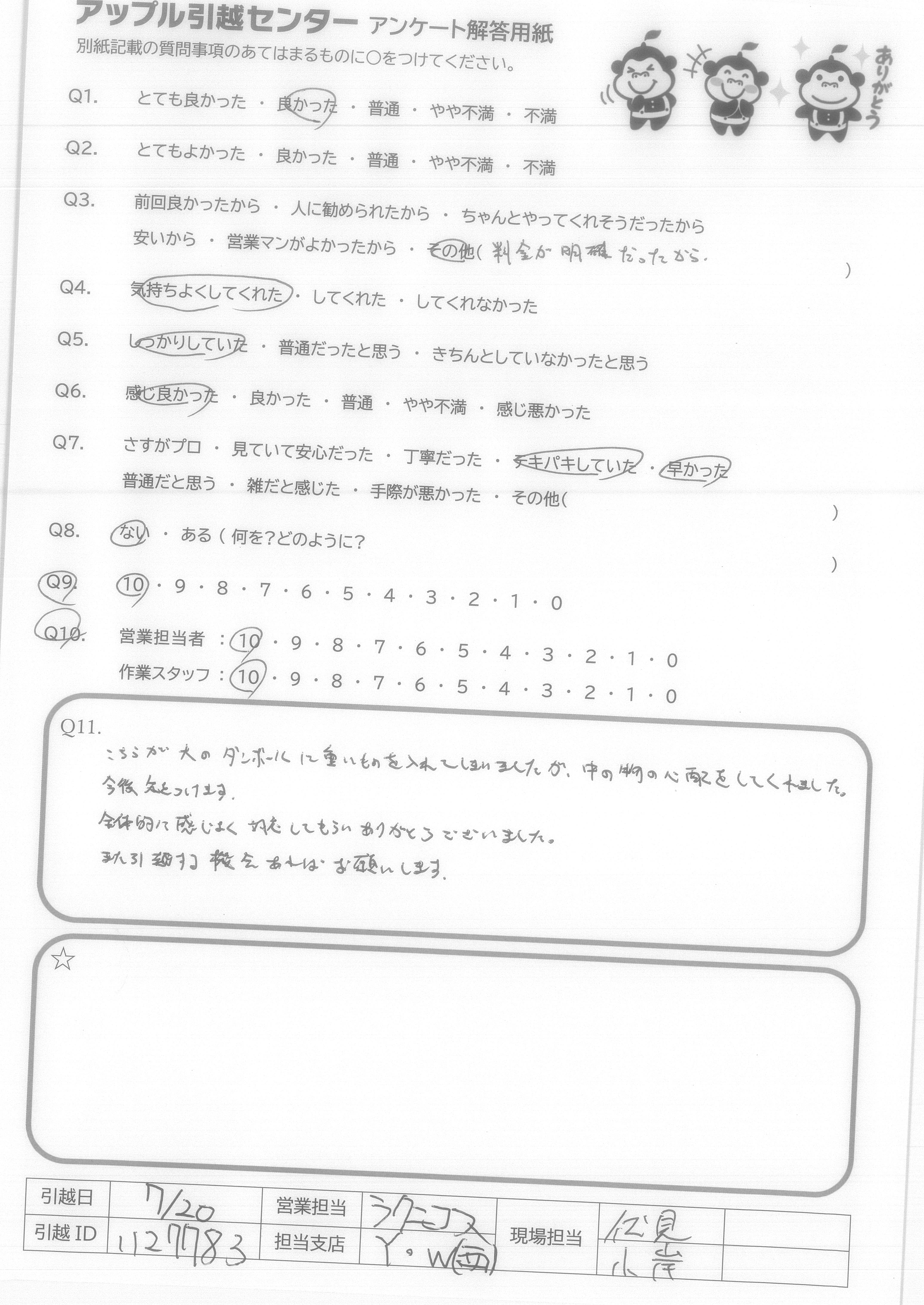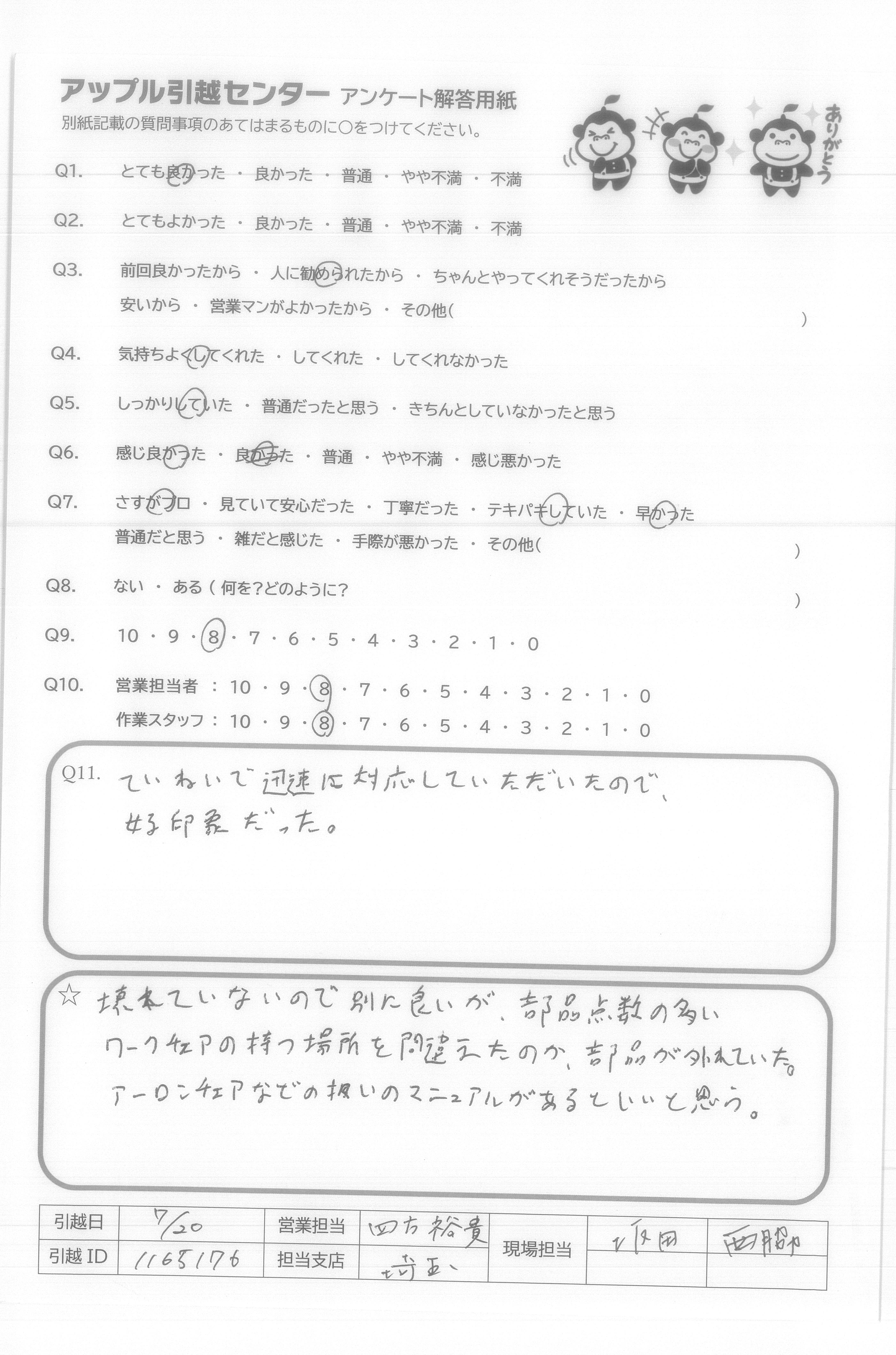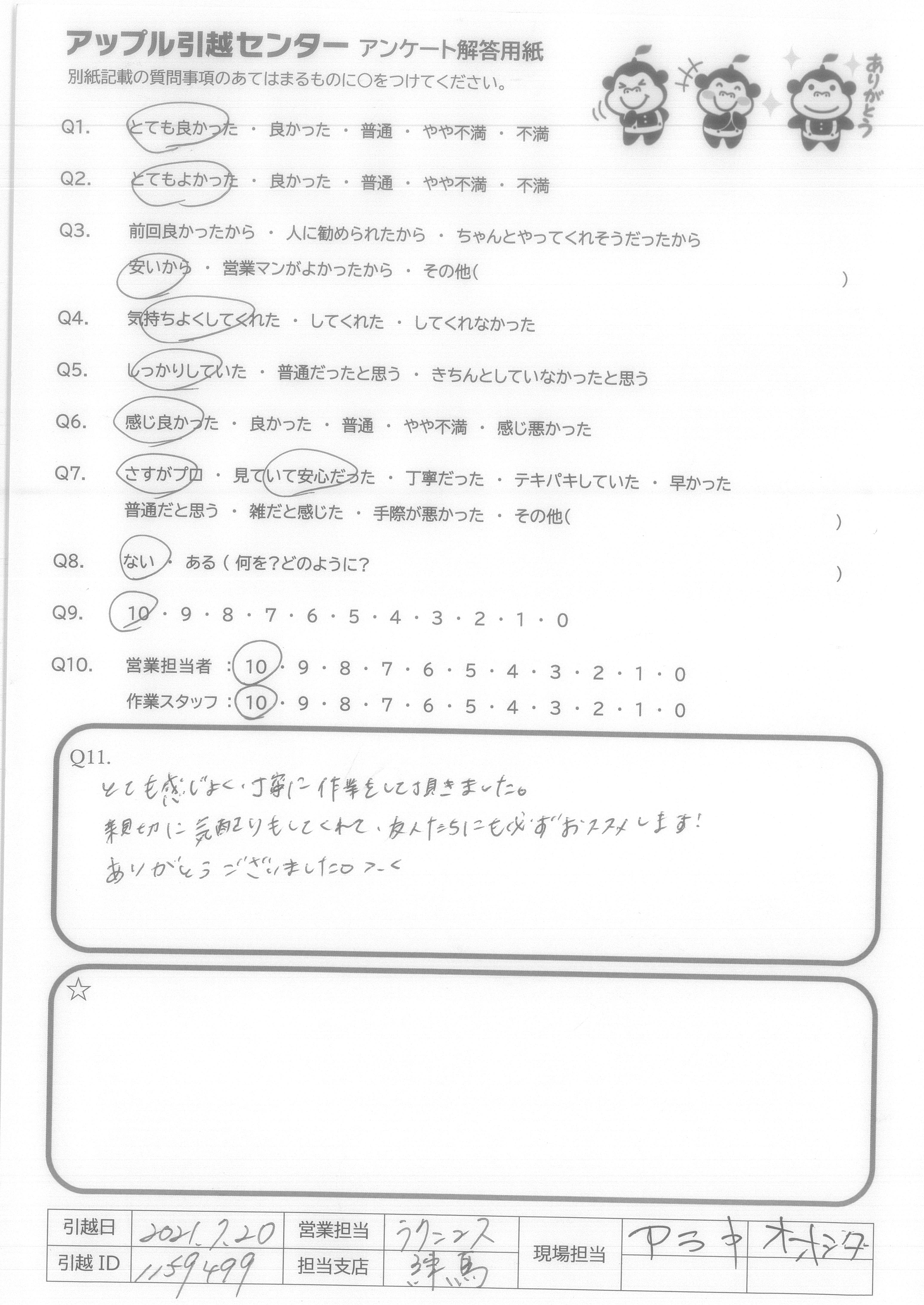 A.Q9について…全てインターネットでの手続きで完結し、大変便利、かつ以前に利用した業者さんよりも安い値段だったから。 Q10について…大変気持ち良く作業して頂き、感謝しかありません。引越し先がエレベーター無しの4階というのと、すごく暑い中というしんどい状況なのにスピーディかつていねいにフレンドリーに接して頂けたから。