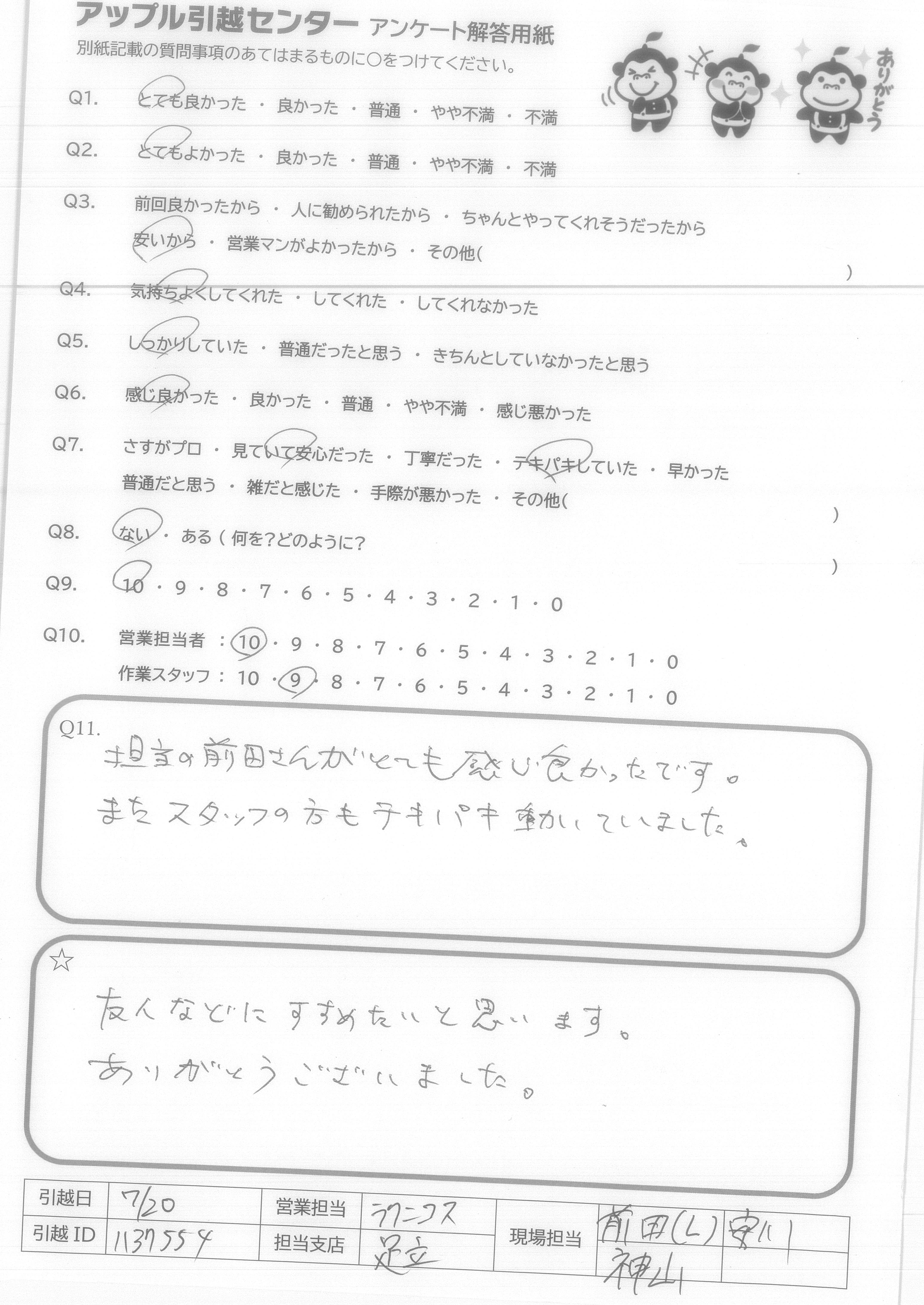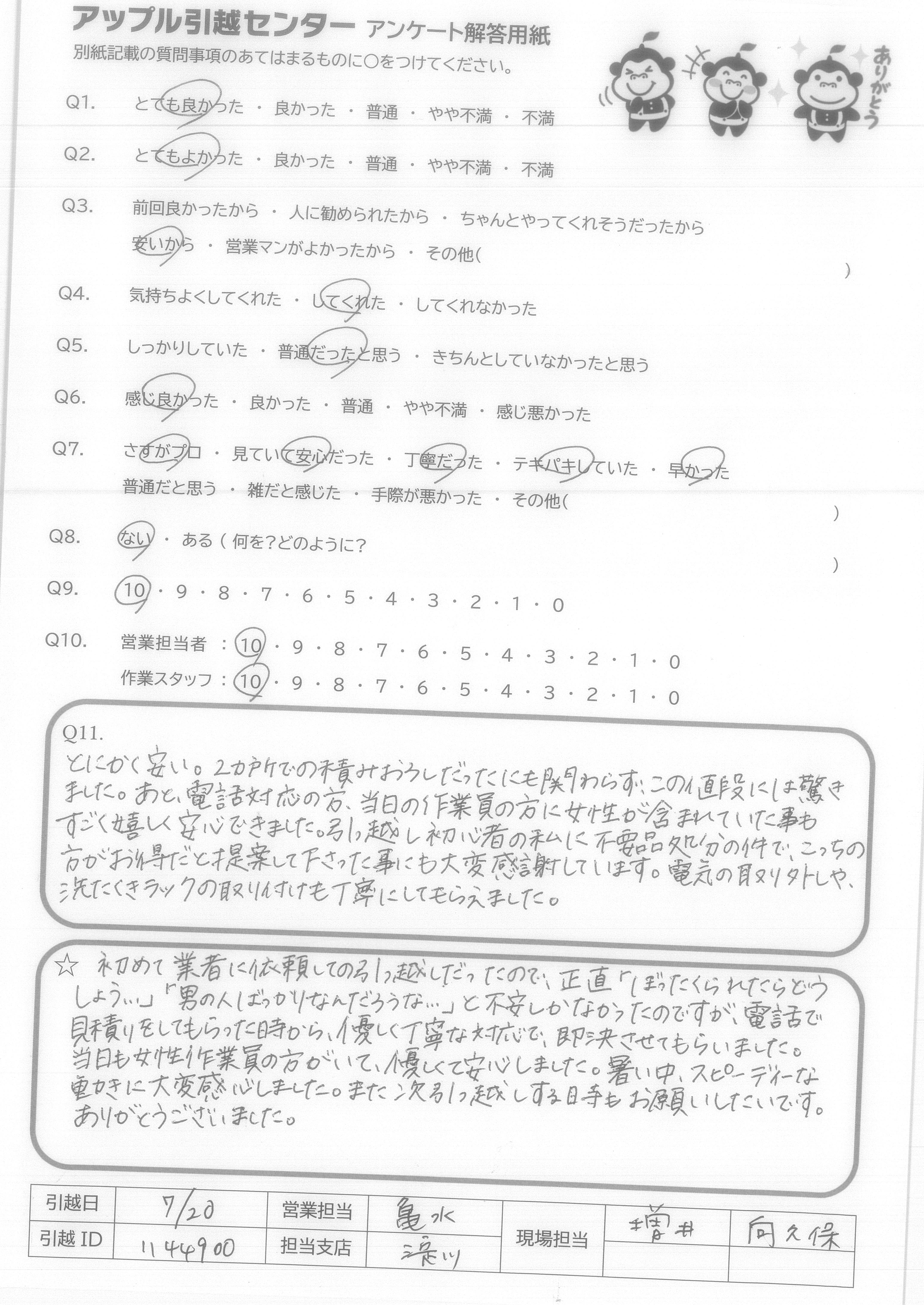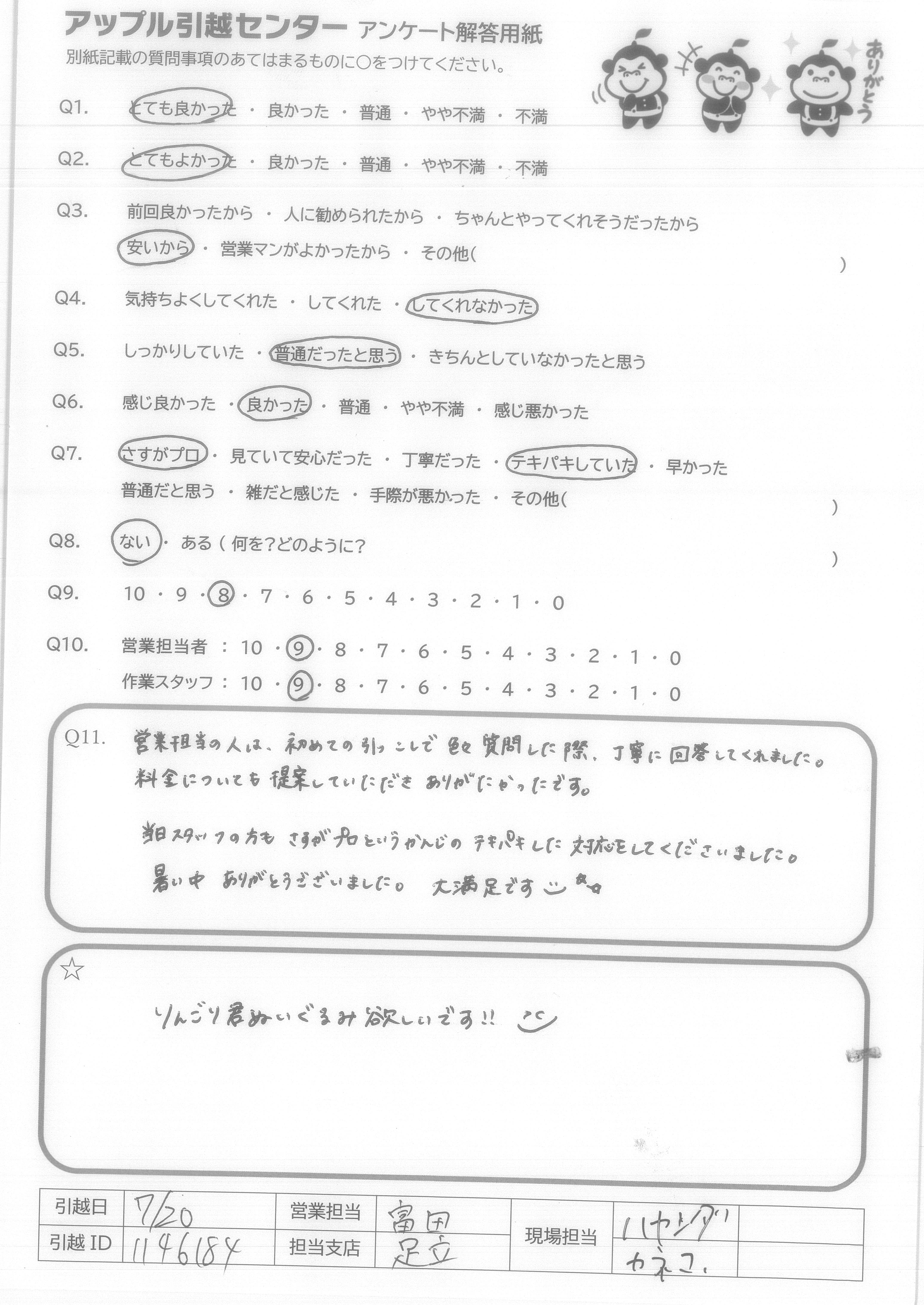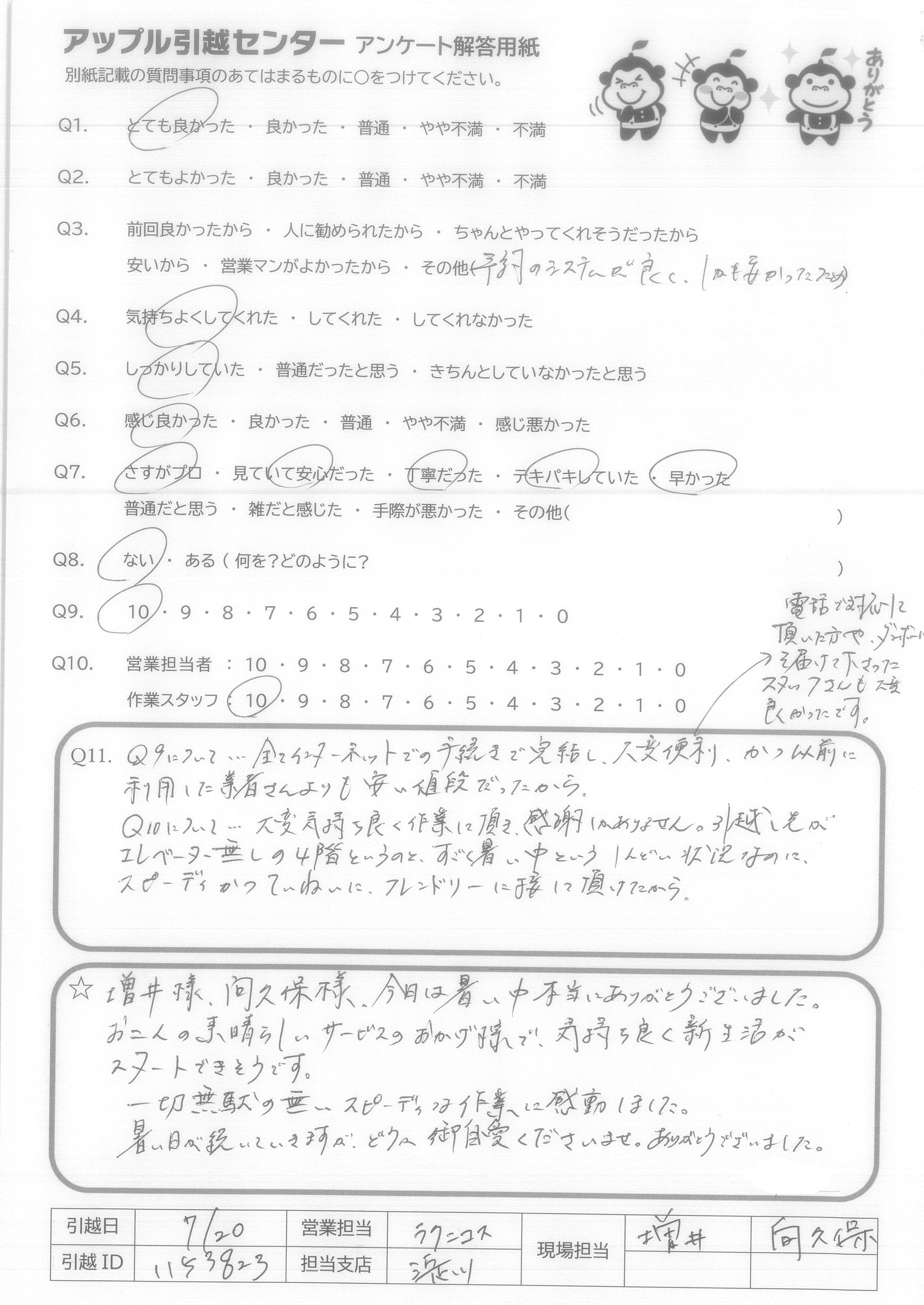 A.増井様、向久保様、今日は暑い中本当にありがとうございました。 お二人の素晴らしいサービスのおかげ様で、気持ち良く新生活がスタートできそうです。 一切無駄の無いスピーディな作業に感動しました。 暑い日が続いていますが、どうか御自愛くださいませ。ありがとうございました。