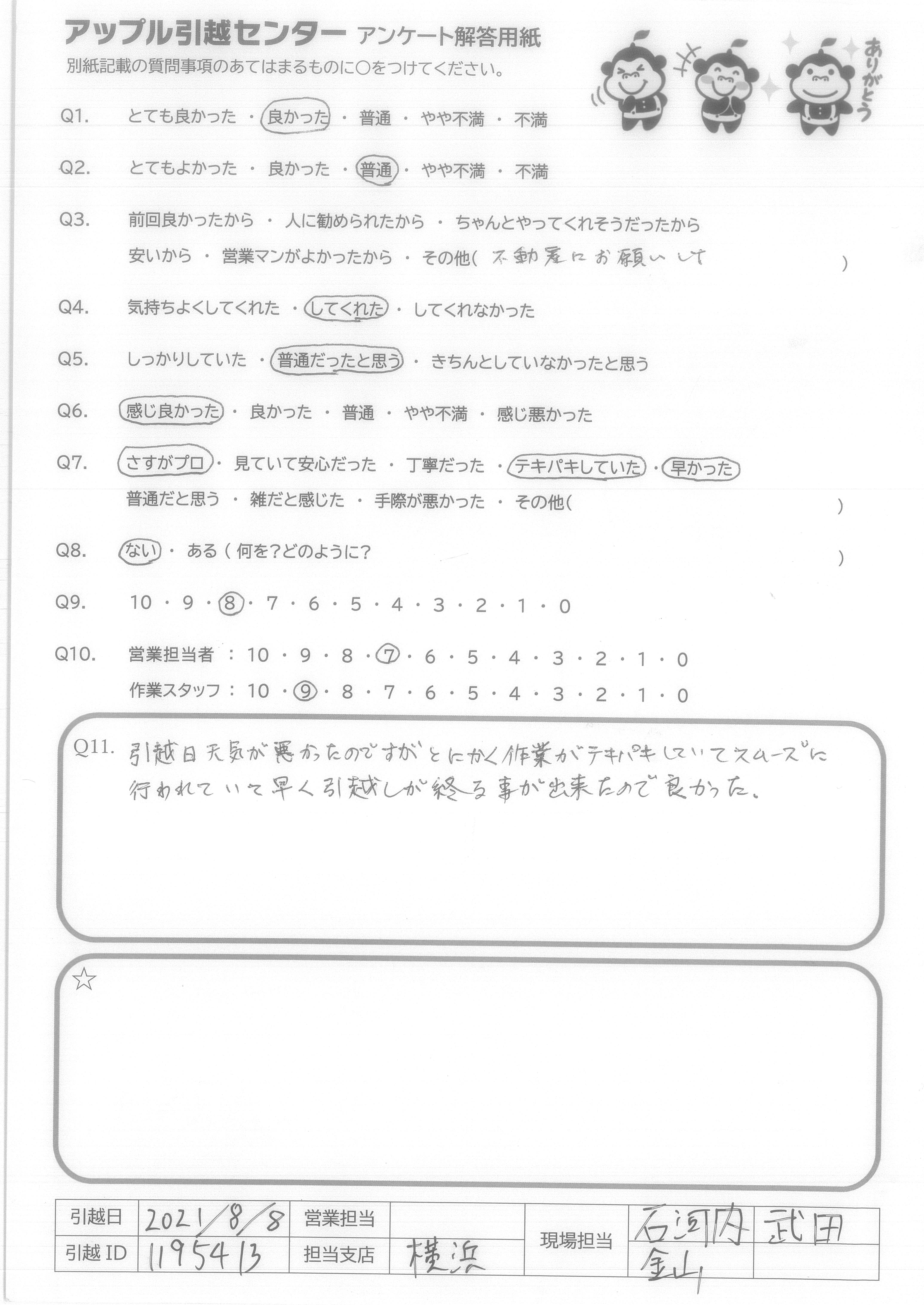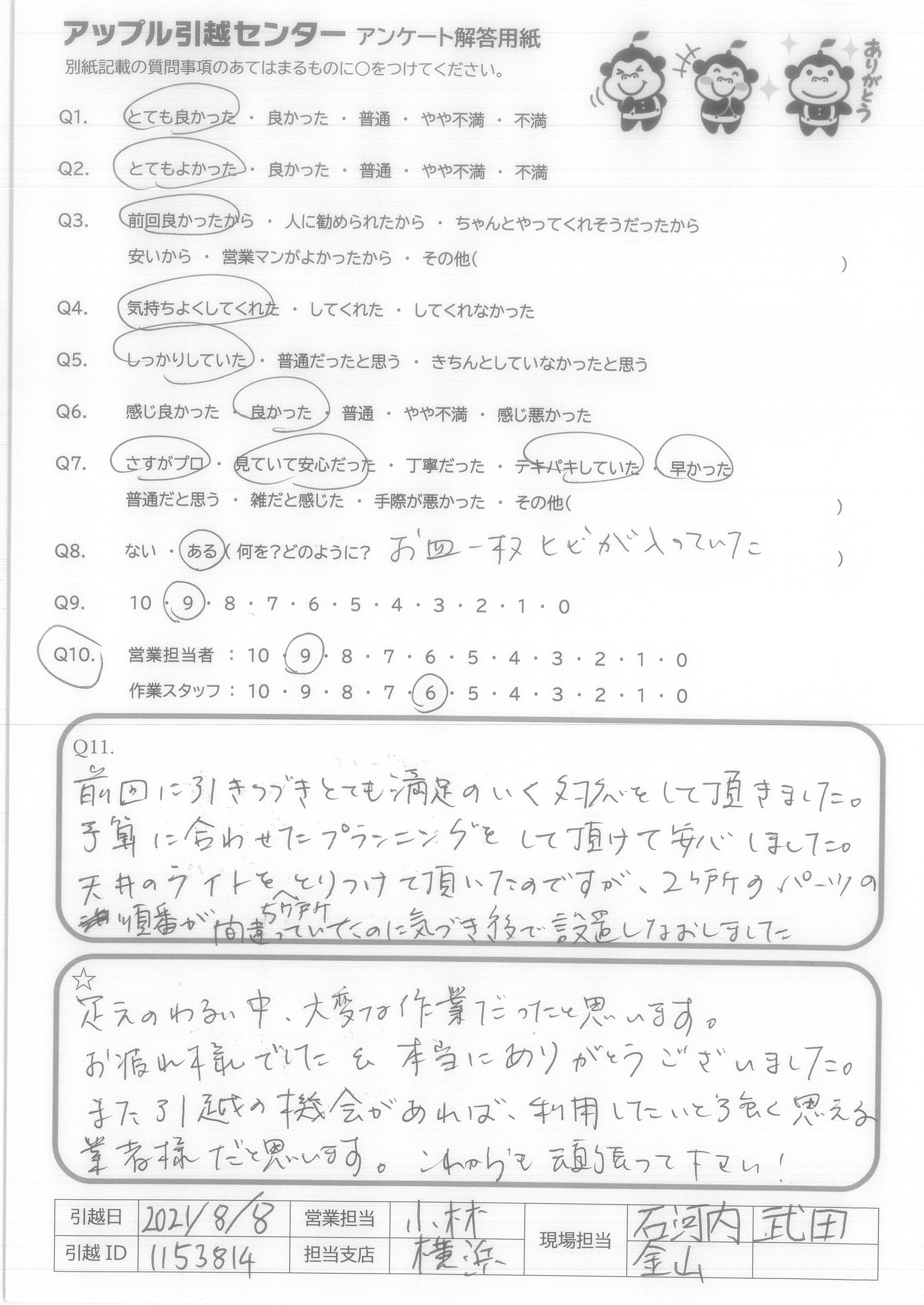 引越し日:2021年08月08日 エリア:神奈川県横浜市港北区