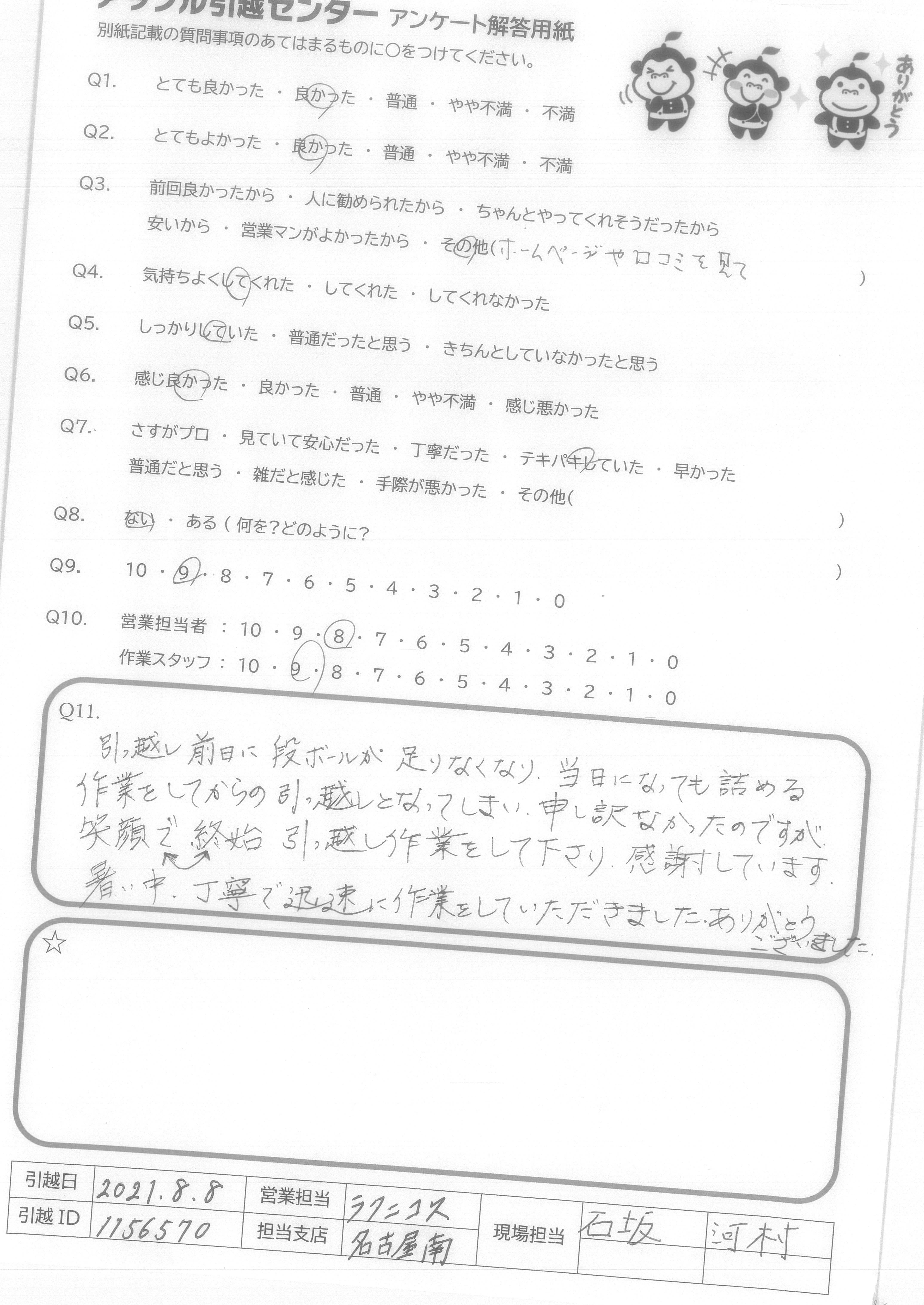 A.引っ越し前日に段ボールが足りなくなり、当日になっても詰める作業をしてからの引っ越しとなってしまい、申し訳なかったのですが、笑顔で終始引っ越し作業をして下さり、感謝しています。 暑い中、丁寧で迅速に作業をしていただきました。ありがとうございました。