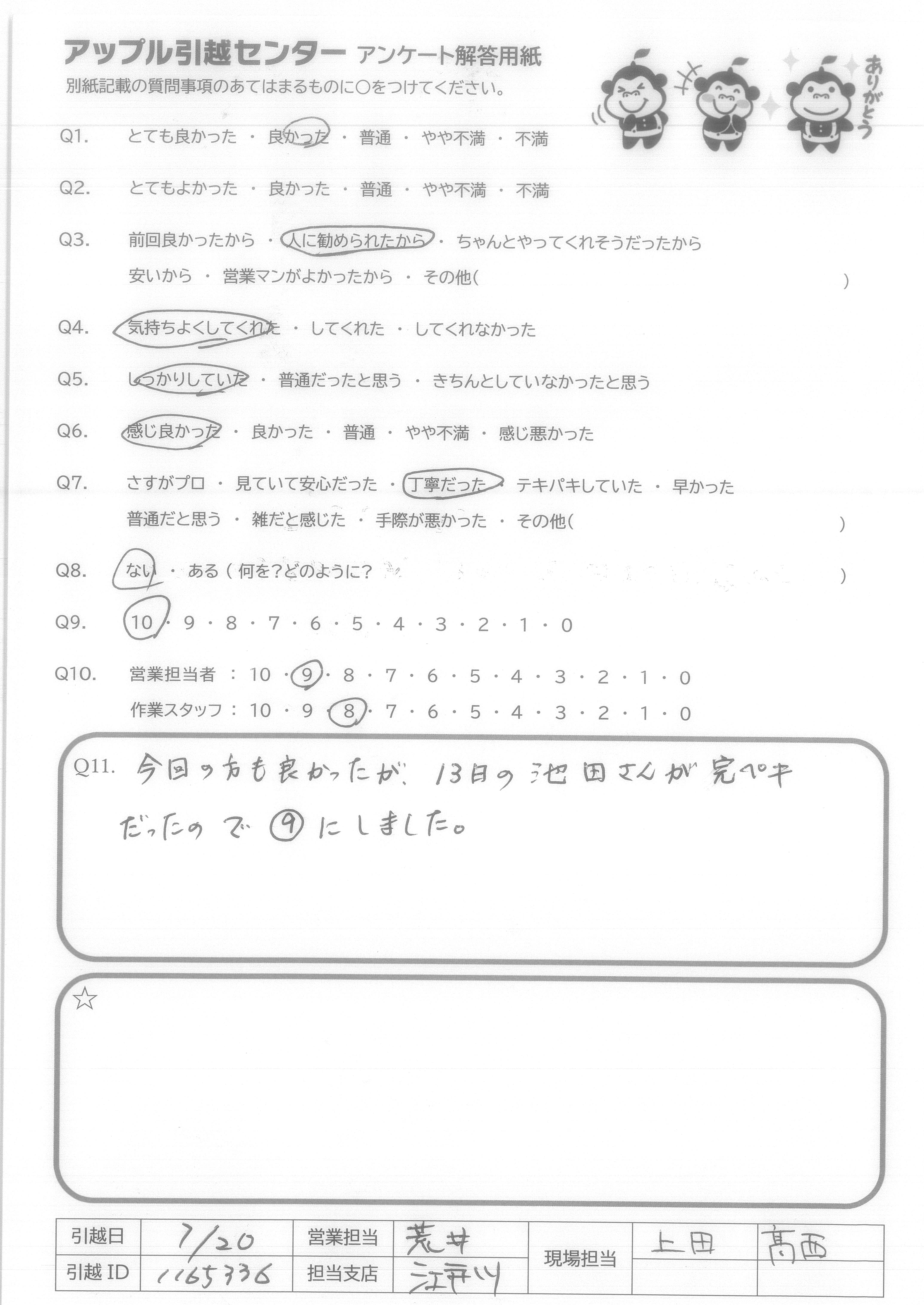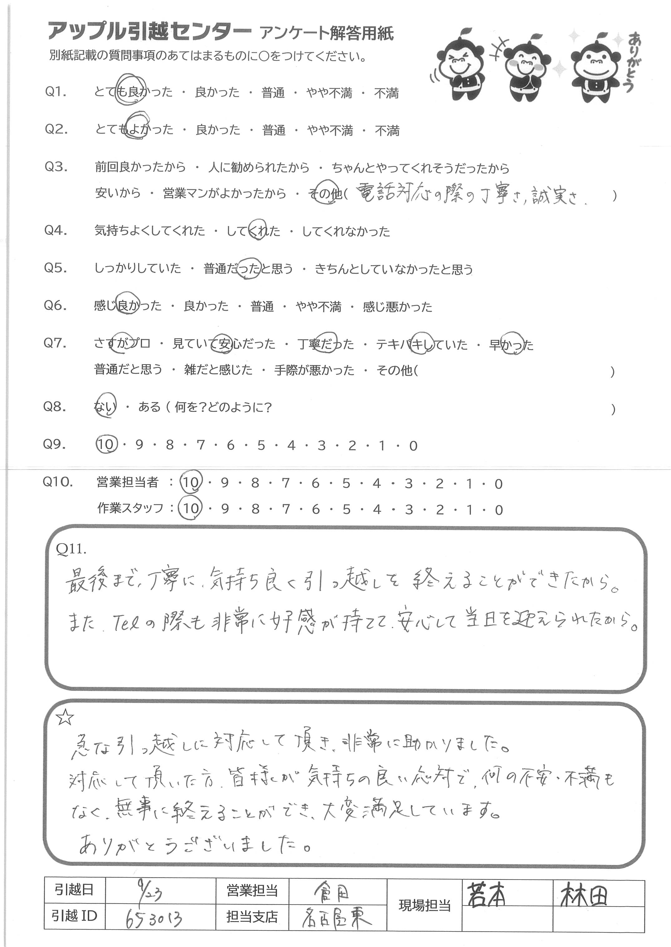 A.Q9 私としては良かったが他の人には予算や事情があるので、ただ私からは自信を持って薦められます。 Q10 スタッフの方が運べないかもしれない荷物も(ダメかもしれないけど)とにかくやってみます!とチャレンジしてくれて運んでくれた