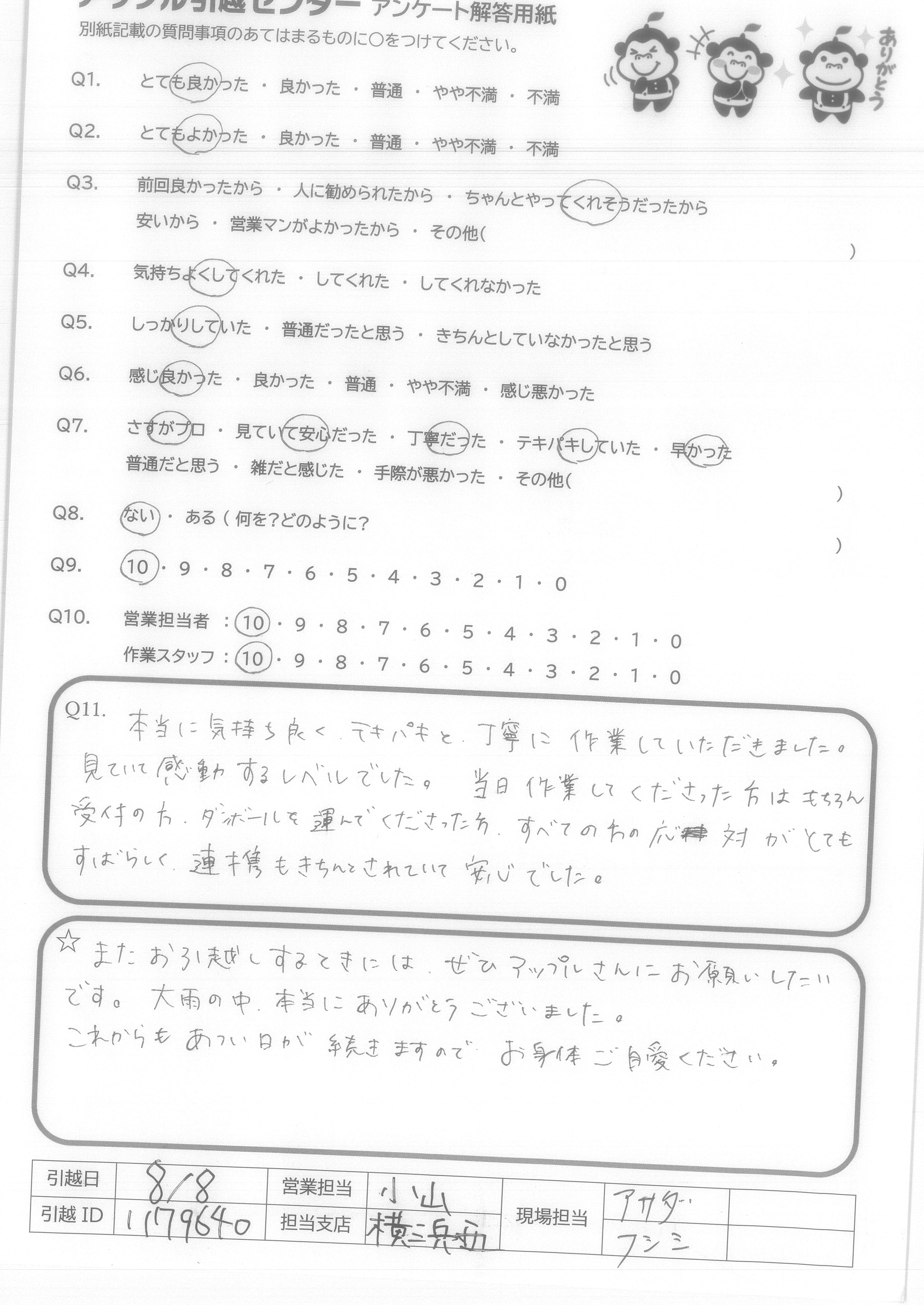 A.またお引越しするときには、ぜひアップルさんにお願いしたいです。大雨の中、本当にありがとうございました。 これからもあつい日が続きますのでお身体ご自愛ください。