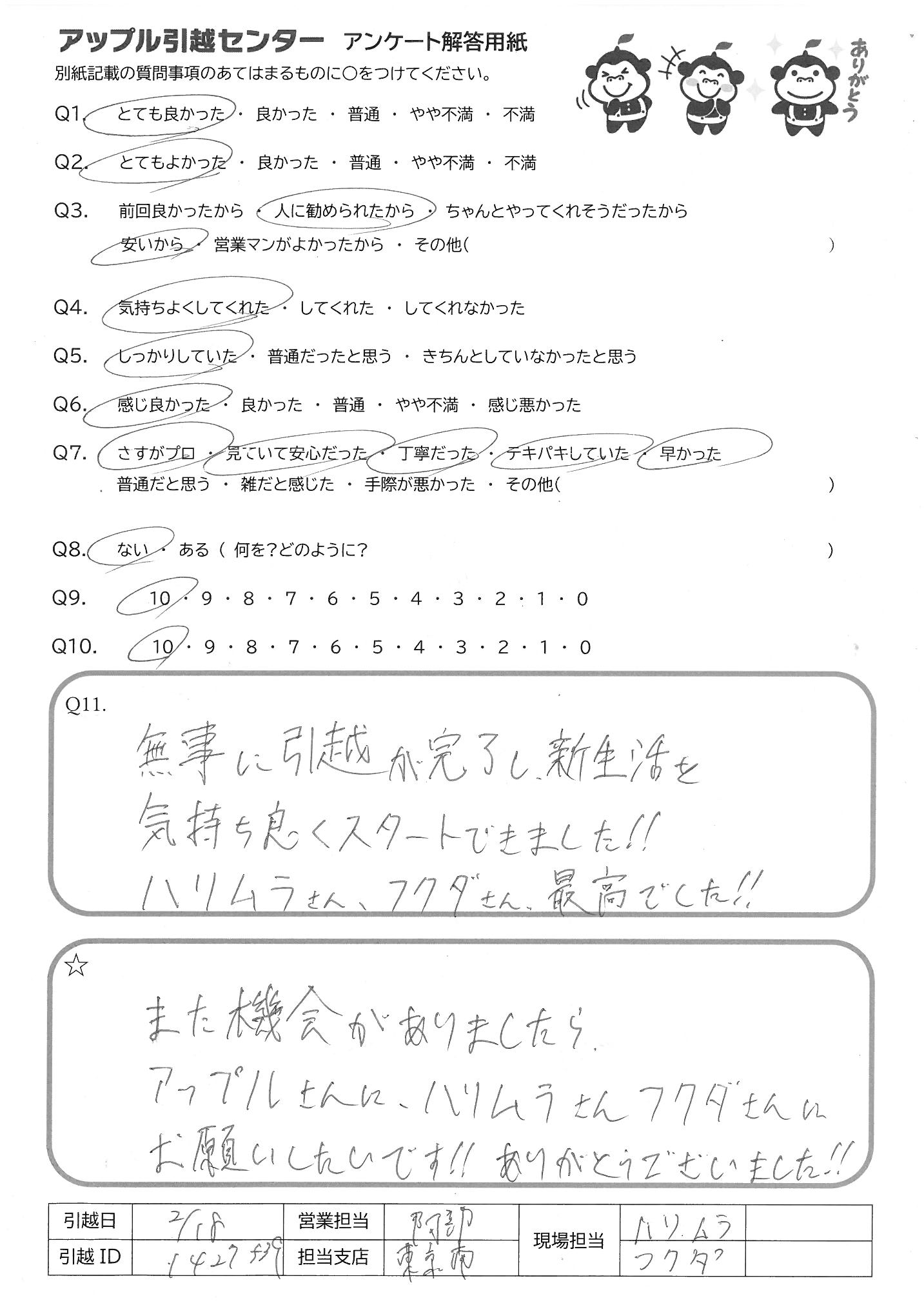 A.無地に引越が完了し新生活を 気持ち良くスタートできました!! ハリムラさん、フクダさん最高でした!!