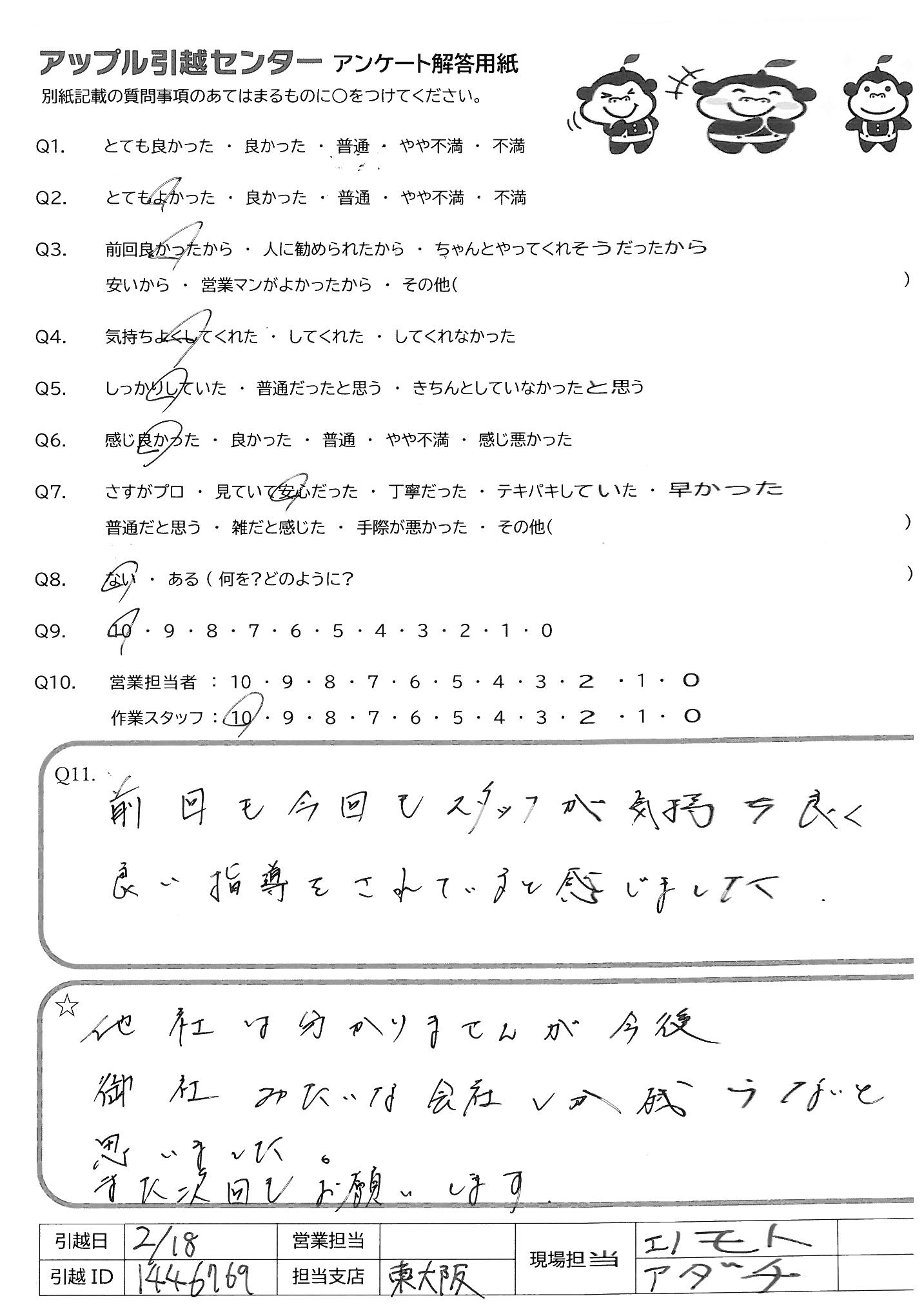 A.2回目の利用ですが、2回ともとても気持ちよく引っ越しできました。次回引っ越しする場合もお願いしたいと思います。