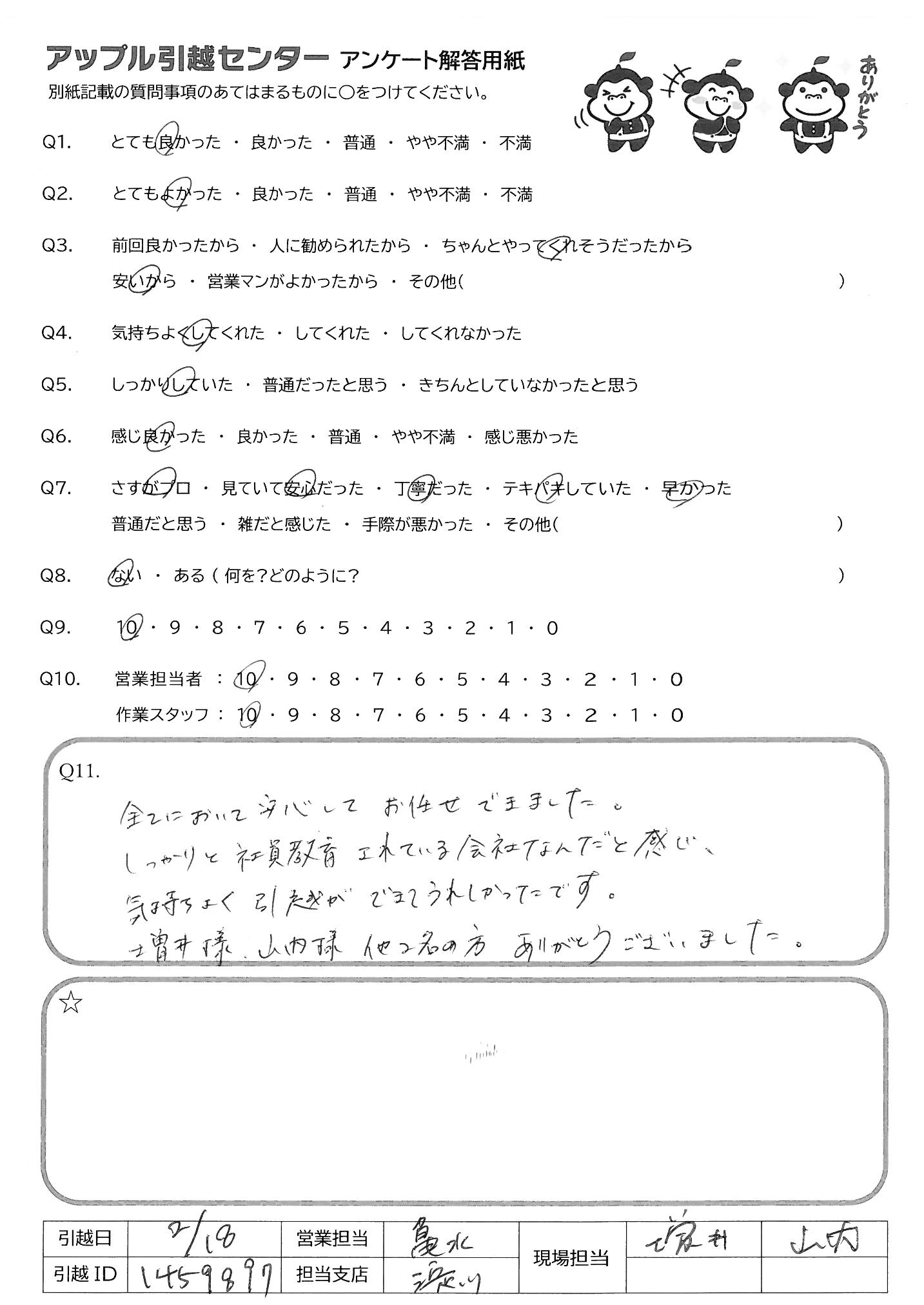 A.全てにおいて安心してお任せできました しっかりと社員教育されている会社なんだと感じ 気持ちよく引越ができてうれしかったです 増井様、山内様 他2名の方、ありがとうございました