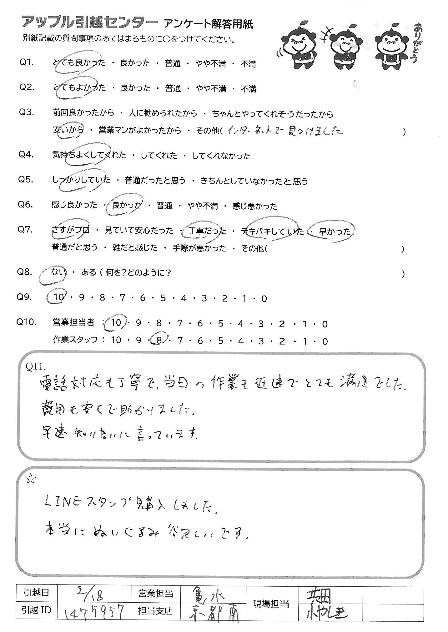 A.ネット見積もりの担当者が当日変わった様だけど、その分仕事が早く、分からない事も端的に教えて下さり感謝です。 当日までの質問などにも迅速に対応してくれて、不安がなくなりました。 引越し担当の方は、スタッフ間がお互いを思いやって作業していてとても見ていて気持ちよかったです。 事務的な手続きもスムーズで、遅めの時間になりましたが滞りなく終えてくれたのがありがたかったです。