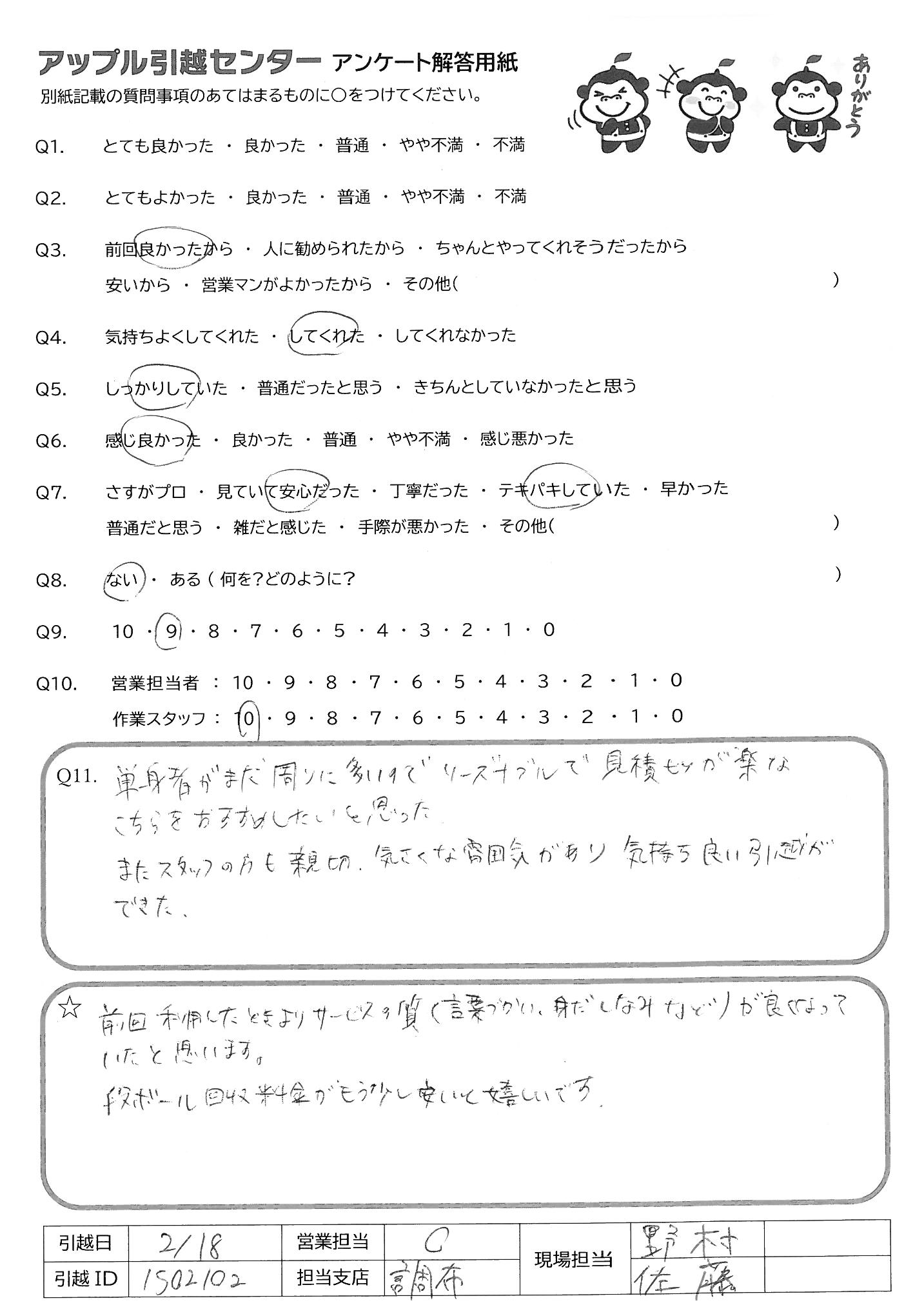 A.丁寧に対応して頂き、安心して引っこしすることができました テキパキ作業して頂き、話し方、好印象でよかったです