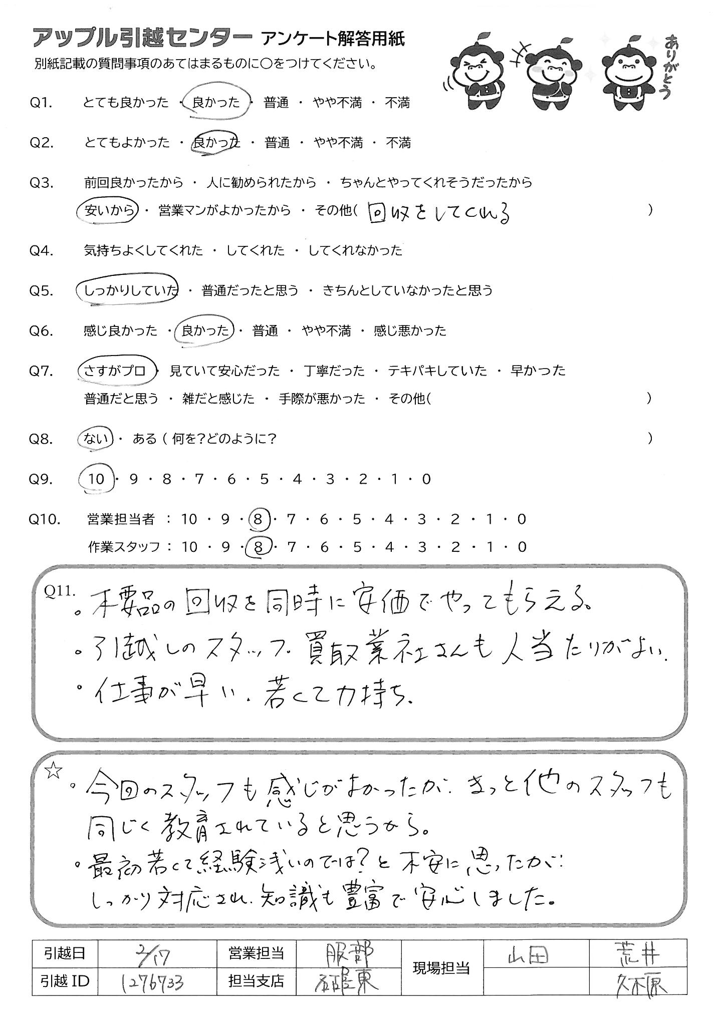 A.・不要品の回収を同時に安価でやってもらえる ・引越しのスタッフ・買取業者さんも人当たりがよい 仕事が早い、若くて力持ち