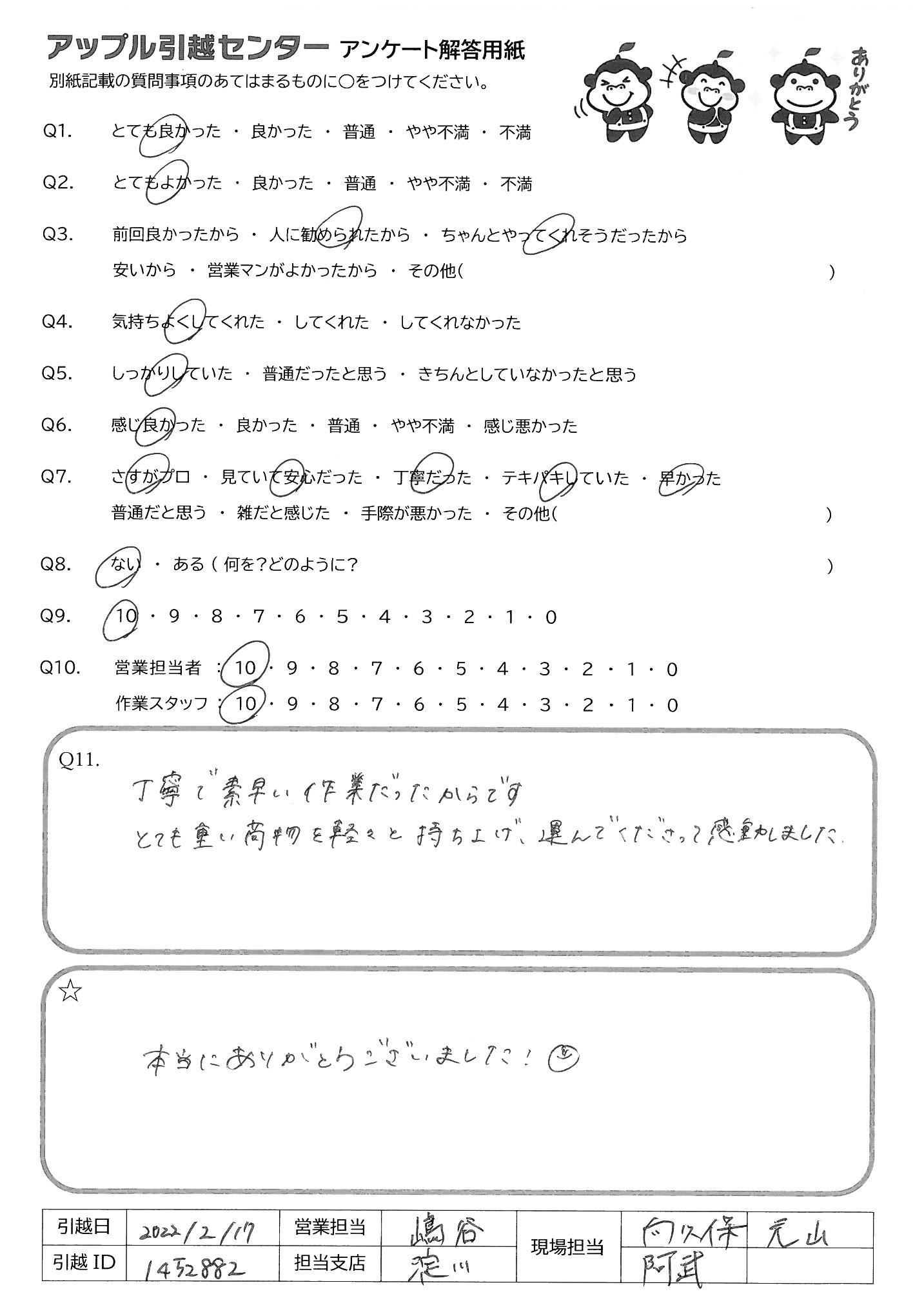 A.引っ越し先が階段でかなりしんどかったと思いますが、嫌な顔など一瞬も見せずに頑張ってくださいました。 感じもすごく良くて感謝しています。 ありがとうございました。