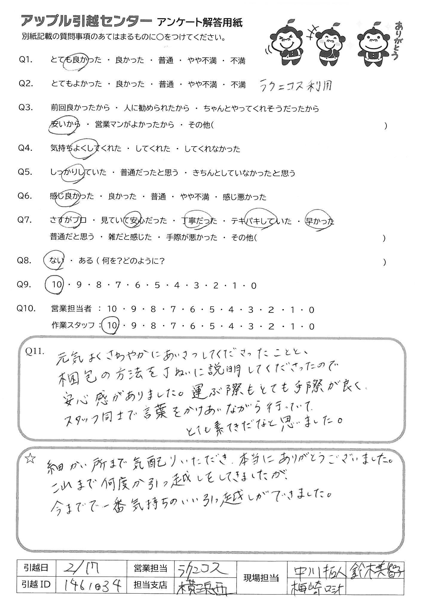 A.友人の勧めで今回のアップル引越し業者さんを利用させていただきました。 友人から安いのにとっても親切でしつこい営業もなく引越しできるからお勧めとの事で利用致しました。 今までも他社で3回ほど引越しをしてきましたが、今までは営業の電話がしつこかったり担当の方の対応が悪かったり、家具を壊されたりと引越しであまり良いと感じた業者はありませんでした。 しかしアップル引越し業者さんはお電話の案内も丁寧ですし、無駄な営業はなく、 無料オプションも沢山ありこの家具の量でこんなに安くてよいのかと思ってしまうほどの料金でした。 当日の引越し担当してくだたった方もとても親切で感じの良い方で安心しました。 指名できるのであれば次もお願いしたいと思いました! 今後引っ越しをする際は是非アップルさんでお願いしたいです!! この度はありがとうございました♪
