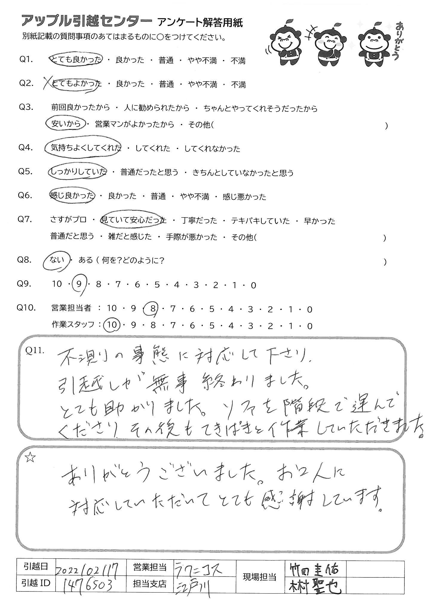 A.不測の事態に対応して下さり 引越しが無事に終わりました とても助かりました。ソファを階段で運んで くださりその後もてきぱきと作業していただきました。