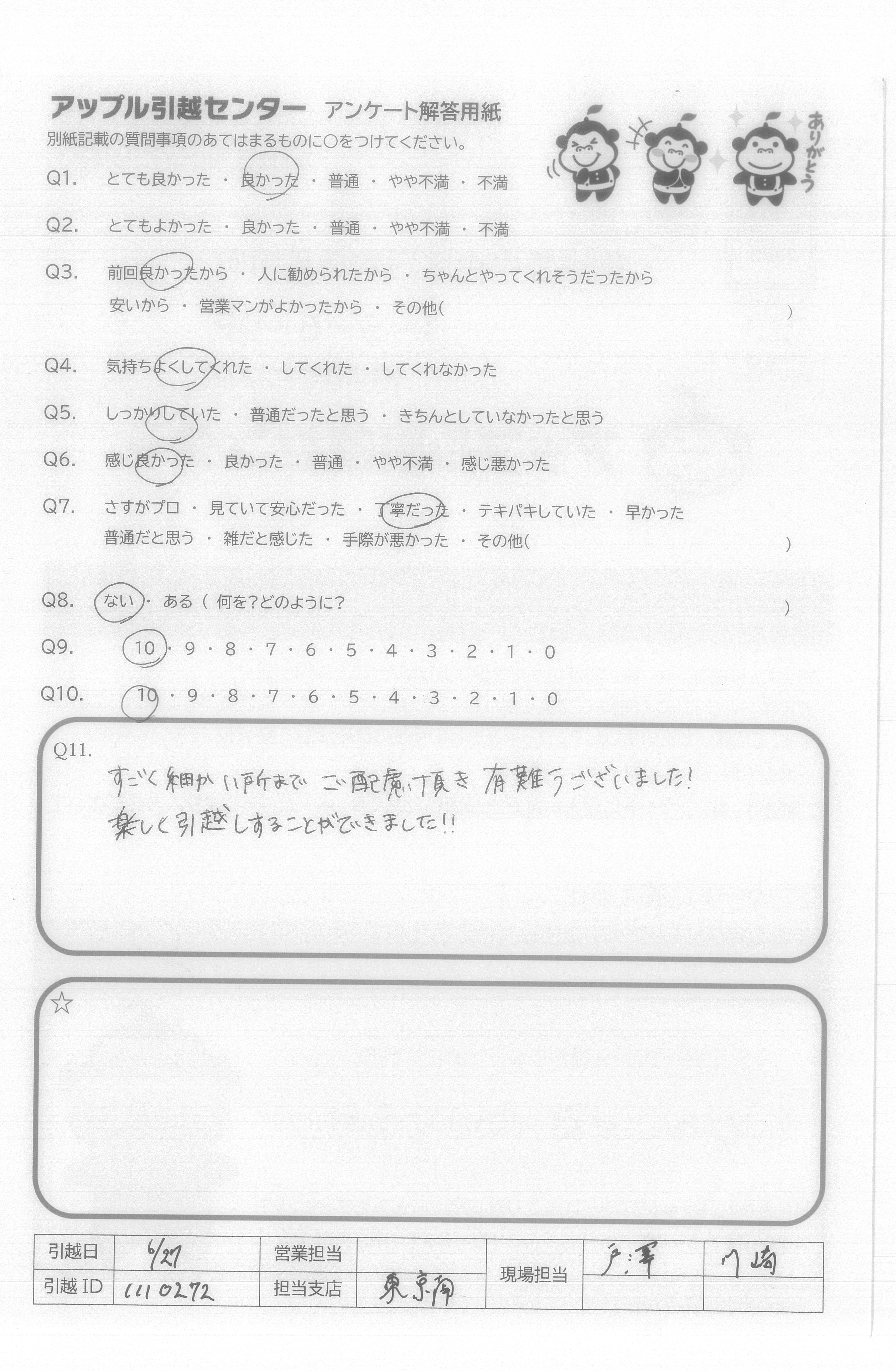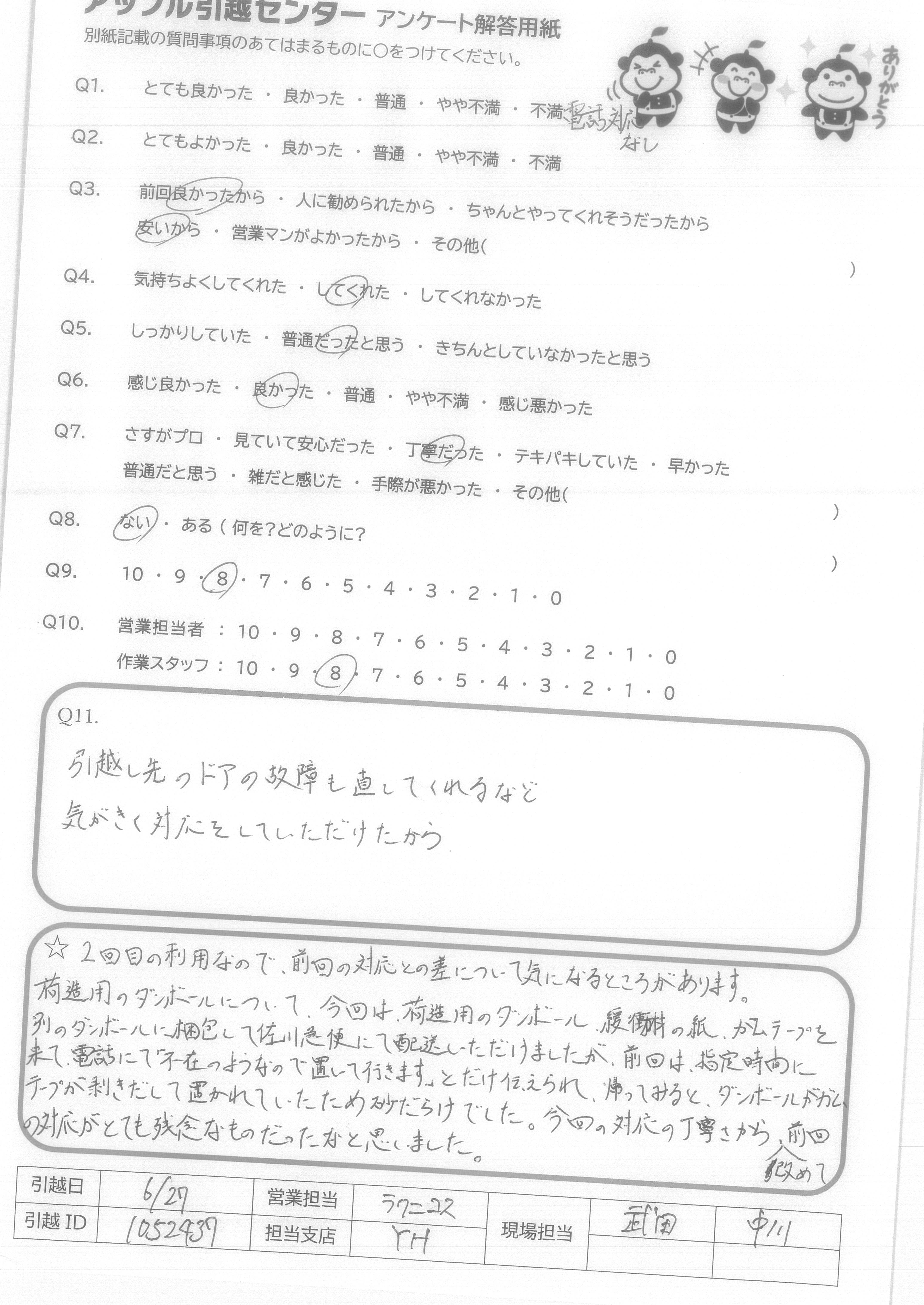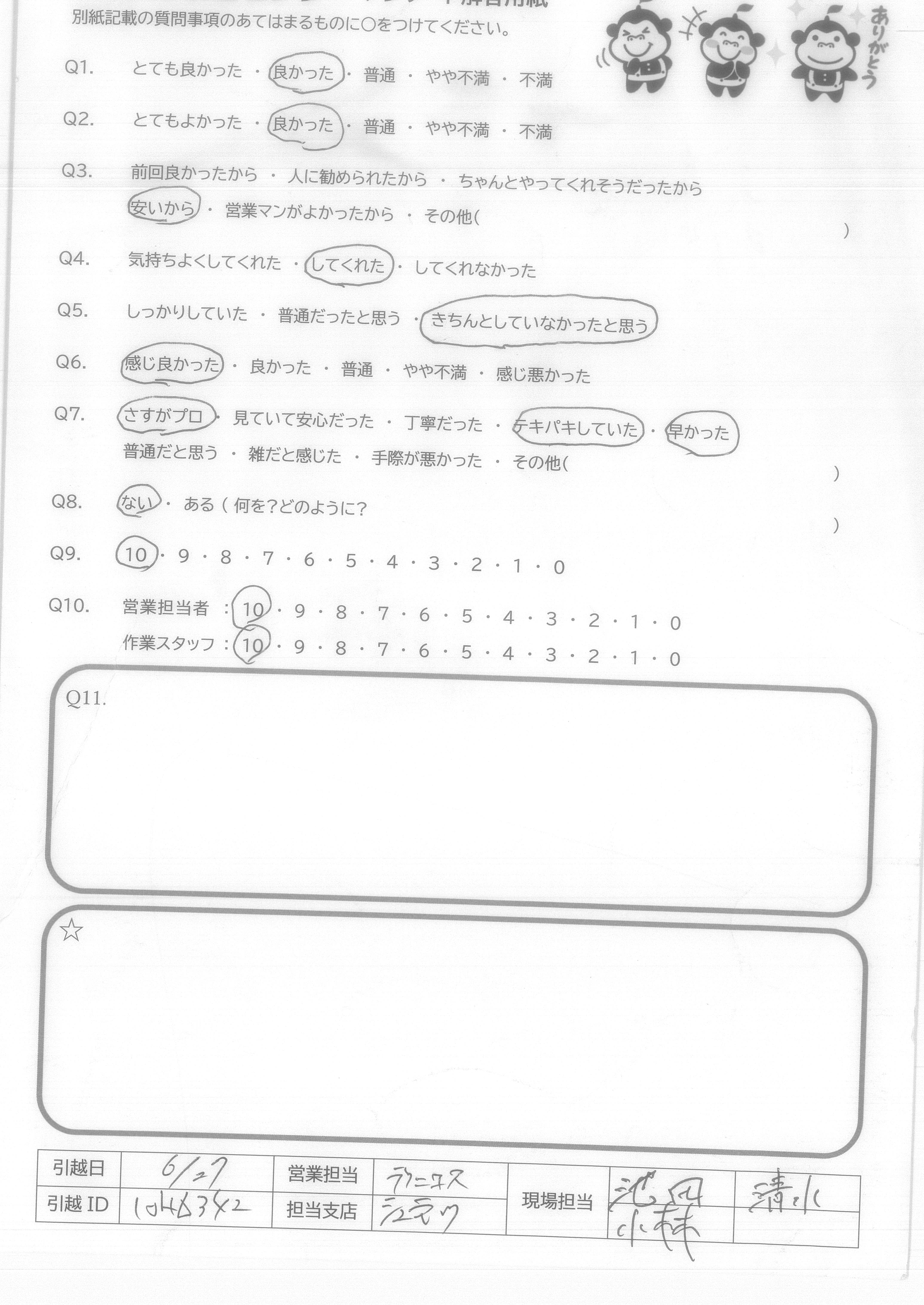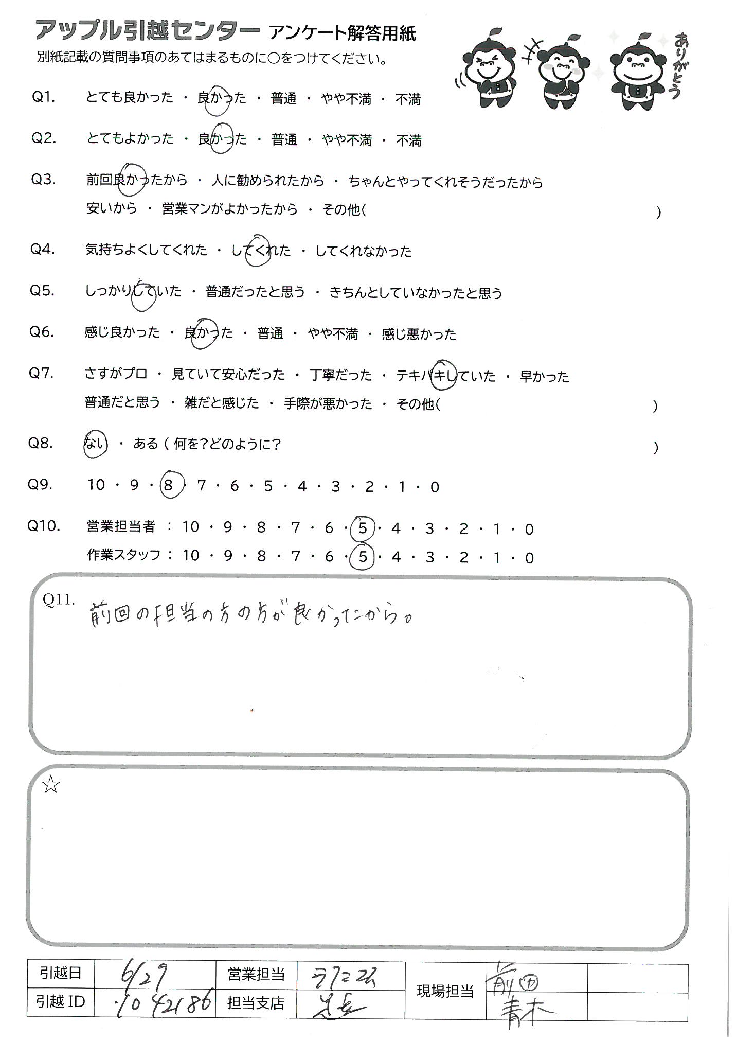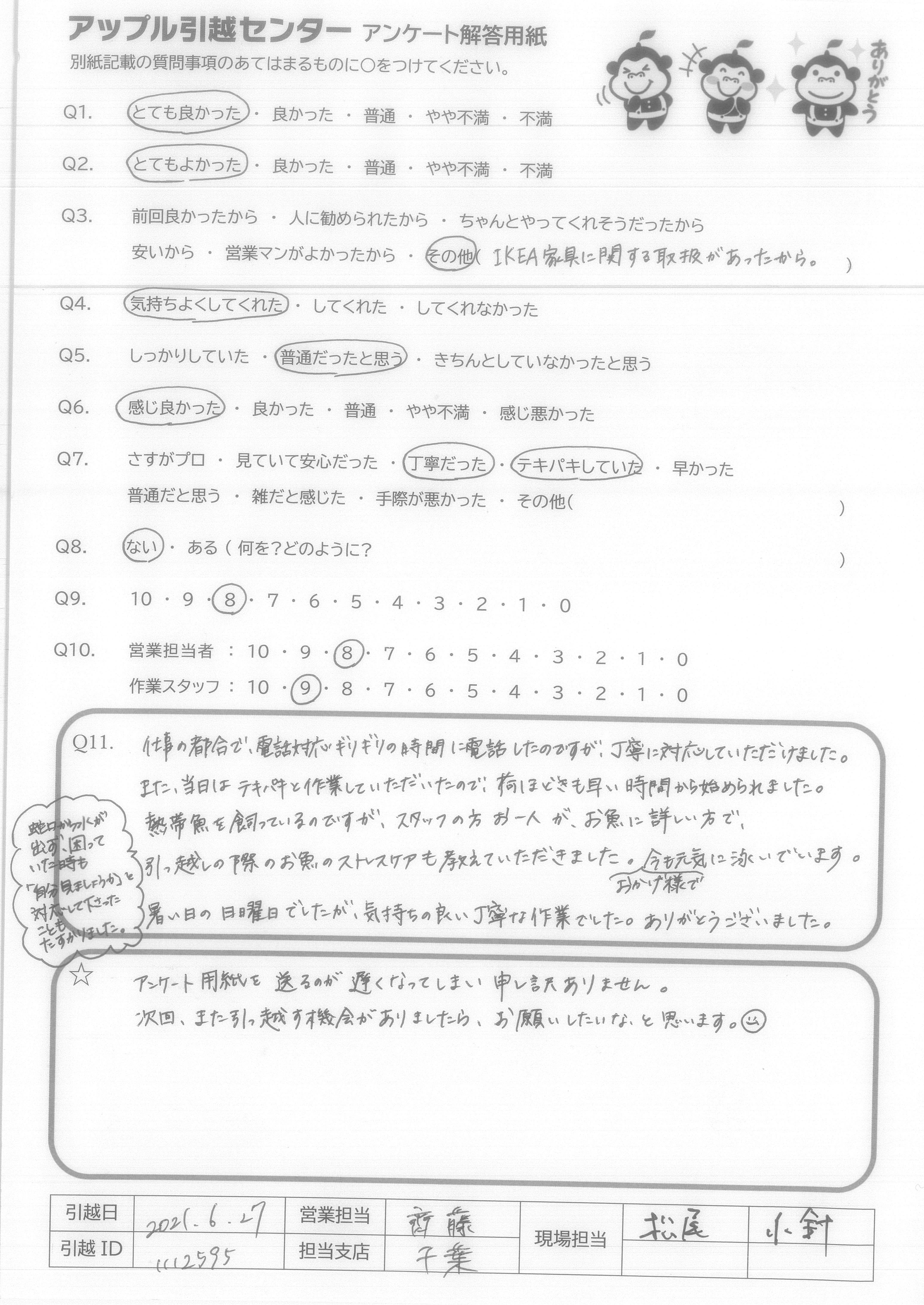 A.アンケート用紙を送るのが遅くなってしまい申し訳ありません。 次回、また引っ越す機会がありましたら、お願いしたいなと思います。