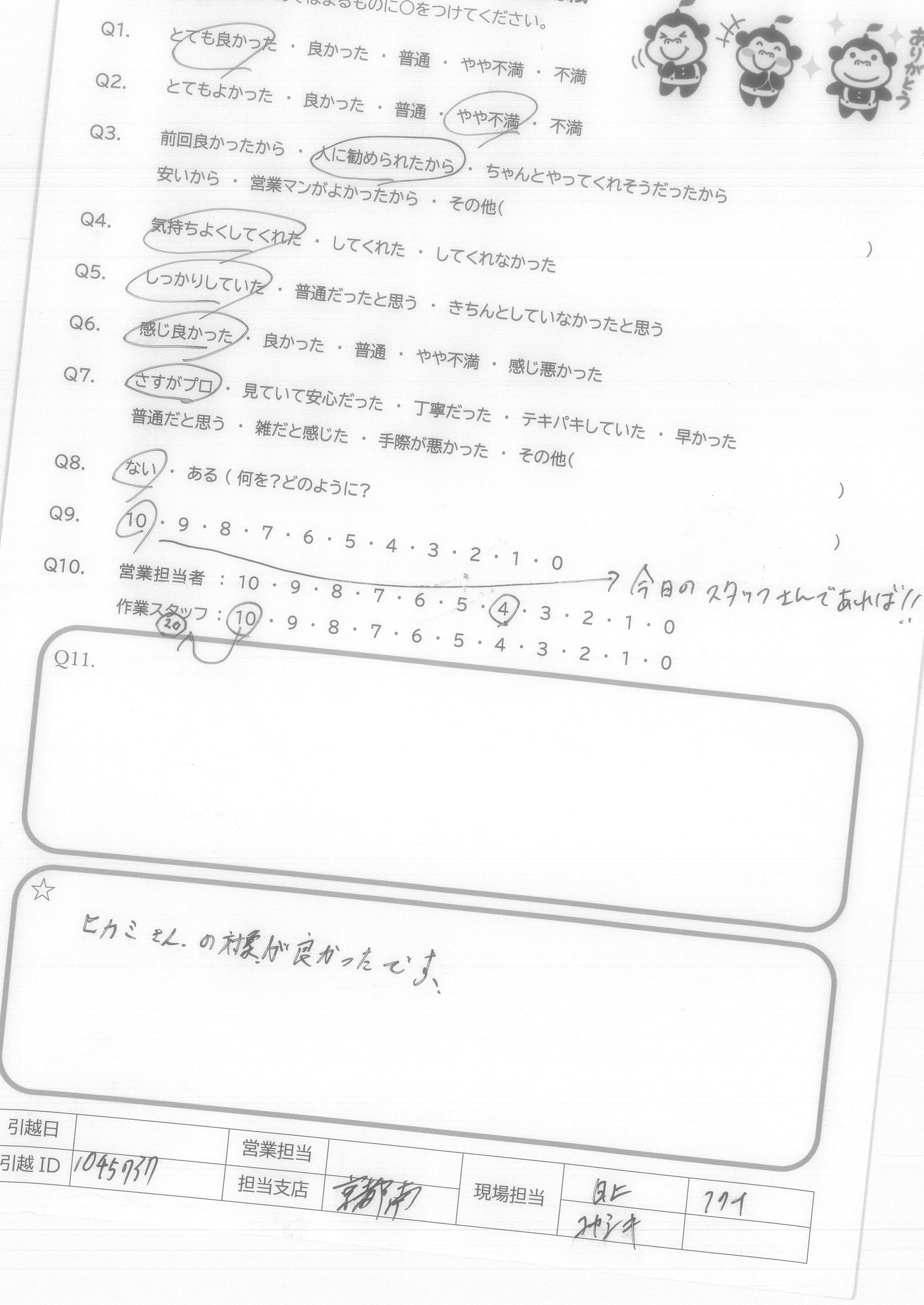 A.9 大手がいいと言う人もいると思うので、そういう人にはすすめない。だけど、世間話程度には出すと思う。 10 他社と違って、料金が分かりやすいのがとてもいい。作業スタッフさんもよかったのですすめたい。