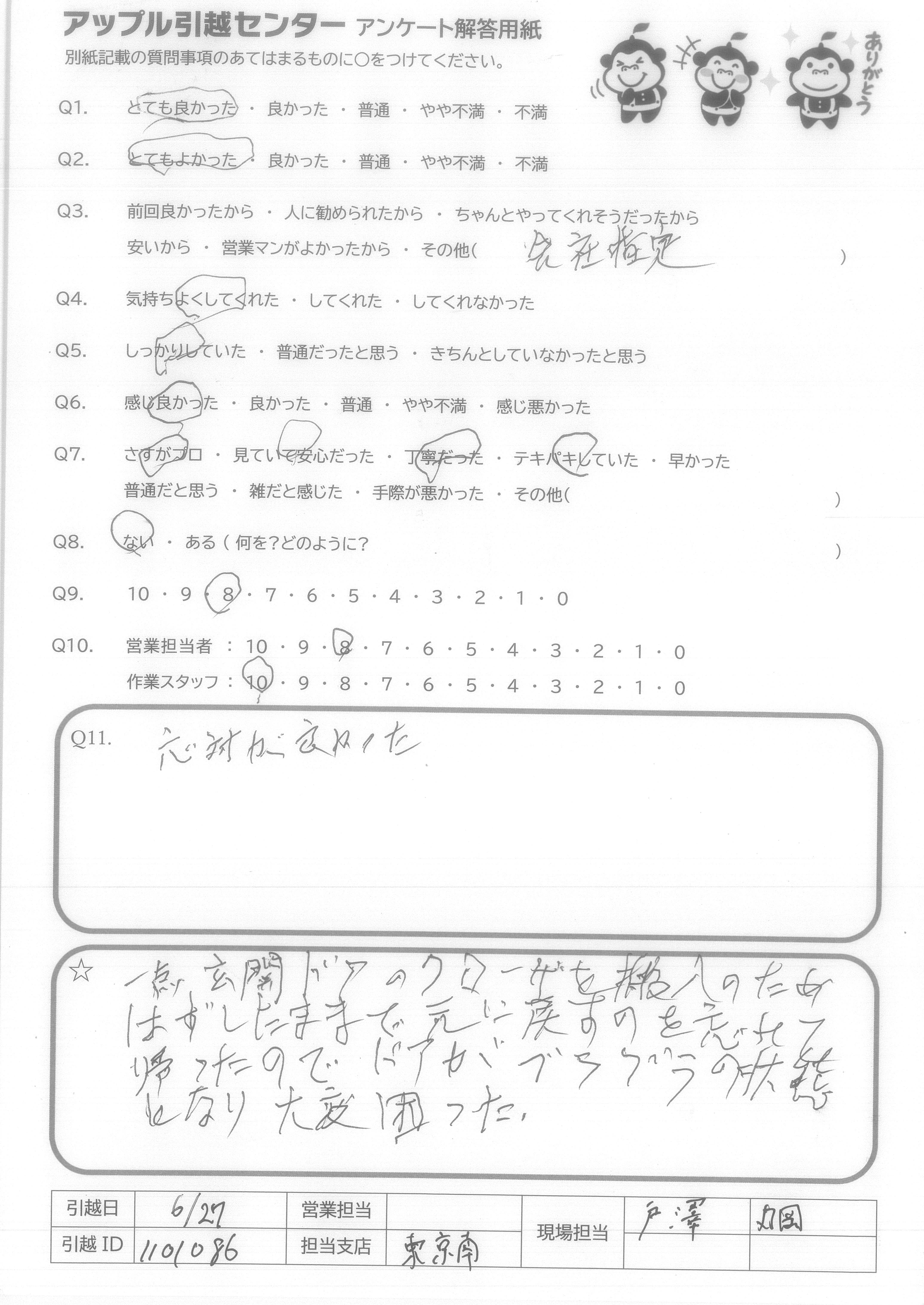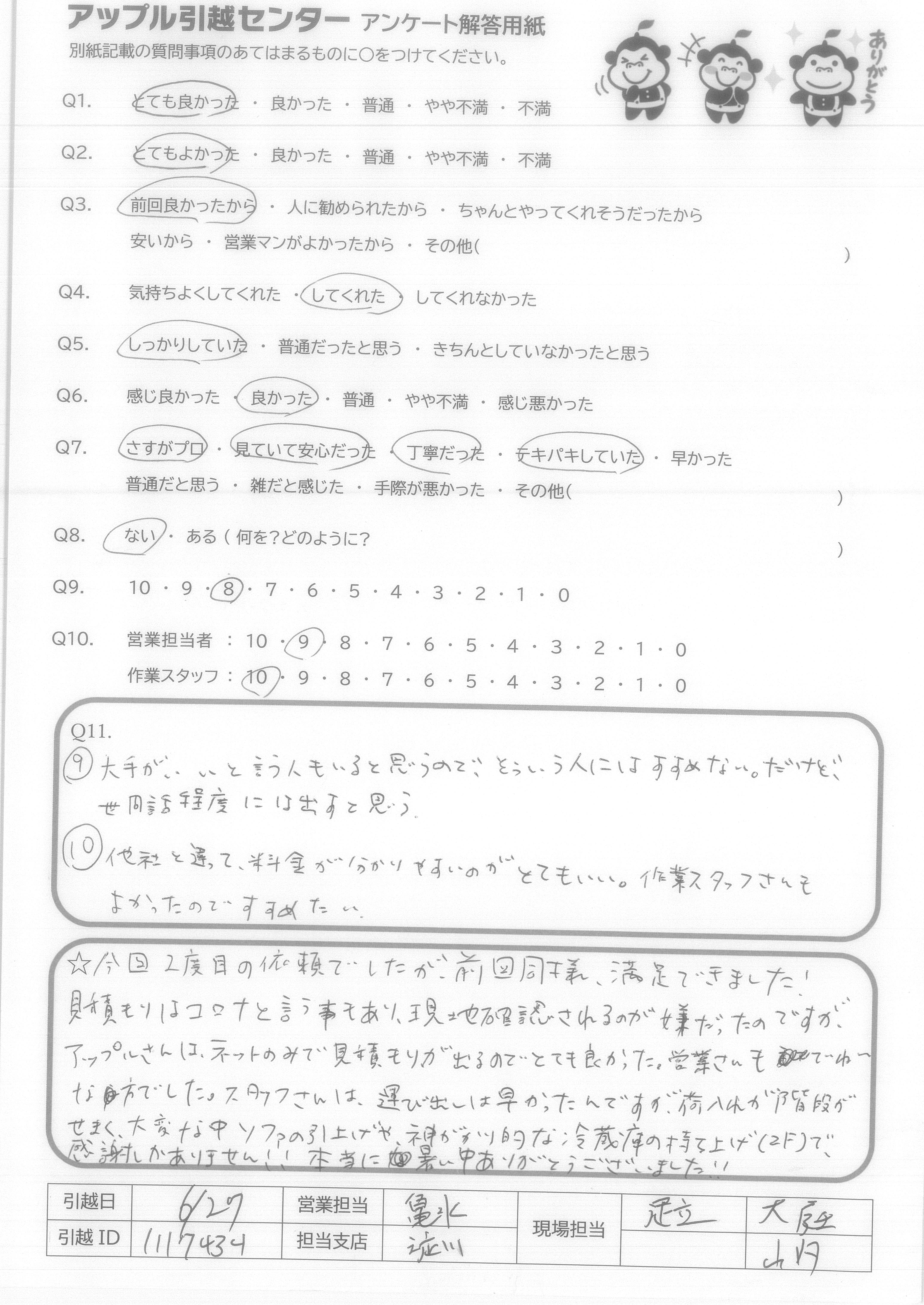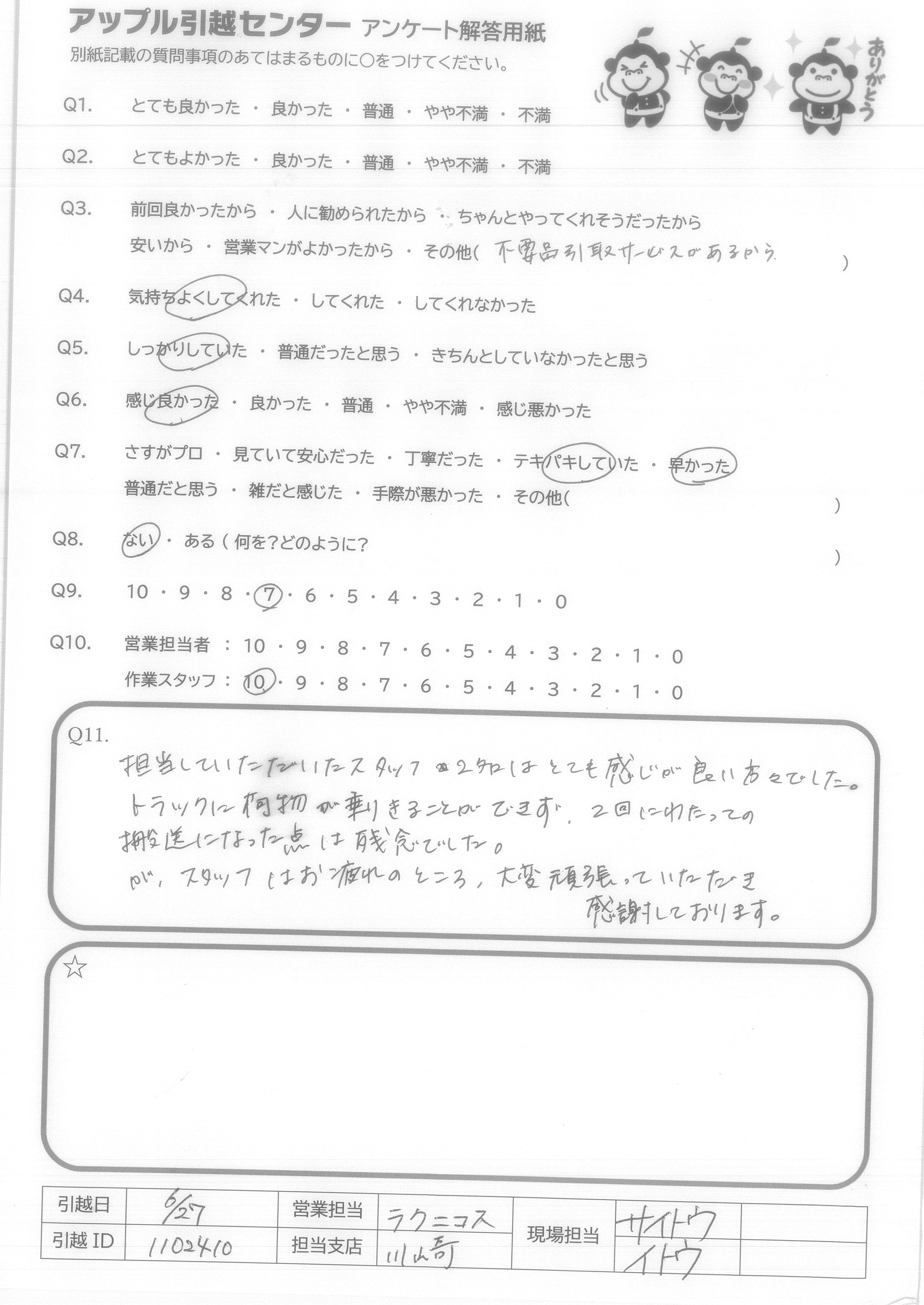 A.今回2度目の依頼でしたが、前回同様満足できました! 見積もりはコロナと言う事もあり、現地確認されるのが嫌だったのですが、アップルさんは元ネットのみで見積もりが出るのでとても良かった。営業さんもていねいな方でした。スタッフさんは、運び出しは早かったんですが、荷入れが階段がせまく、大変な中ソファの引上げや神がかり的な冷蔵庫の持ち上げ(2F)で、感謝しかありません!!本当に暑い中ありがとうございました!!!
