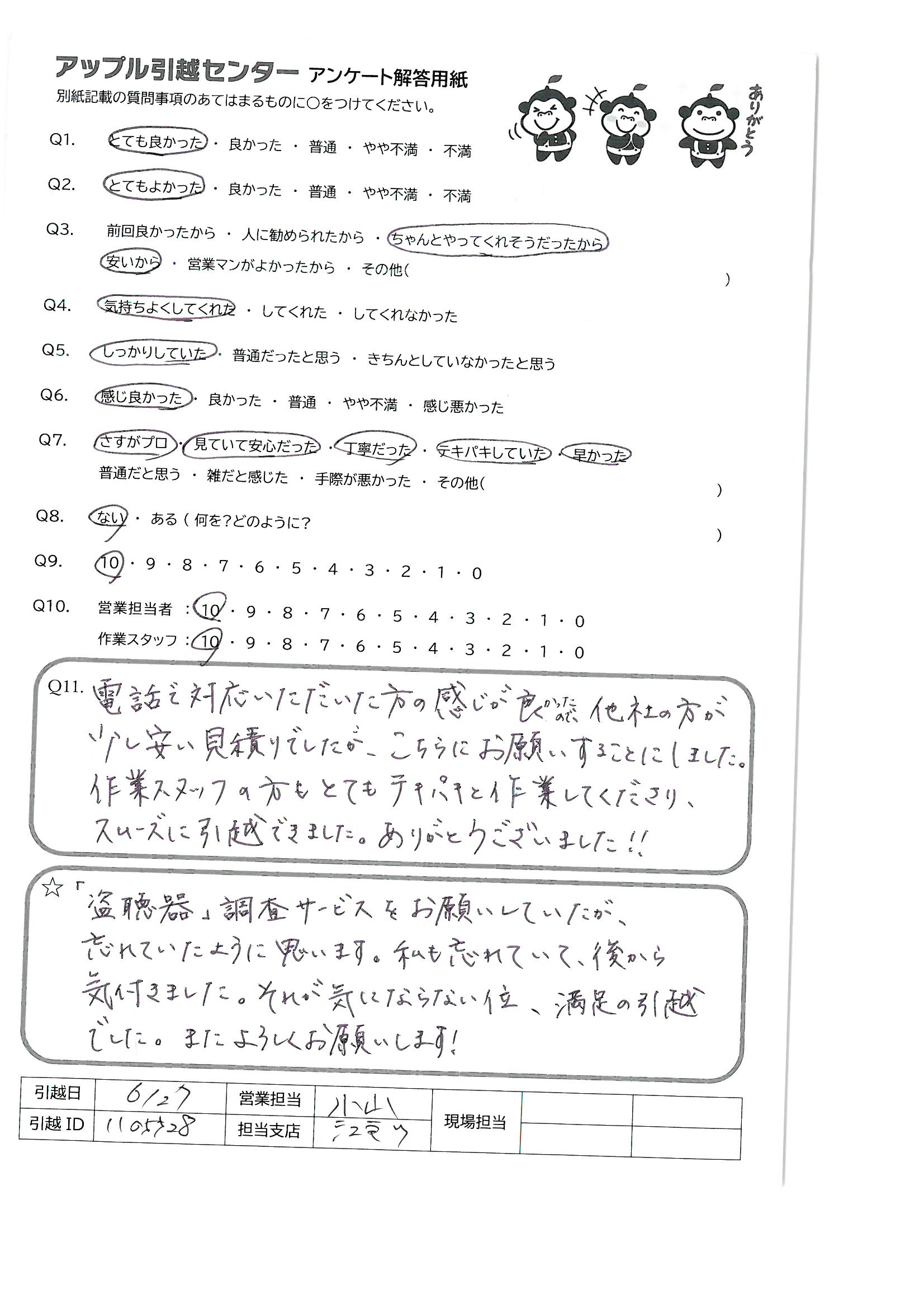 A.「盗聴器」調査サービスをお願いしていたが、忘れていたように思います。私も忘れていて、後から気づきました。それが気にならない位、満足の引越でした。またよろしくお願いします!!
