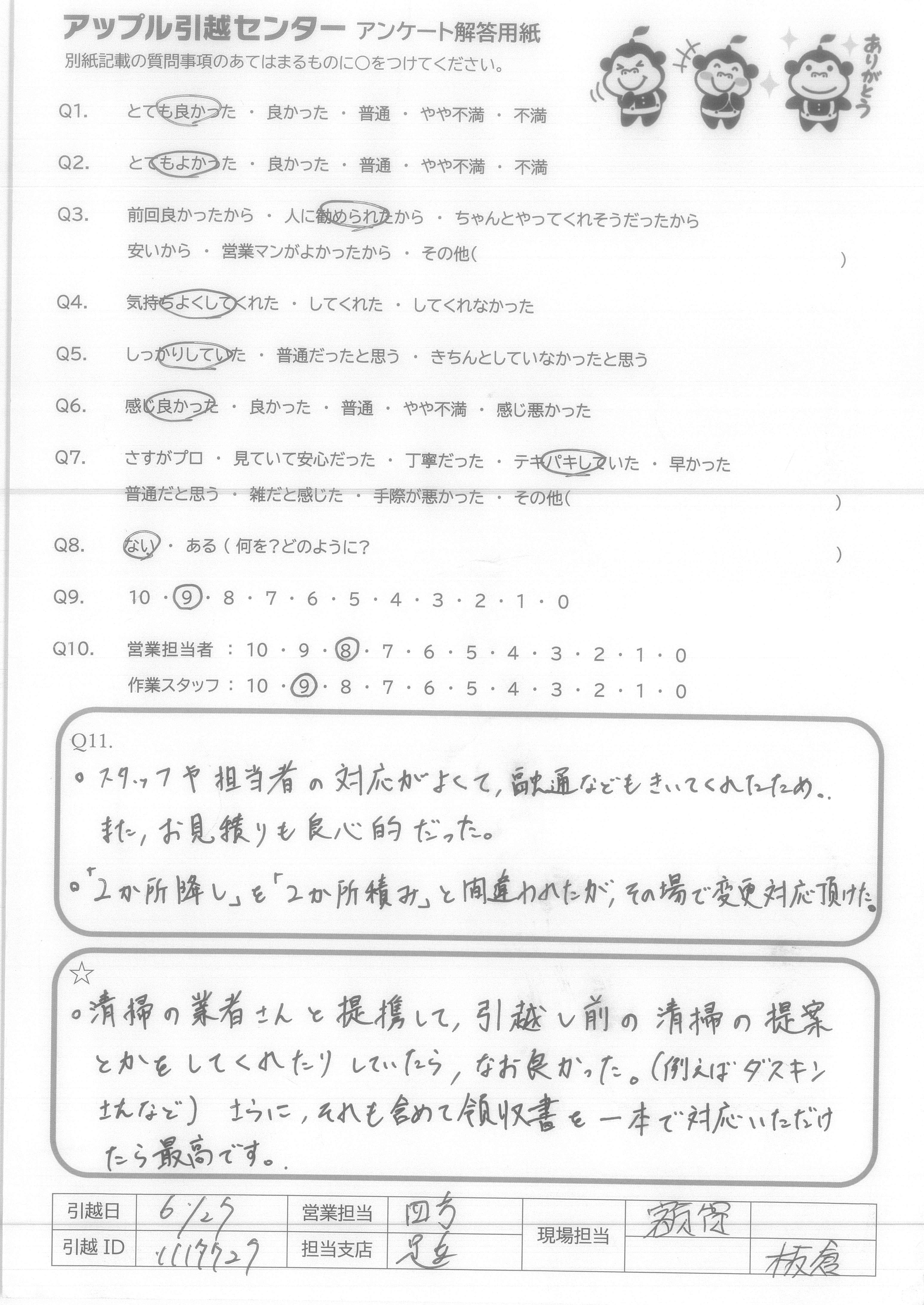 A.・清掃の業者さんと提携して、引越し前の清掃の提案とかをしてくれたりしていたら、なお良かった。(例えばダスキンされなど)さらに、それも含めて領収書を一本で対応いただけたら最高です。