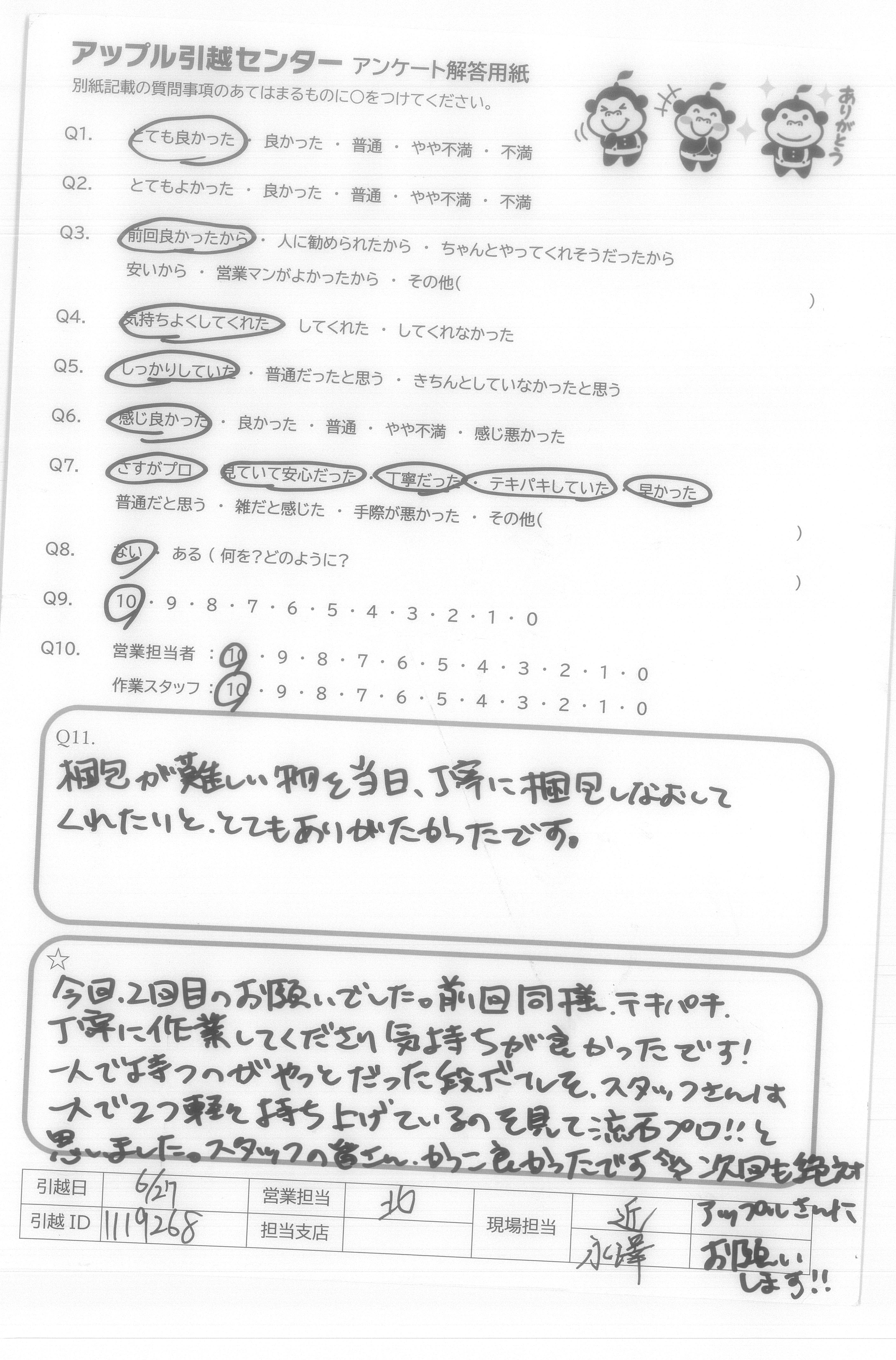 A.今回、2回目のお願いでした。前回同様、テキパキ、丁寧に作業してくださり気持ちが良かったです! 一人で持つのがやっとだった段ボールを、スタッフさんは一人で2つ軽々持ち上げているのを見て流石プロ!!と思いました。スタッフの皆さん、かっこ良かったです!次回も絶対アップルさんにお願いします!!